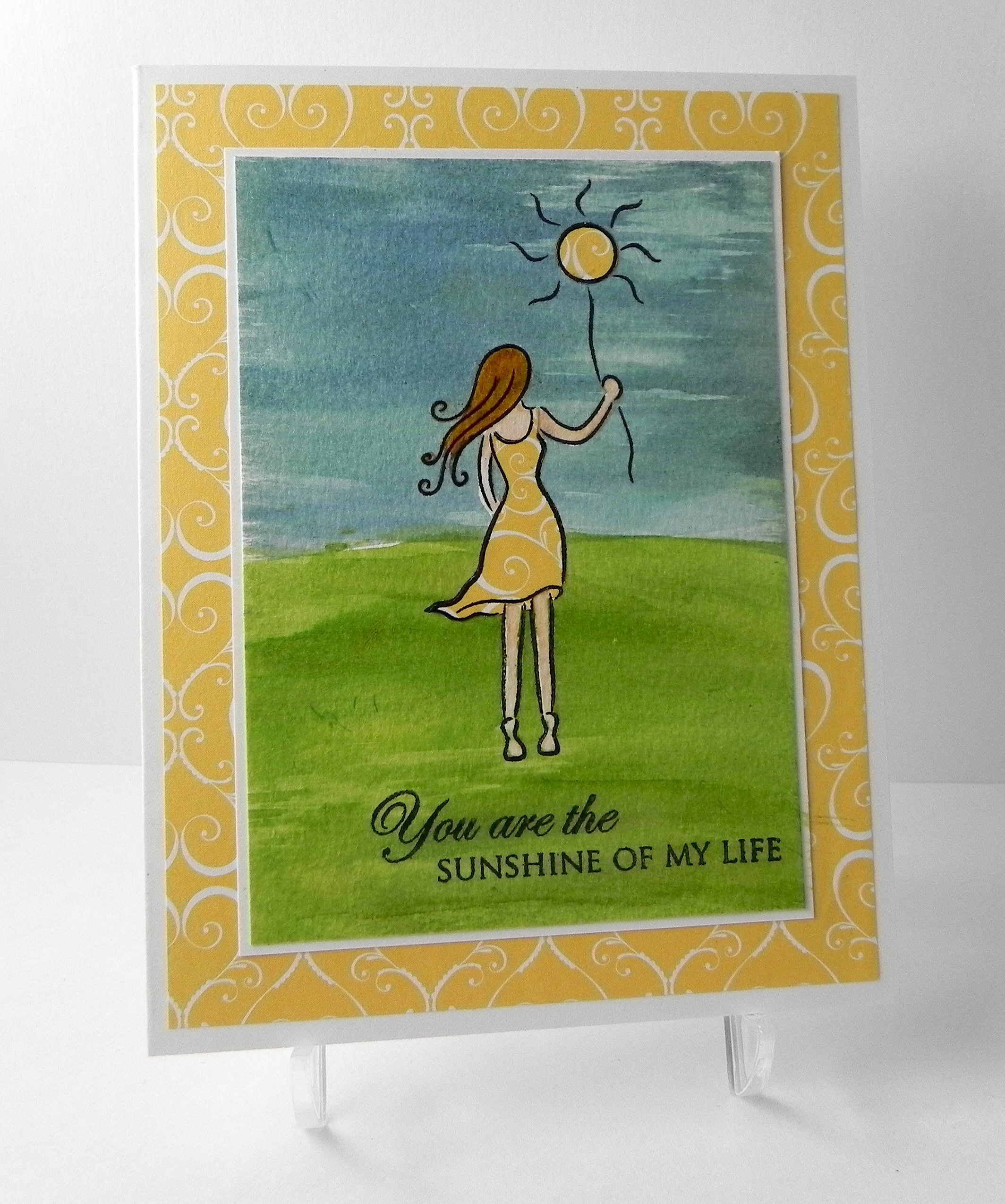 After my background was watercolored, the frisket mask was rubbed off with a rubber cement eraser (or you can use your finger). I colored the image using Tim Holtz distress markers: tattered rose (for her skin) and vintage photo, tea dye, wild honey, and mustard seed (for her hair). I tried to blend these hair colors and discovered it is next to impossible to blend markers on watercolor paper! After coloring, I paper pieced her dress and the sun balloon with the same yellow paper I used for my mat.