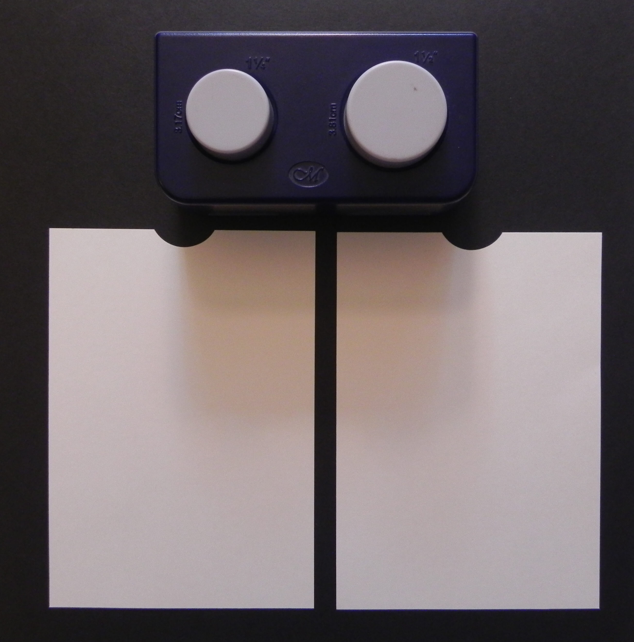 3. With circle punch, cut a semi-circle in the center of the top of one of the panels from step 2. Line up the 2 panels, trace the semicircle onto the 2nd sheet, and punch again. You need these to line up perfectly with each other. If your punch can go through 2 sheets at once, you can just cut them together.