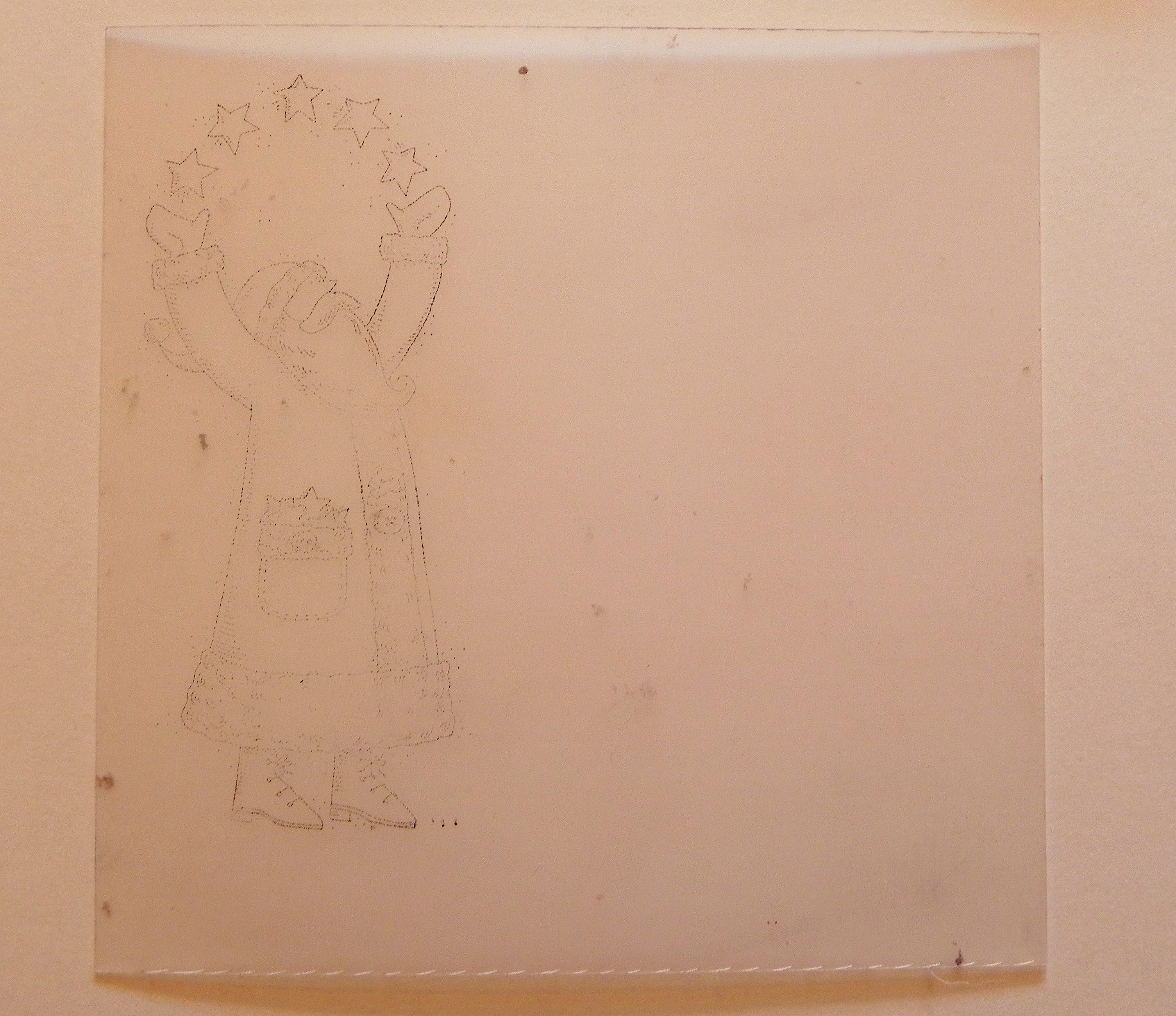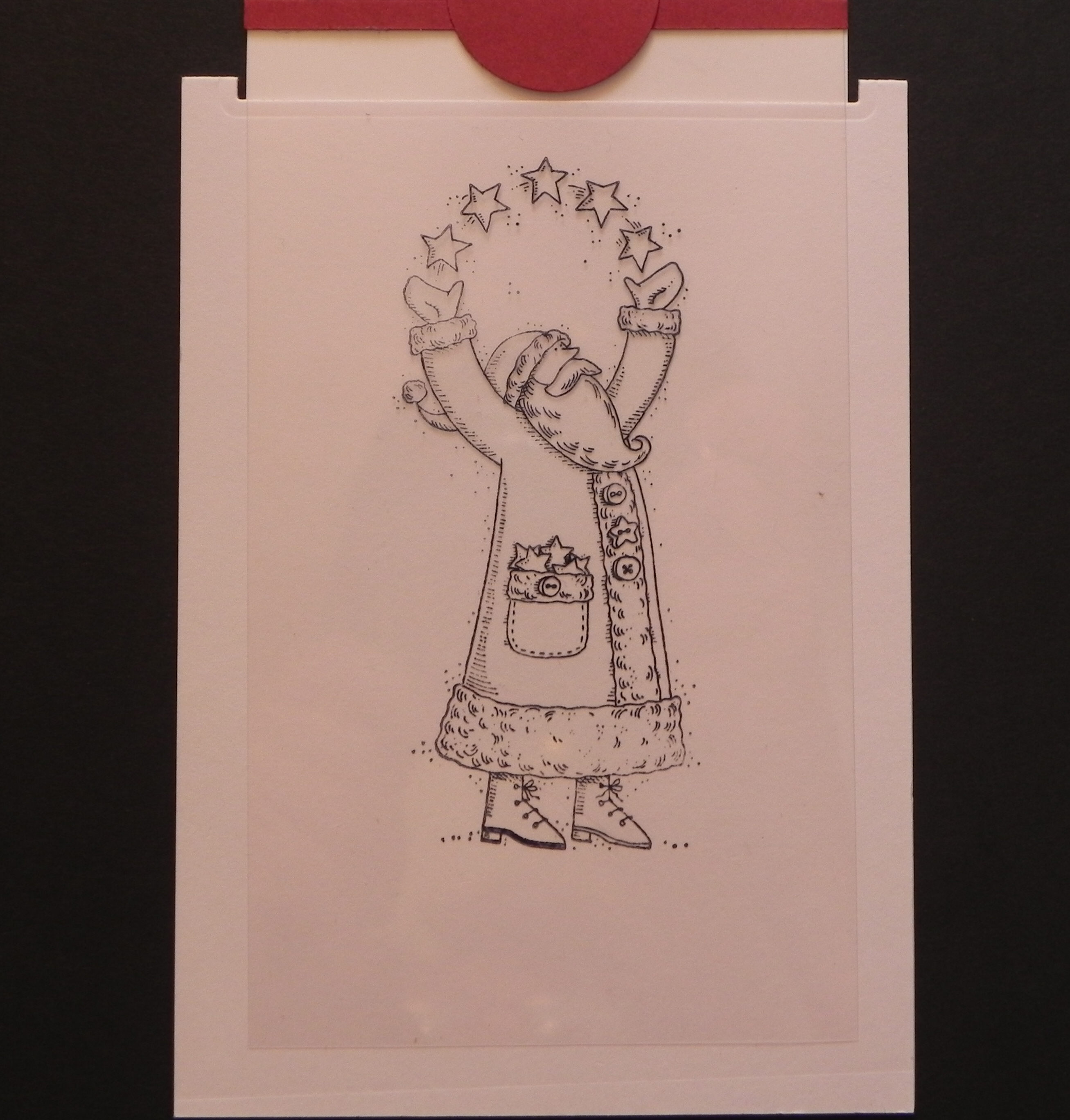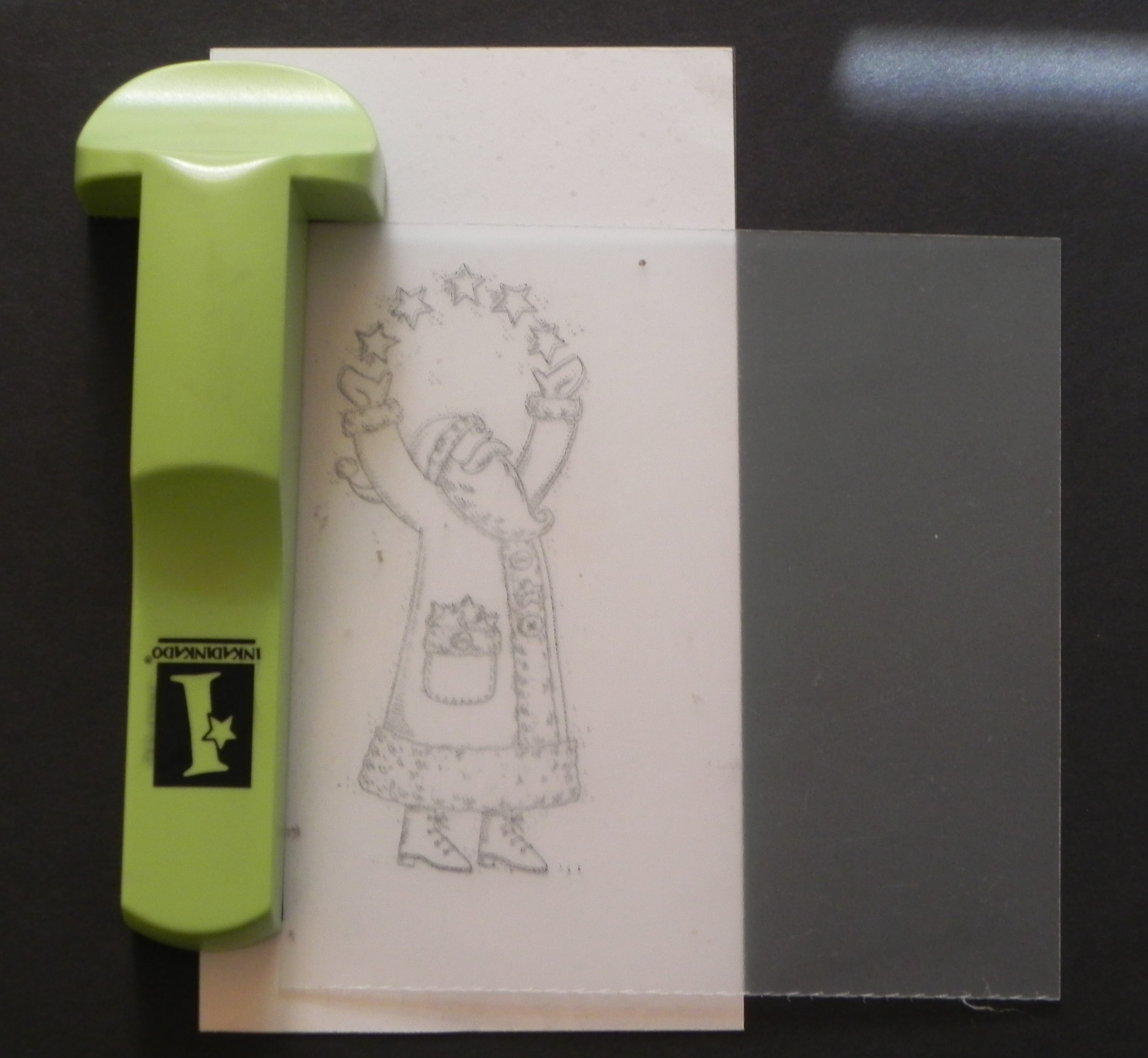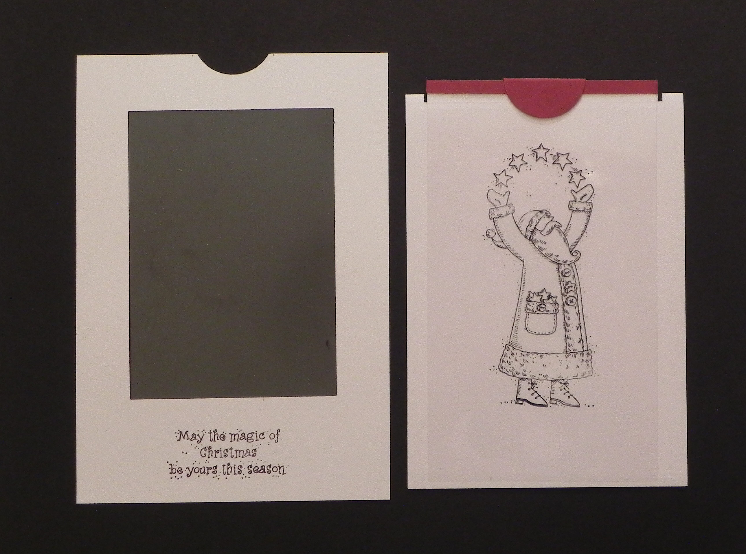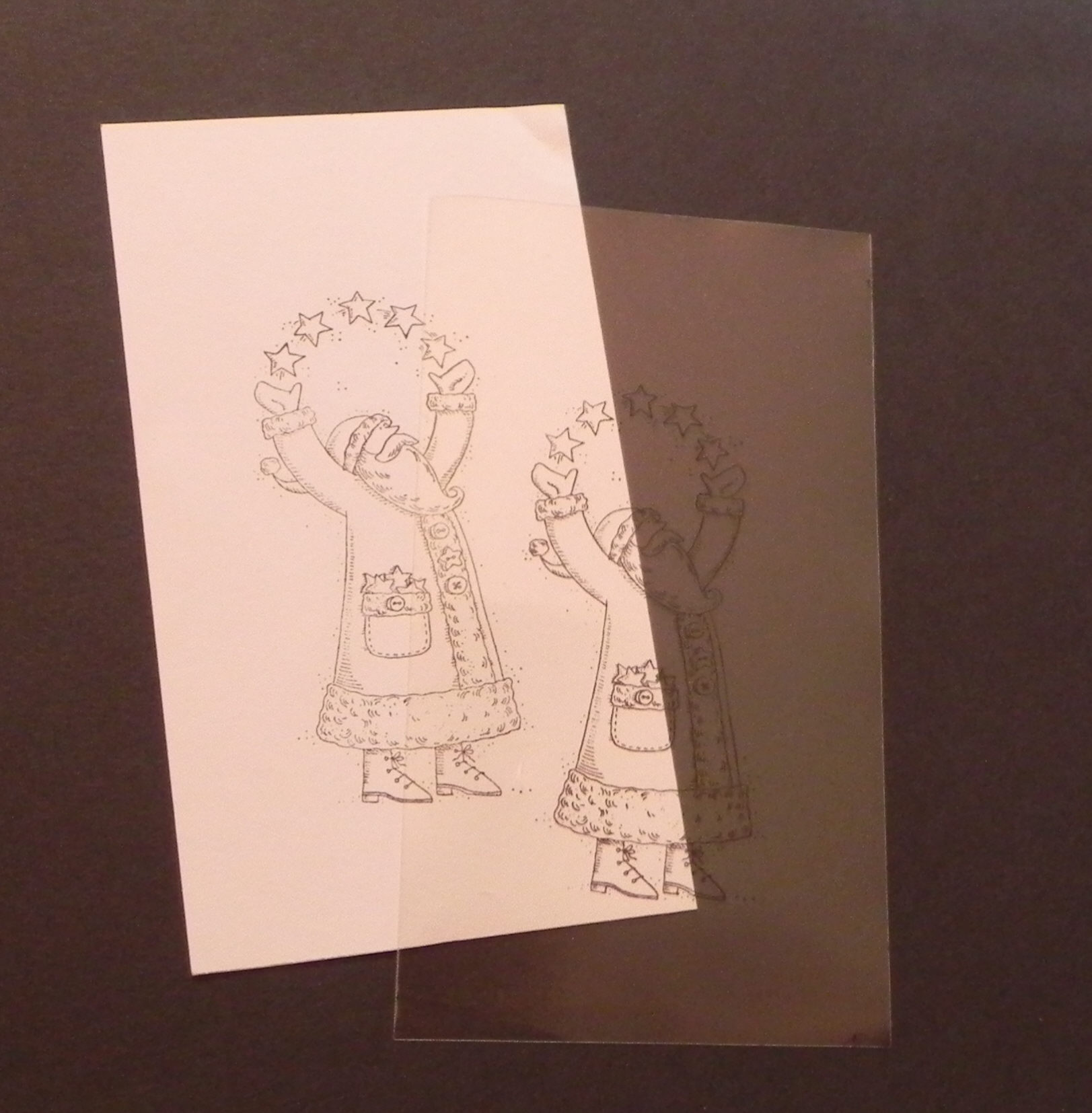 i. Remove the stamp-a-ma-jig and positioner, and you now have 2 stamped images on cardstock and acetate that should line up perfectly when the panels are placed directly one on top of the other.