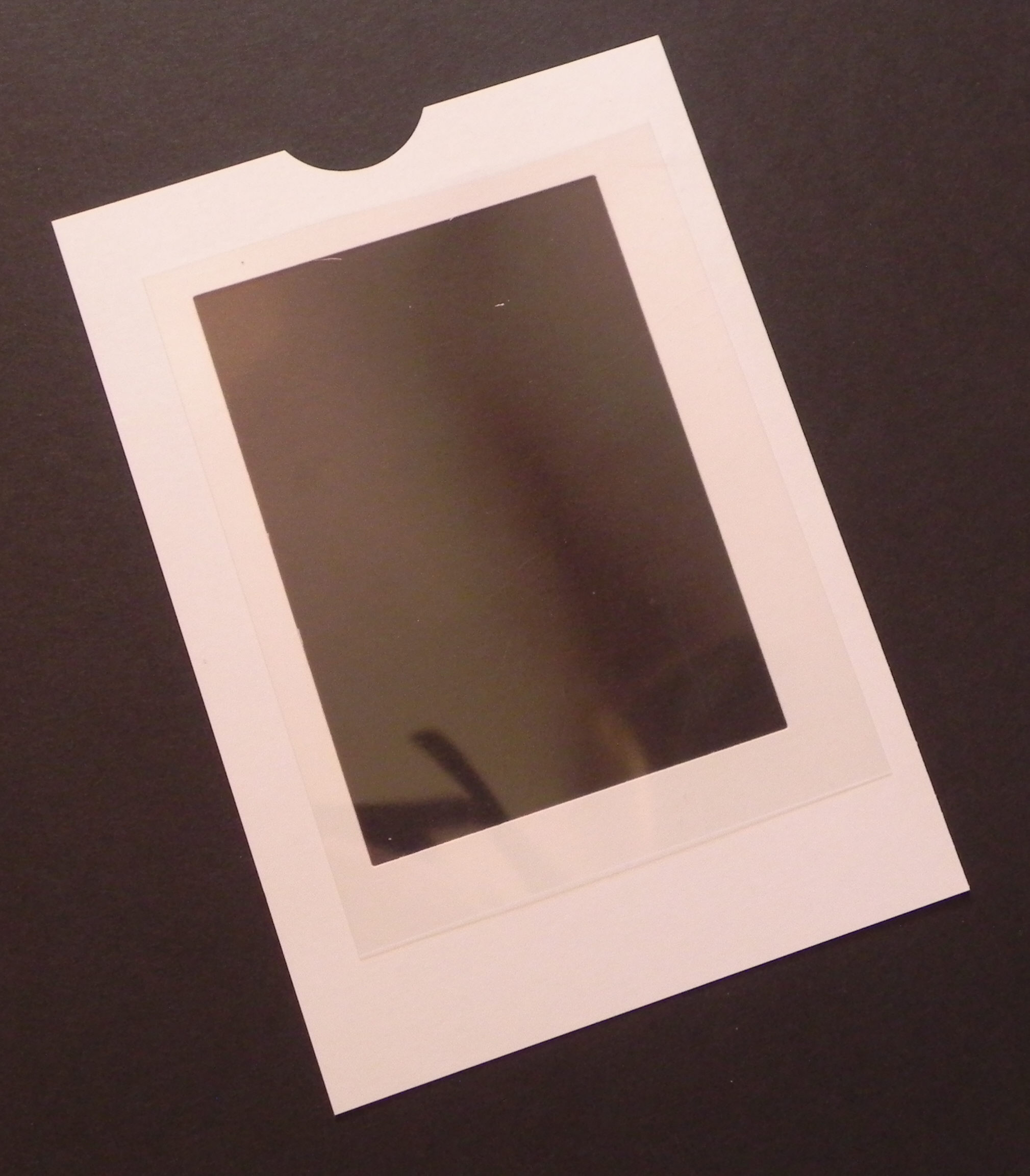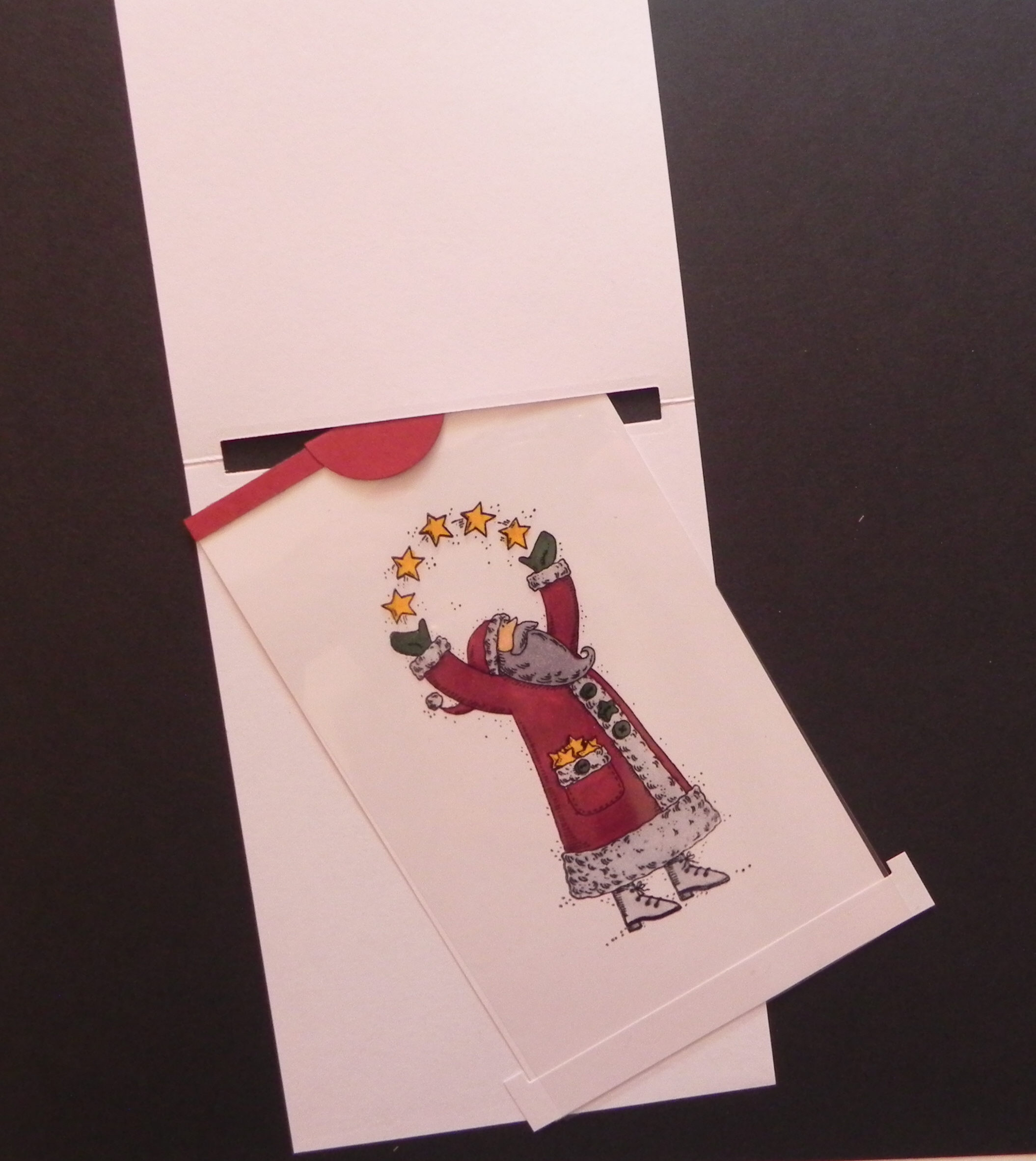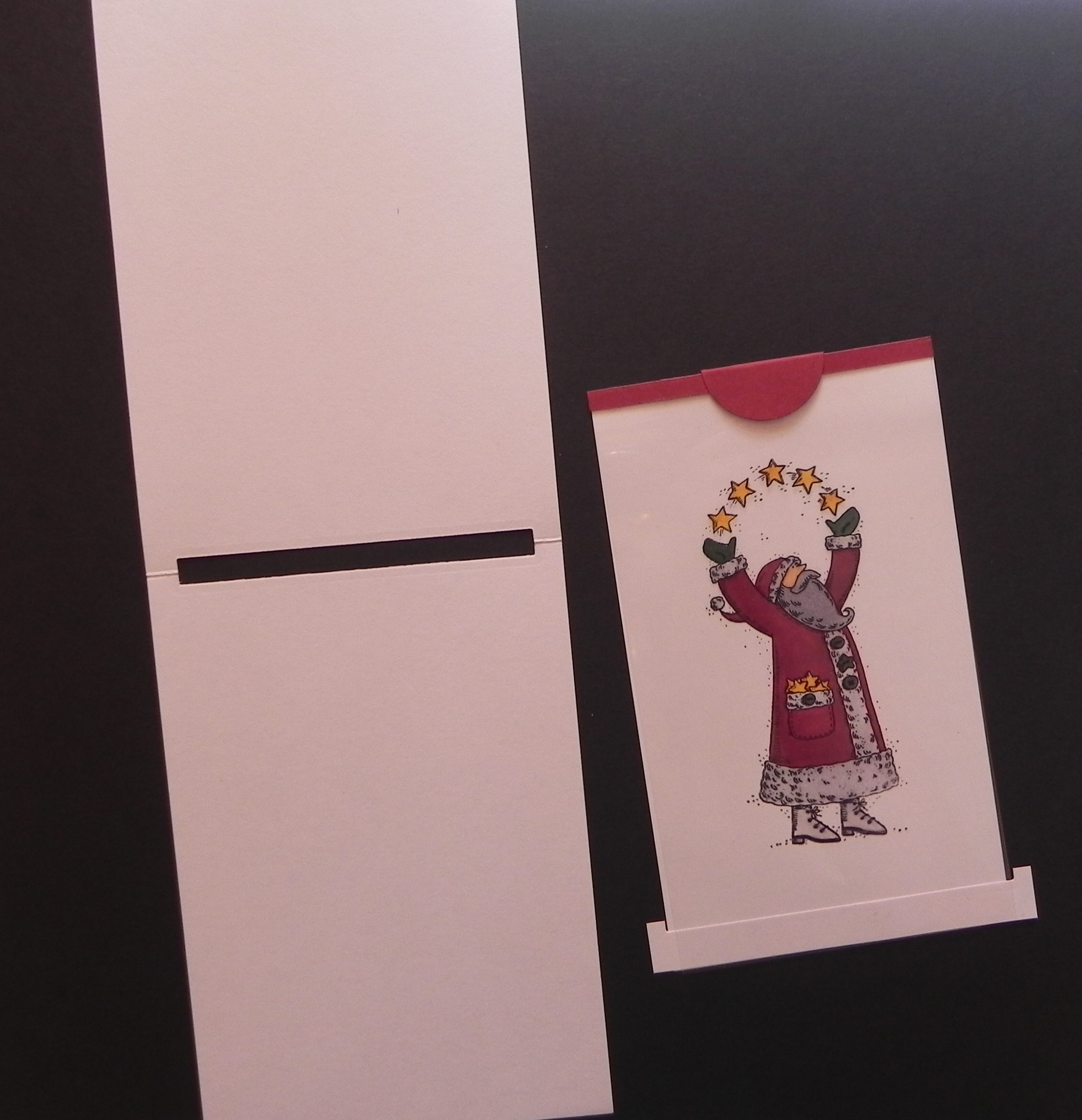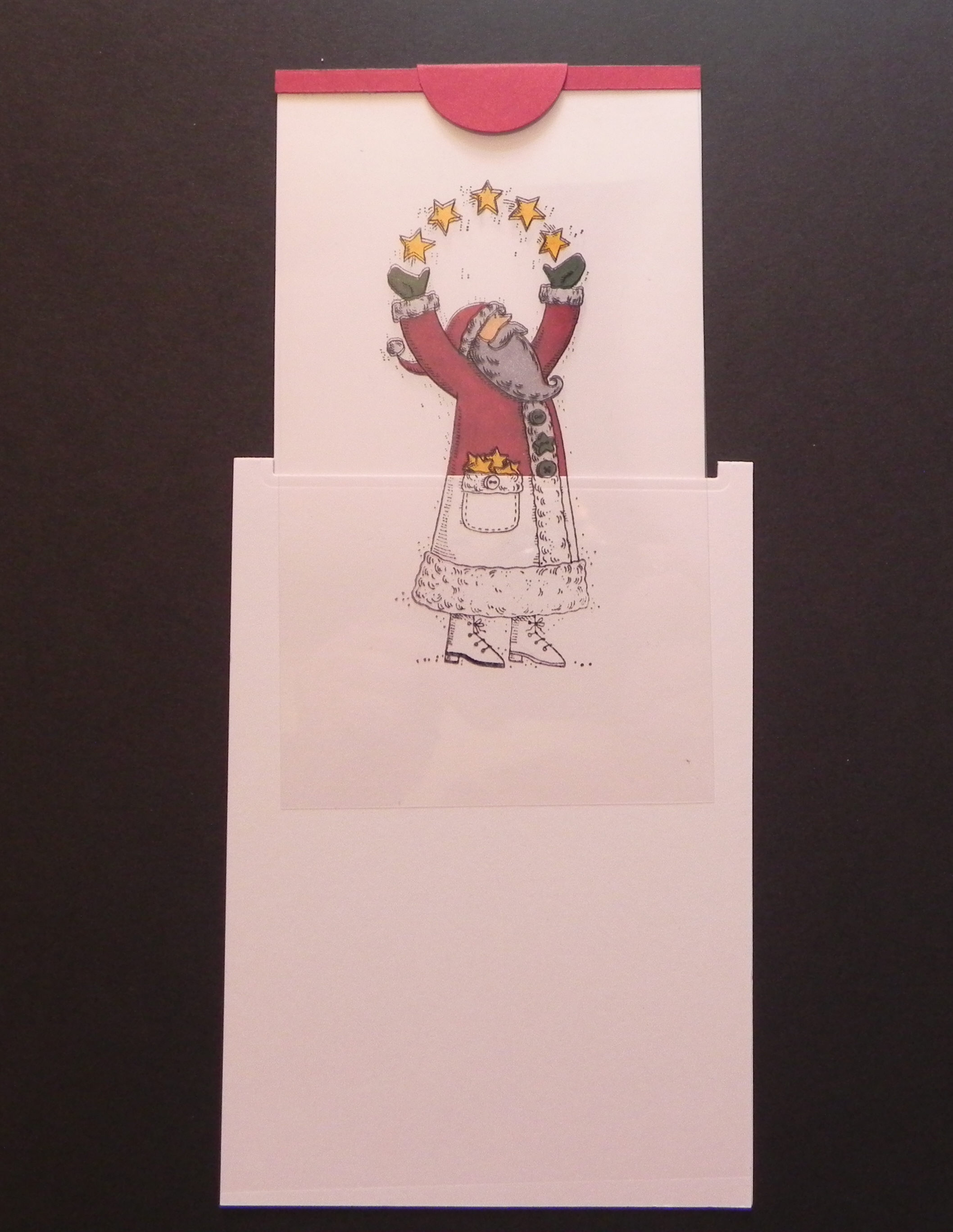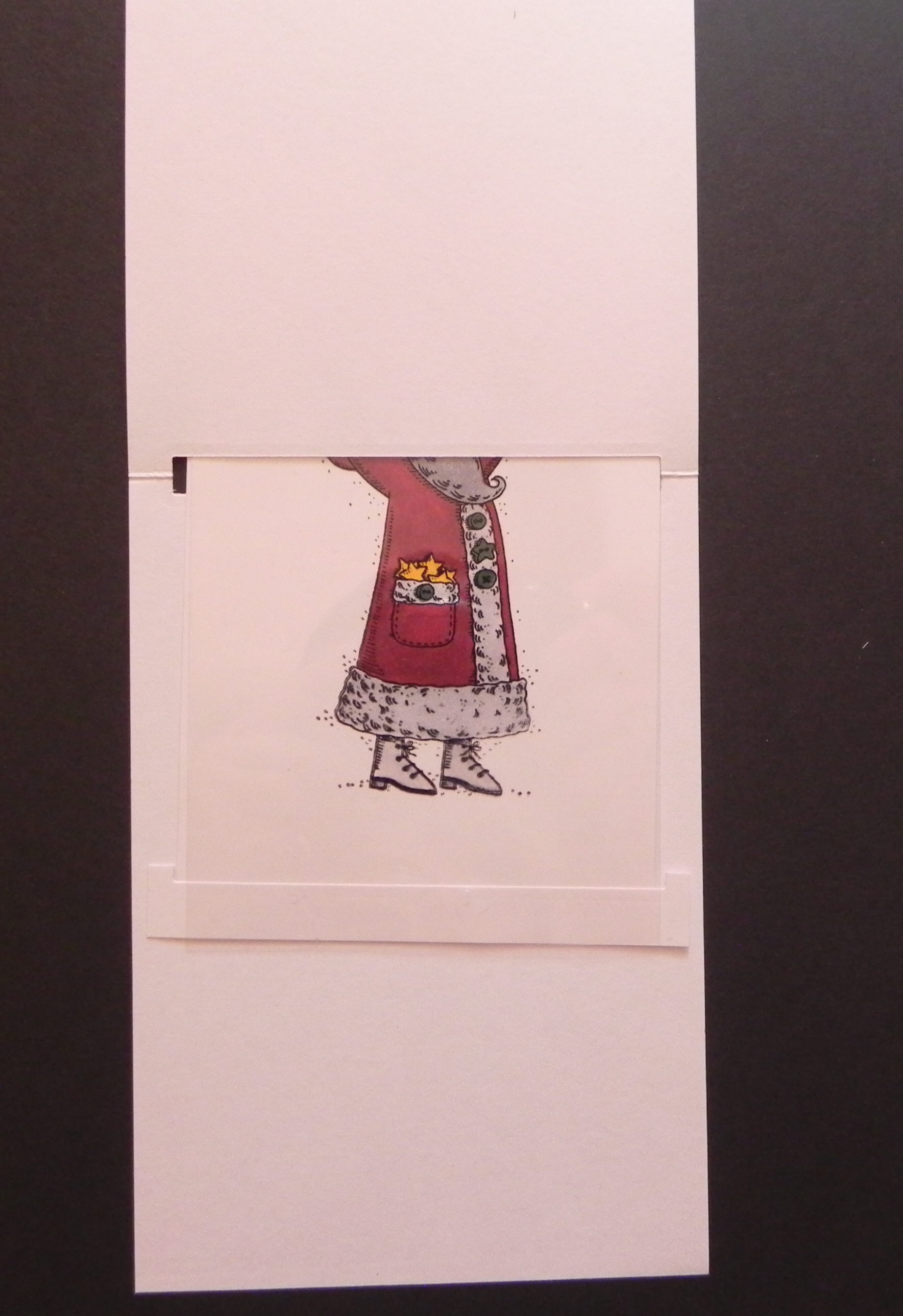 5. Cut a piece of acetate 4″ x 5 1/4″ and adhere to the back of the window in the panel with the rectangle cut-out. (Sorry – the acetate is hard to see in the photo.)