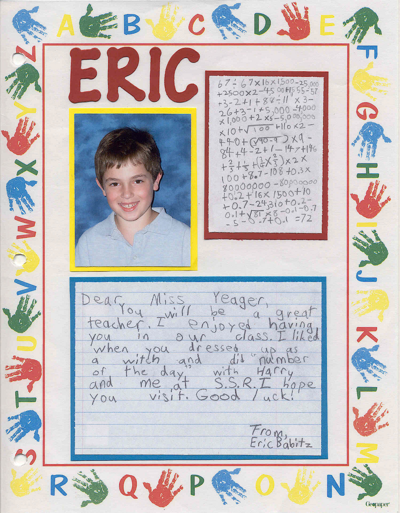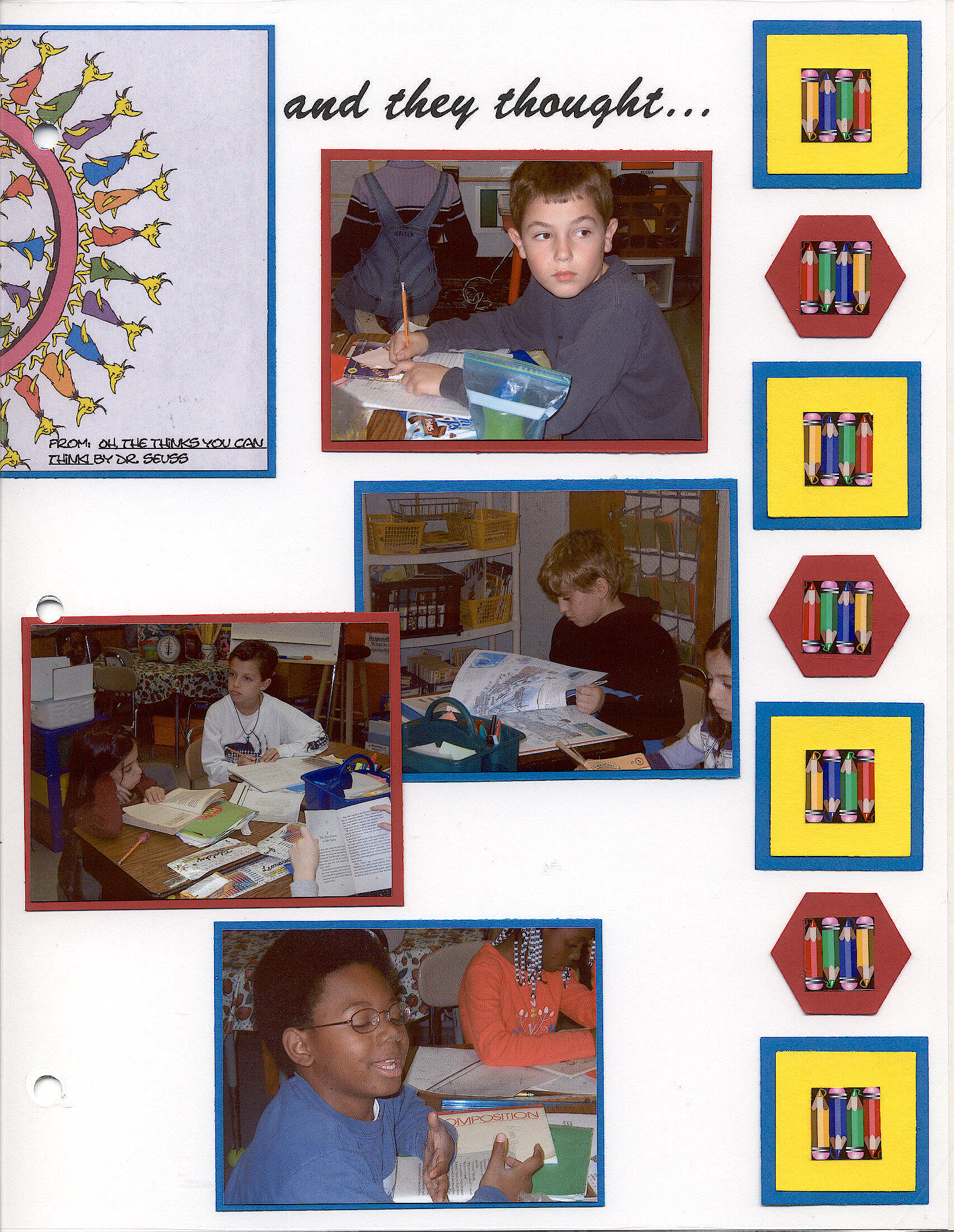 When my son was in 3rd grade, his class had a student teacher. I was asked by the regular teacher to create the layouts for a scrapbook that she wanted to present to the student teacher when she left. The regular teacher made a gorgeous cloth cover (I wish I had a photo!), and here are my pages she put inside: