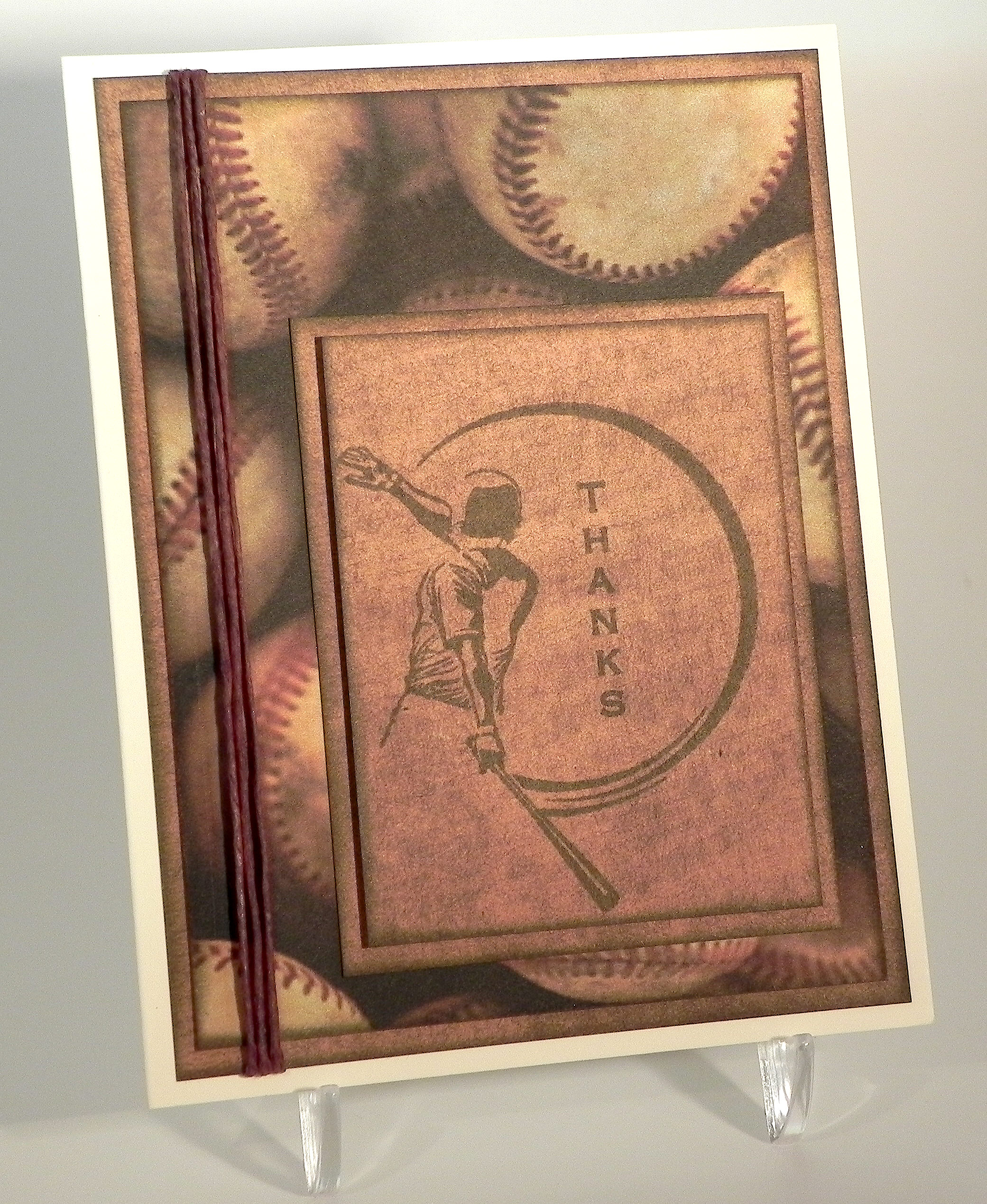 This card is being entered in the “Use Your Stuff” Challenge where we are encouraged to use stuff that we’ve had in our stash but have not used yet, and this week – to “Make it Monochromatic.” It can be a card or a layout, altered art or an ATC – as long as it is monochromatic. I used shades of brown and a baseball stamp that I purchased but hadn’t gotten around to using before now. (http://useyourstuff.blogspot.com/2015/03/176-monochromatic.html)