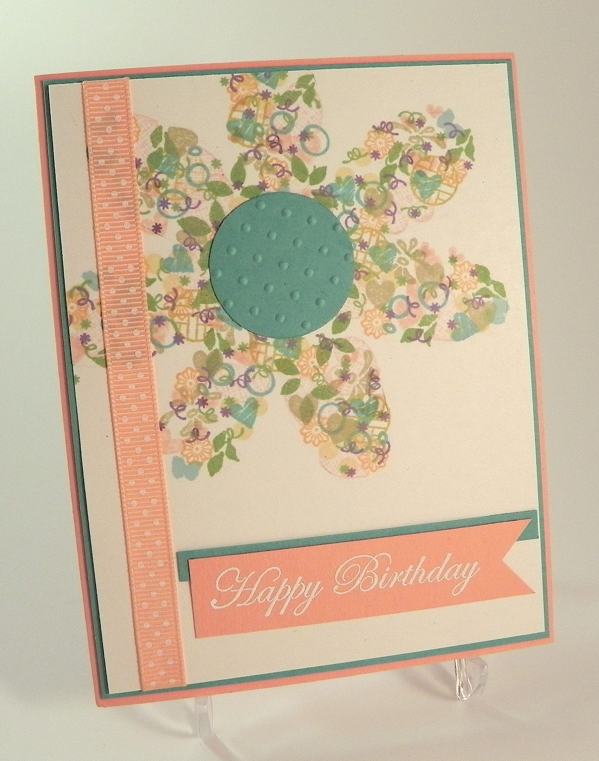 The Sentiment was from the Gina K Designs Happy Birthday Duo set and was stamped with versamark ink and heat embossed with Recollections snow embossing powder.  I cut the flower center with a Creative Memories circle punch and embossed it with a Cuttlebug Swiss Dots embossing folder.  The ribbon is by American Crafts and is strategically placed to hide an ink smudge!