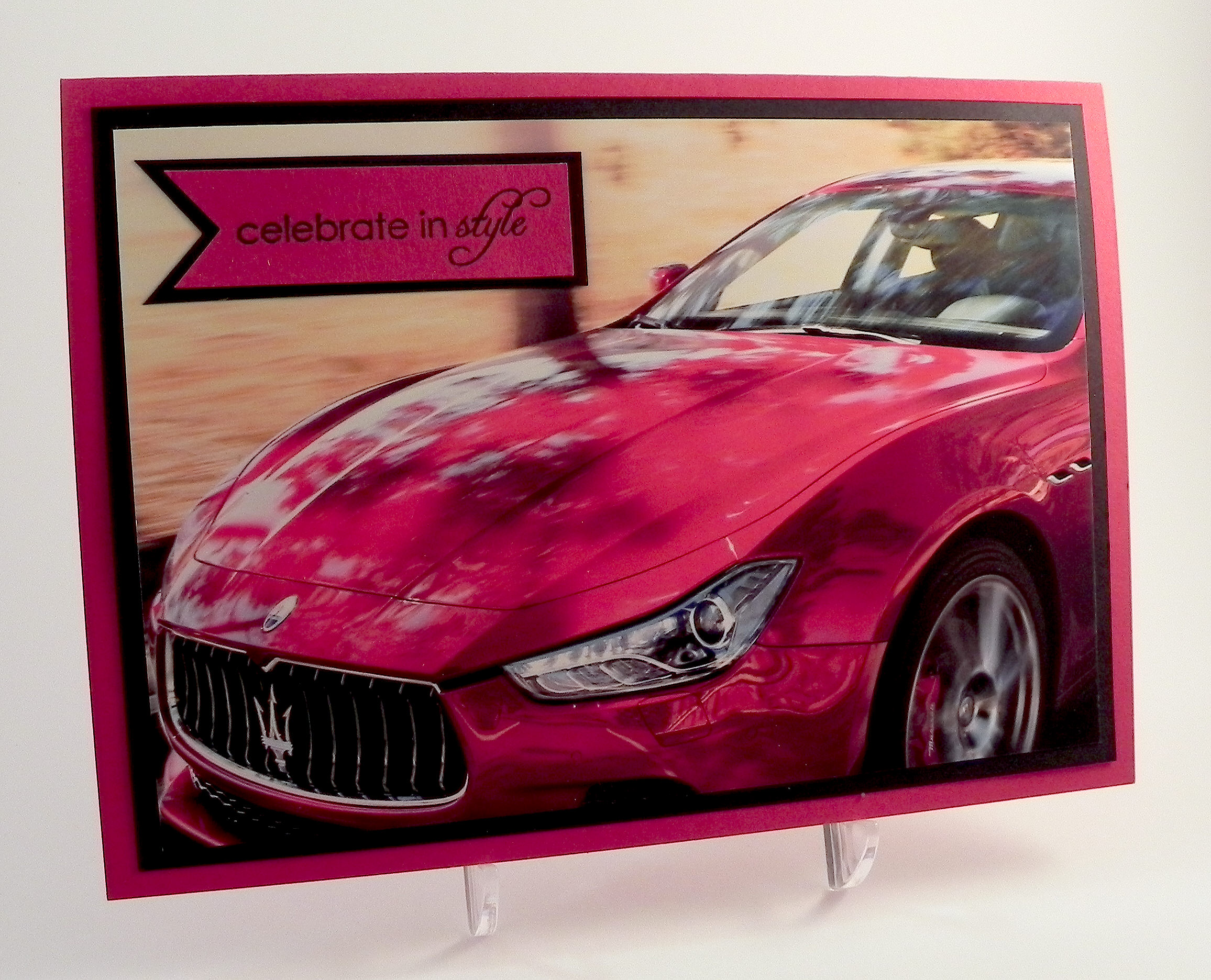 This Maserati photo screamed masculine birthday card when I saw it, so I whipped up this “stylish” card using Gina K Cherry Red and black card stock and a stamp from the Gina K Designs “Celebrate in Style” duo (retired?).  The stamp was inked with Memento tuxedo black, and then the banner was sprayed with Tattered Angels Pearl Glimmer Mist to make it shiny like the car.  Unfortunately, the shimmer doesn’t show up too well in the photo.  I tried adding ribbon, different card stock panels and die cuts, etc., but everything just took away from the beautiful photo.  Sometimes, less is better!