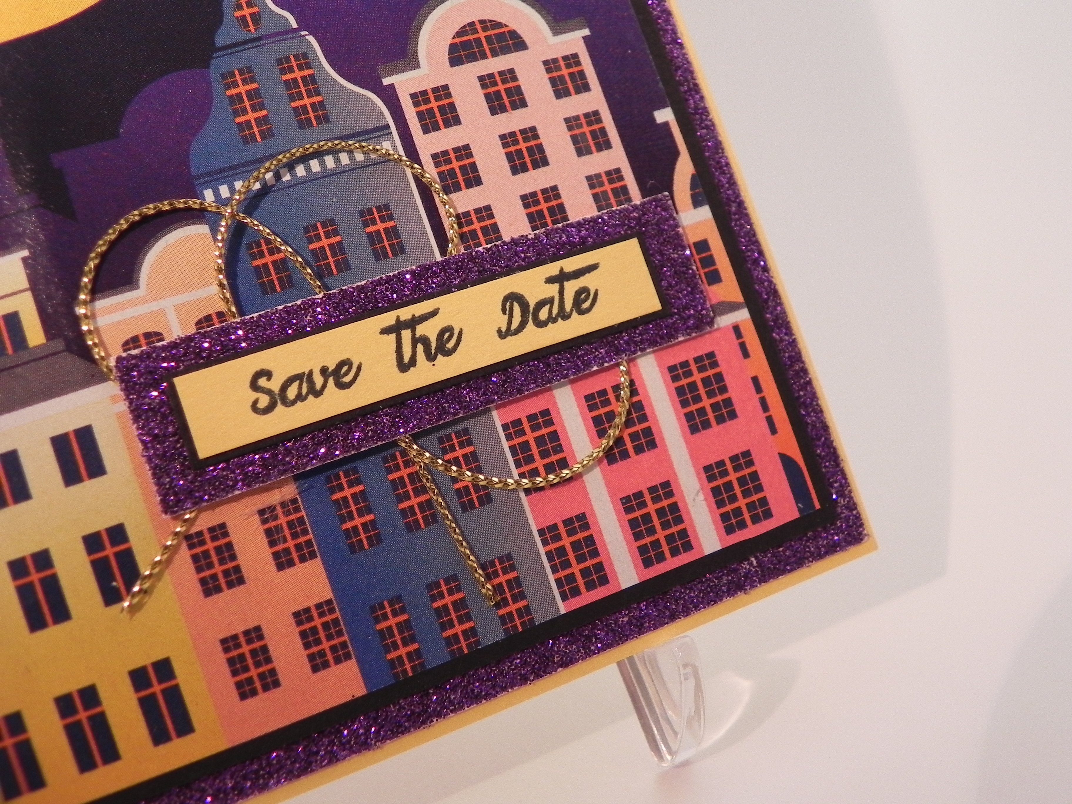 This card practically made itself!  The panel and greeting were matted on black card stock and then purple glitter paper from Michaels. The greeting was from the Gina K Designs “Folk Filigree” set (retired?) and was stamped with Memento tuxedo black ink on Gina K sweet corn card stock.  The sweet corn was also used for the card base.  A piece of gold cording was tucked behind the greeting to add a little more sparkle since you can never have too much sparkle on a “fancy party” card!