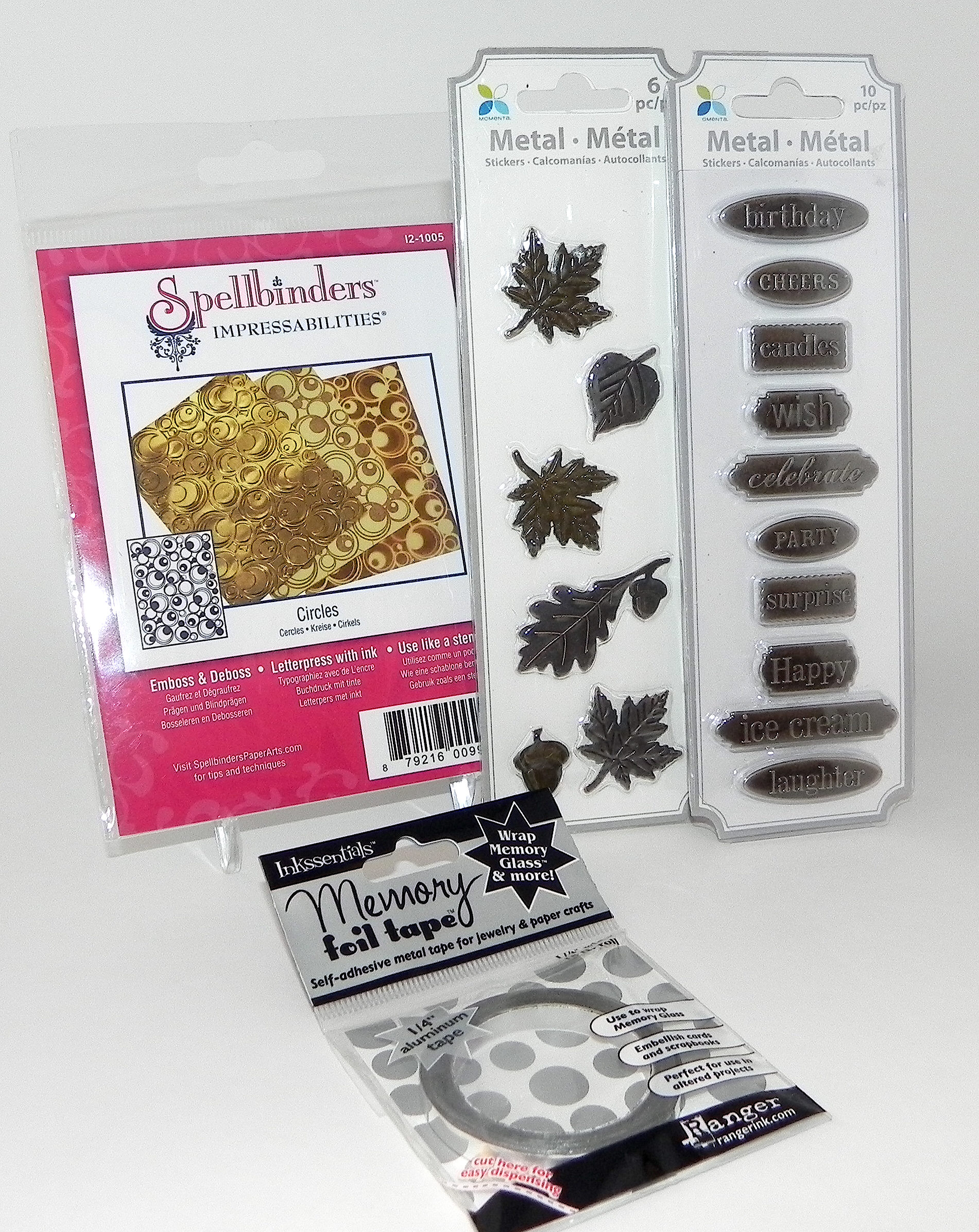The Mod Squad Challenge prize (for a randomly drawn winner) is “stuff” from my stash [Spellbinders “Circles” Impressabilites (which can be used as a stencil if you don’t have a machine for embossing), two packs of metal embellishments, and silver foil tape.