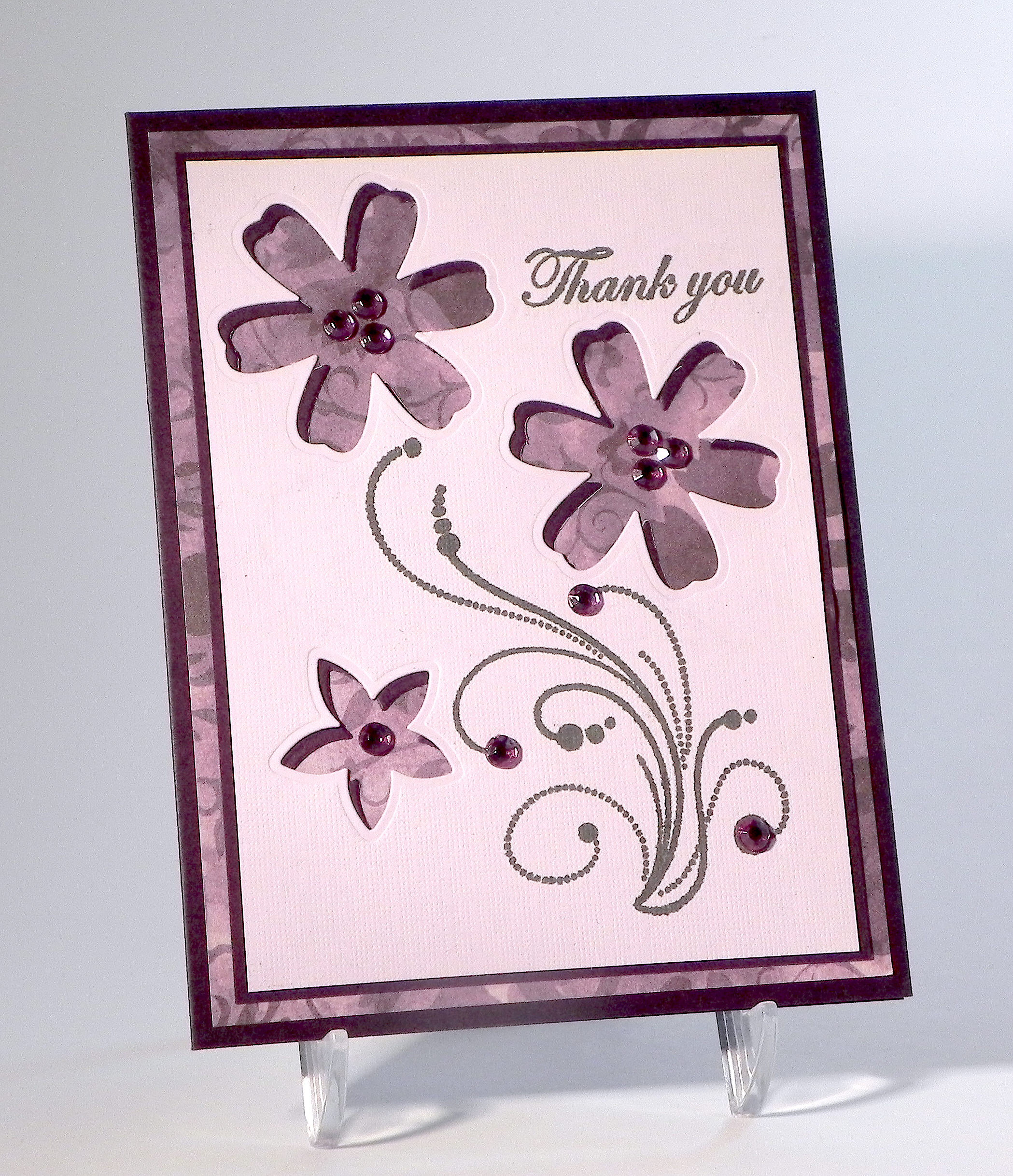 … and die cut the flowers (through both panels at once) using dies from the Momenta Flowers 2 (Lot 004798) die set. (I added a bit of repositional adhesive to keep the two panels in place temporarily.) Once the flowers were cut, removed (and saved for a later project!), I centered the lighter purple panel on the darker one. This caused the cut-outs to be slightly offset creating a partial “shadow” effect. It didn’t go around the flowers perfectly or completely, but it was enough to add a little contrast between the light panel and the patterned paper. This matted panel was adhered to the patterned panel (“Dark Plum Damask” – Sonnets by Sharon – Creative Imaginations) and then to an Edible Eggplant card base. Lavender Gem Stickers (Martha Stewart Crafts) were added to the centers of the flowers and on the flourish.