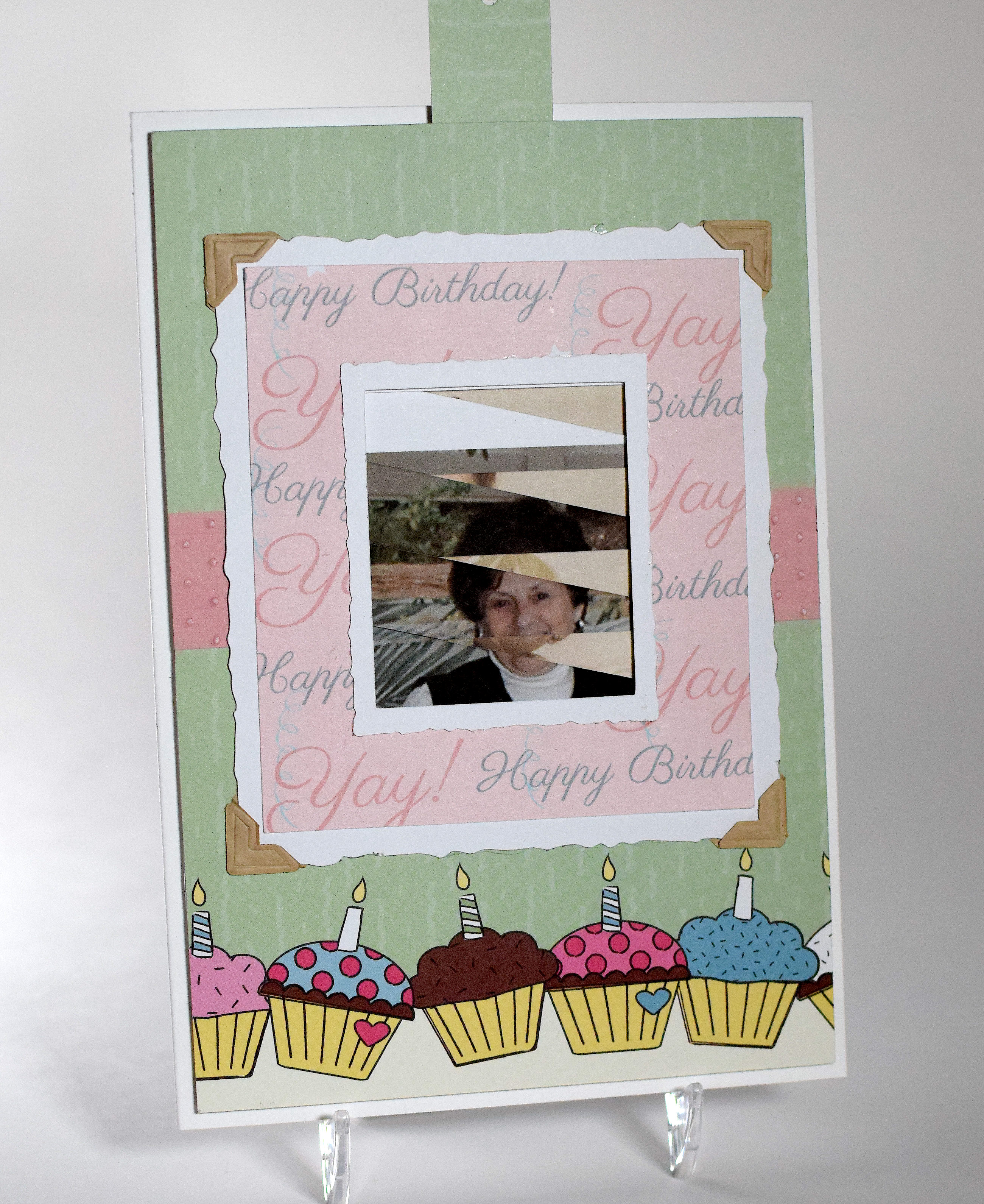 My photos were about 2 3/8″ x 2 3/8″ (about 6cm x 6cm). (I think she recommends a 5cm square photo with her templates.) The green panel with the cupcakes is called “Birthday Wishes” from the “It’s Your Day!” collection by Nikki Sivils. The printed frame was made with digital paper from a set called “Birthday Digital Paper” by GraceGraphicDesign which I purchased on Etsy. The white frames were made with a cut file from the “4 Vintage Frames (Design #24374)” set by Lori Whitlock which I purchased from the Silhouette Store and were cut with my Silhouette. The pink center strip is Gina K Innocent Pink card stock and was embossed with a Cuttlebug Swiss Dot embossing folder. I used a heavy weight white card base to make it easier to push and pull the tab without bending the card.
