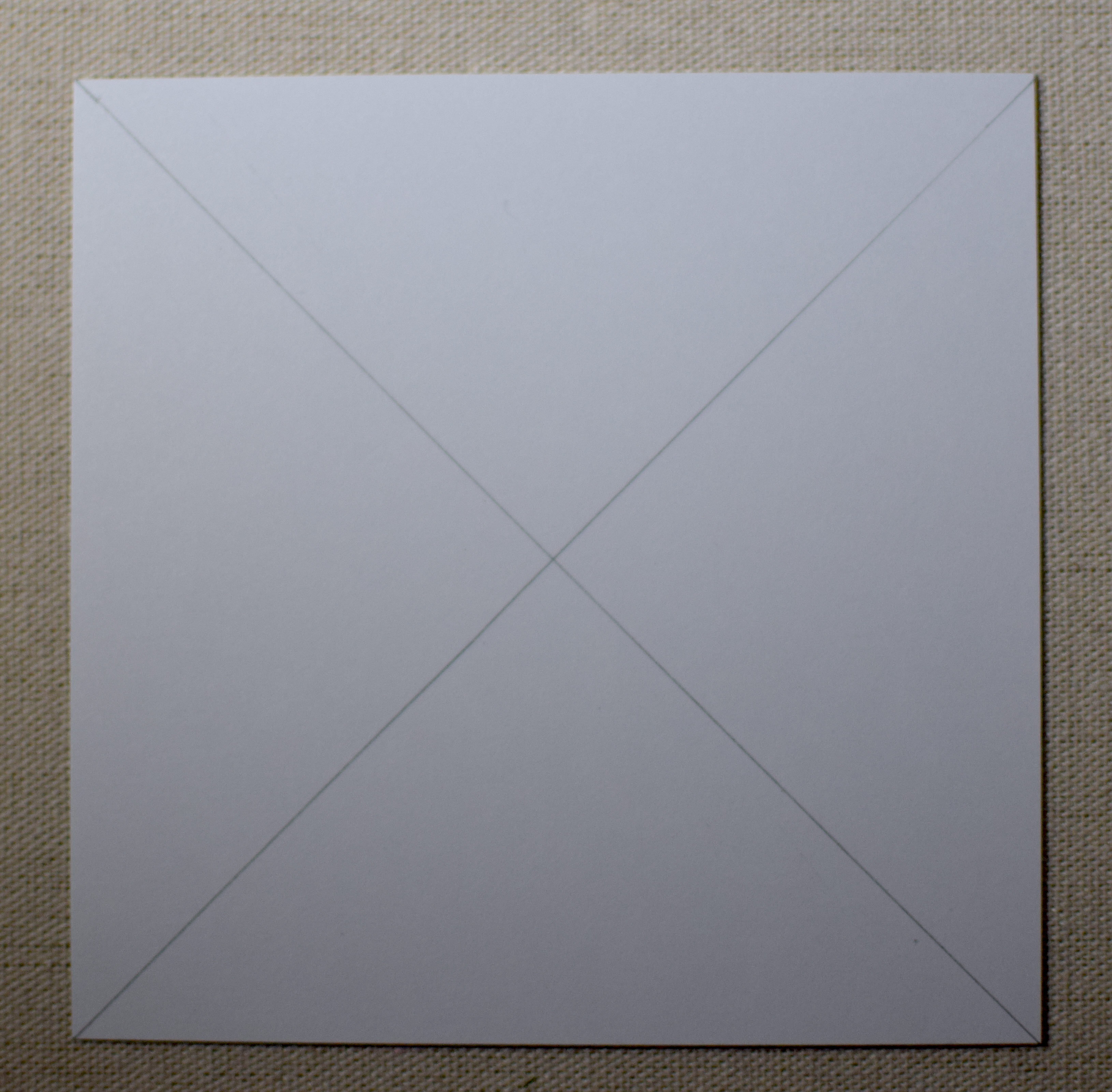 First, cut your card stock to the desired size.  I am using a 4 inch square for this tutorial, but rectangles work also.  Lightly draw (with pencil) diagonal lines from corner to corner of your frame panel.  (Click on the photos for a larger view if desired.)