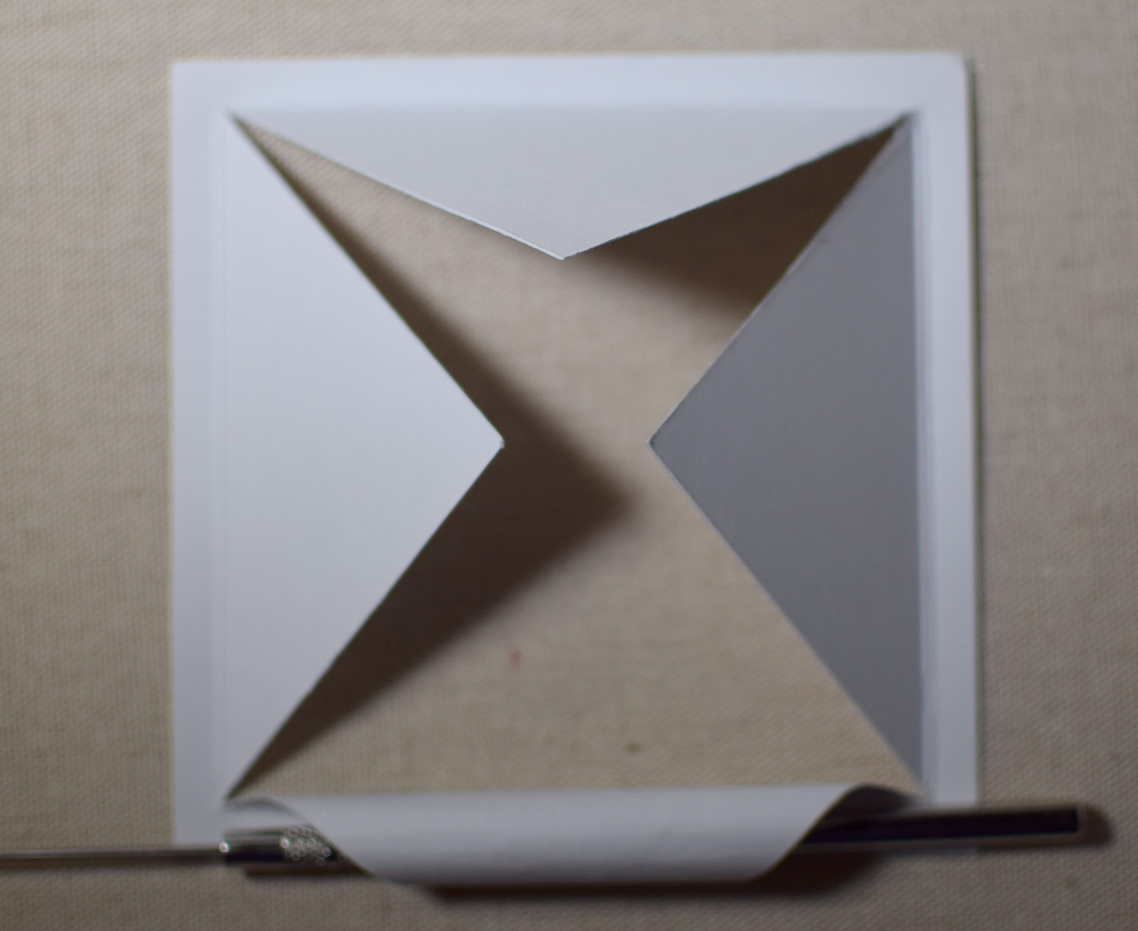 For my card above, I started with a 4×4 inch gray panel and scored at 3/8 inch from each of the edges.  My blue panel was 3 3/4 x 3 3/4 inches and was scored at 1/4 inch from each edge.  Once the diagonal cuts are made and the “triangles” are folded up, you can slide one panel on top of the other one and glue the flat edges together (but not the triangles); the triangles  of the two panels should now be lined up.