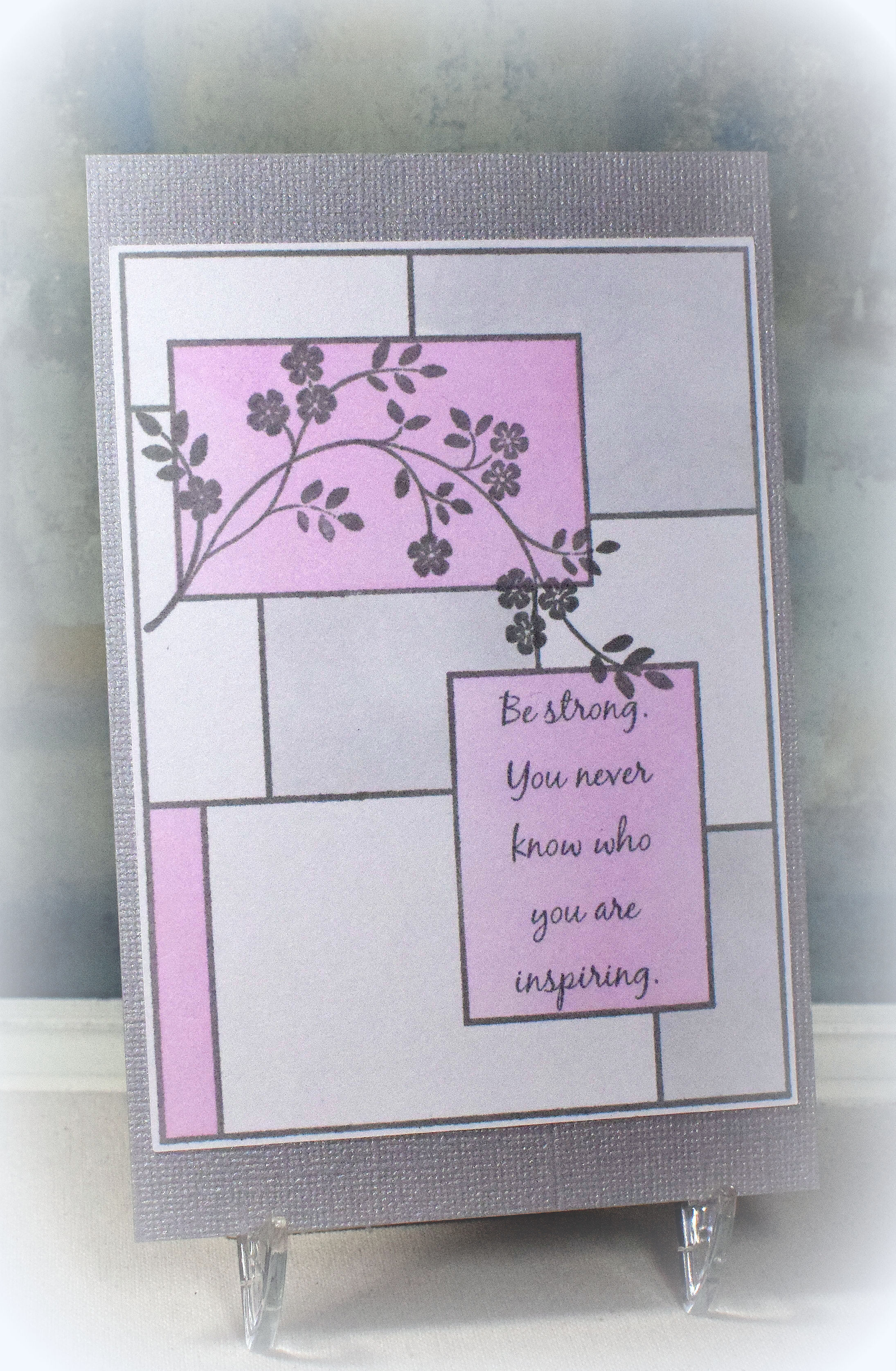 I was asked to create a panel for a 4×6 inch frame with the quote, “Be strong. You never know who you are inspiring.” She asked that I do the panel in pink, gray and white. This is one of the samples I came up with.