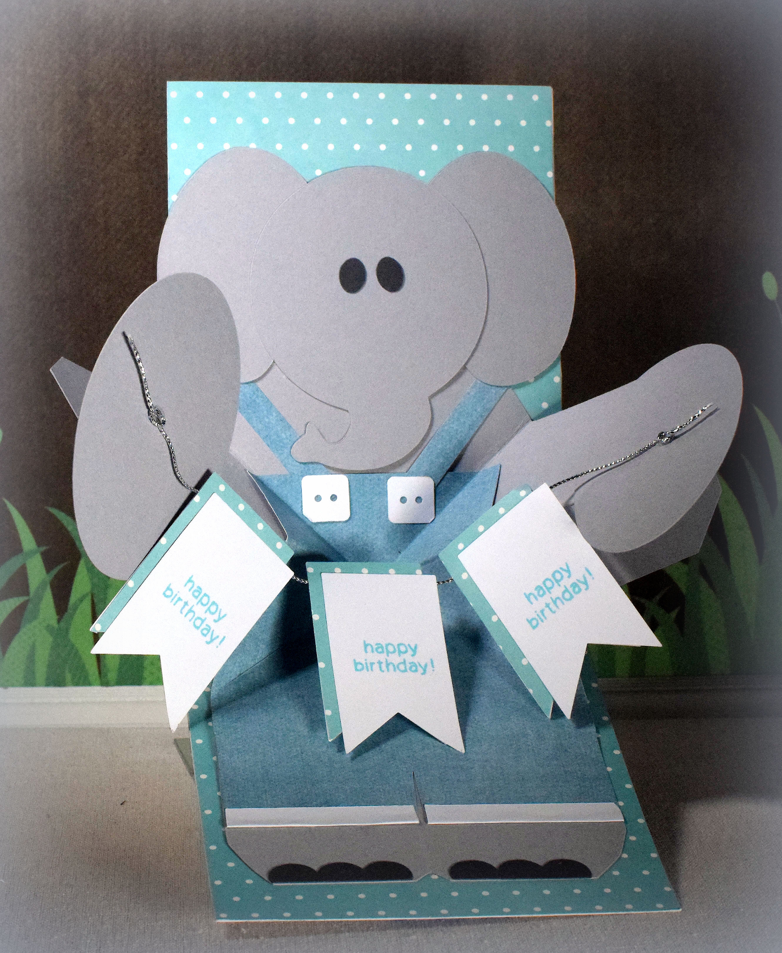 The animal designs were adapted from files I purchased in the Silhouette Store.  I had the most trouble making the elephant work because the head, with the big ears, was either too big for the card (the trunk got in the way of the center folds and the ears extended too far over the sides) or too small for the rest of his body.  An elephant’s body is also pretty plain so I struggled with an idea to jazz him up a bit.  The overalls finally helped him come together.