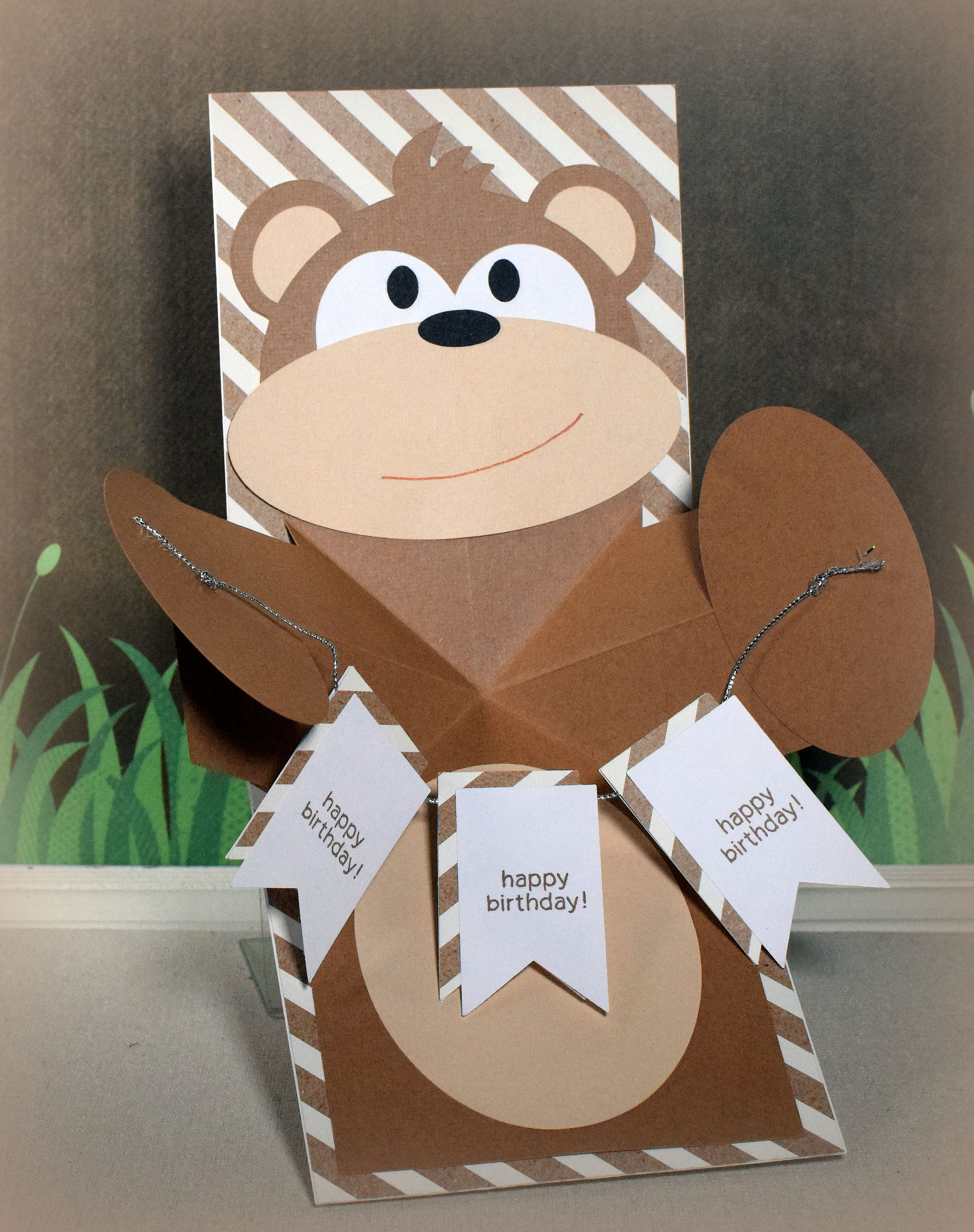 Monkey – Silhouette cut file by Amy Robinson called “Monkey Paper Sack Pupet” (Design #55867);  Card Stock: Pebbles Party Time from the Spring Fling Collection, Core’dinations Java Bean and Chocolate Malt, Recollections white and black;  Ink:  Gina K Warm Cocoa ink;  Birthday Stamp from the Newton’s Nook Designs “Newton’s Birthday Bash” set;  EK Success Banner Punch;  and Gina K Silver cording.