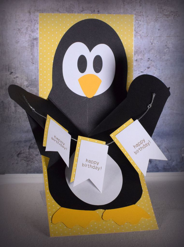 Penguin – Silhouette cut file by Snapdragon Snippets called “Penguin” (Design #52933);  Card Stock: Pebbles pattern #732551 (no name on label?), American Craft “Horizon” from the Star Shine Collection, Recollections black, white, and a scrap of yellow from my scrap box; Gina K Warm Cocoa ink;  Birthday Stamp from the Newton’s Nook Designs “Newton’s Birthday Bash” set;  EK Success Banner Punch;  and Gina K Silver cording.