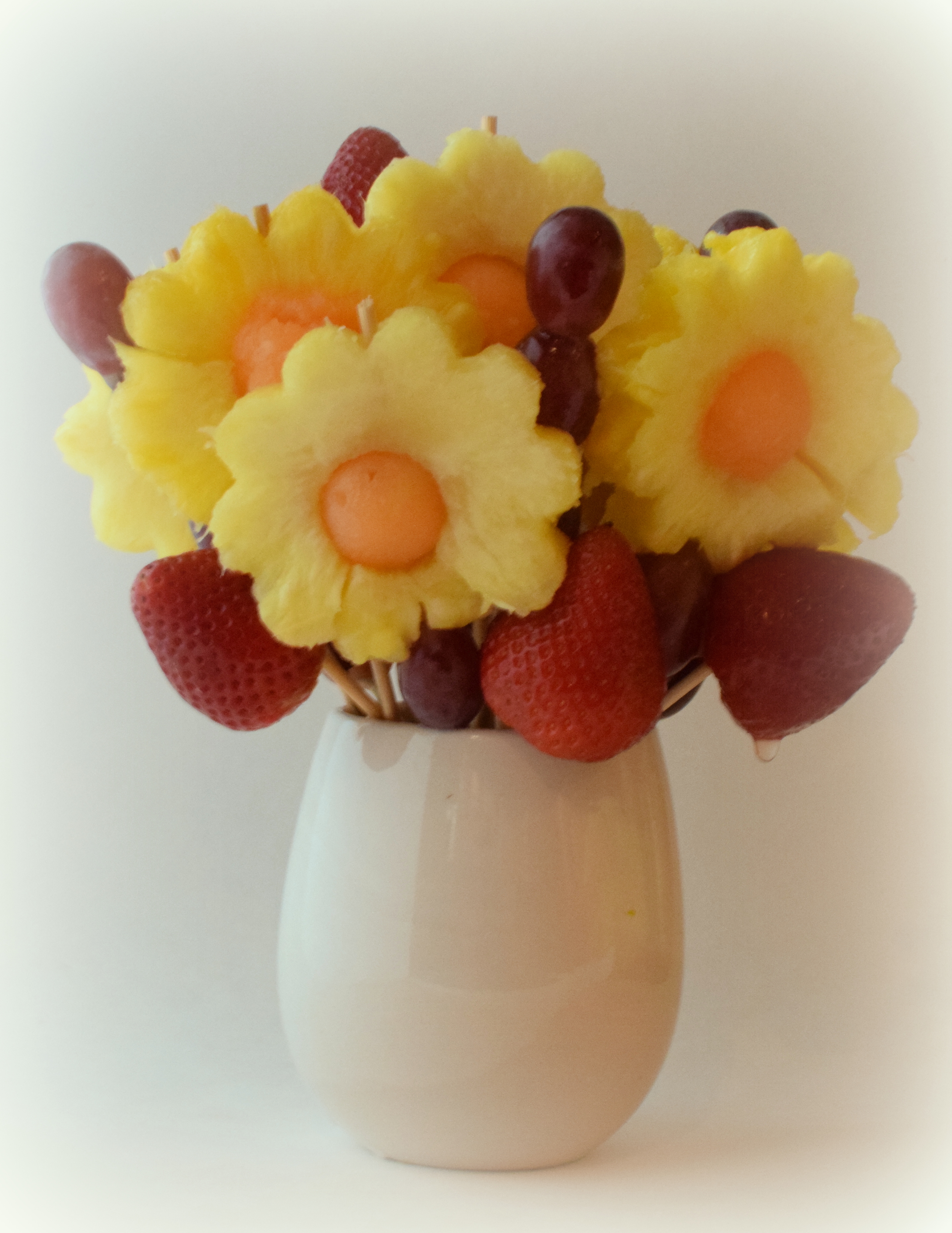 Now back to the pineapple bouquet… I started with a pre-cored pineapple I purchased at my local grocery store, sliced it, and then used a Wilton cookie cutter to create the flowers.  I scooped cantaloupe balls for the flower centers and used grapes to hold the flower in place on the wooden skewers.  Additional grapes and strawberries were stuck on skewers as well.  The container is a handle-less mug from Michaels that was meant to be painted.  (I left it white.)  I cut a small orange in half and placed it (flat side down) in the bottom of the mug so I had something in which to stick the skewers of fruit.  I left a bit of stick exposed above each flower so there was something to grab when removing the flowers to eat.