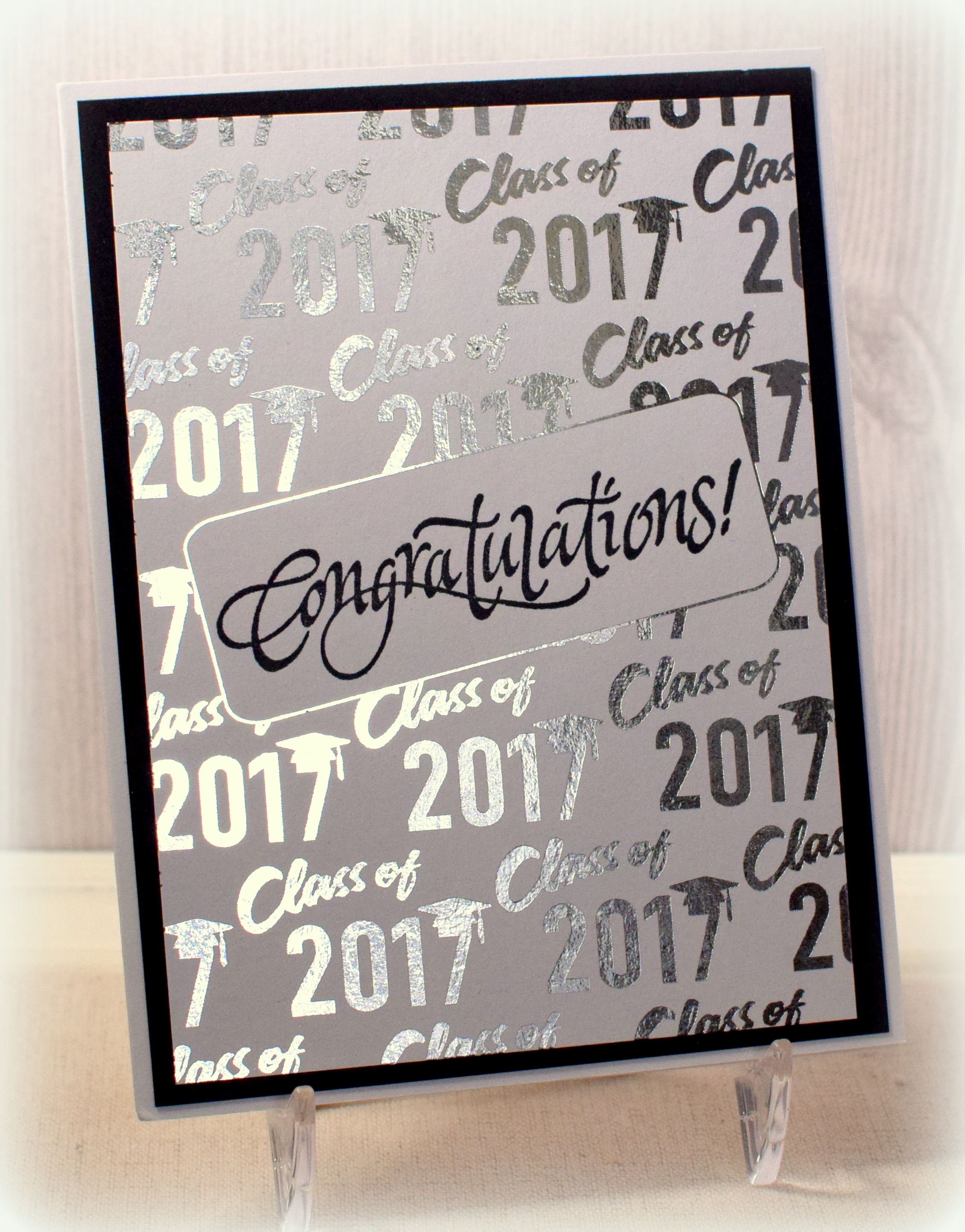 I created the background panels from a file from the “Graduation Digital Paper Pack” by DeerCustomDesigns. I imported the image into Printshop and added the blank text box in the center so I could stamp my greeting. Once the panel was designed, I printed multiple copies with my laser printer (foil transfers to toner but not ink), trimmed them to size, and foiled the panels with either Gina K Red Velvet Fancy Foils or Therm O Web Silver Deco Foil and my mini Heidi Swapp MINC foiling machine. (A laminator can also be used.)