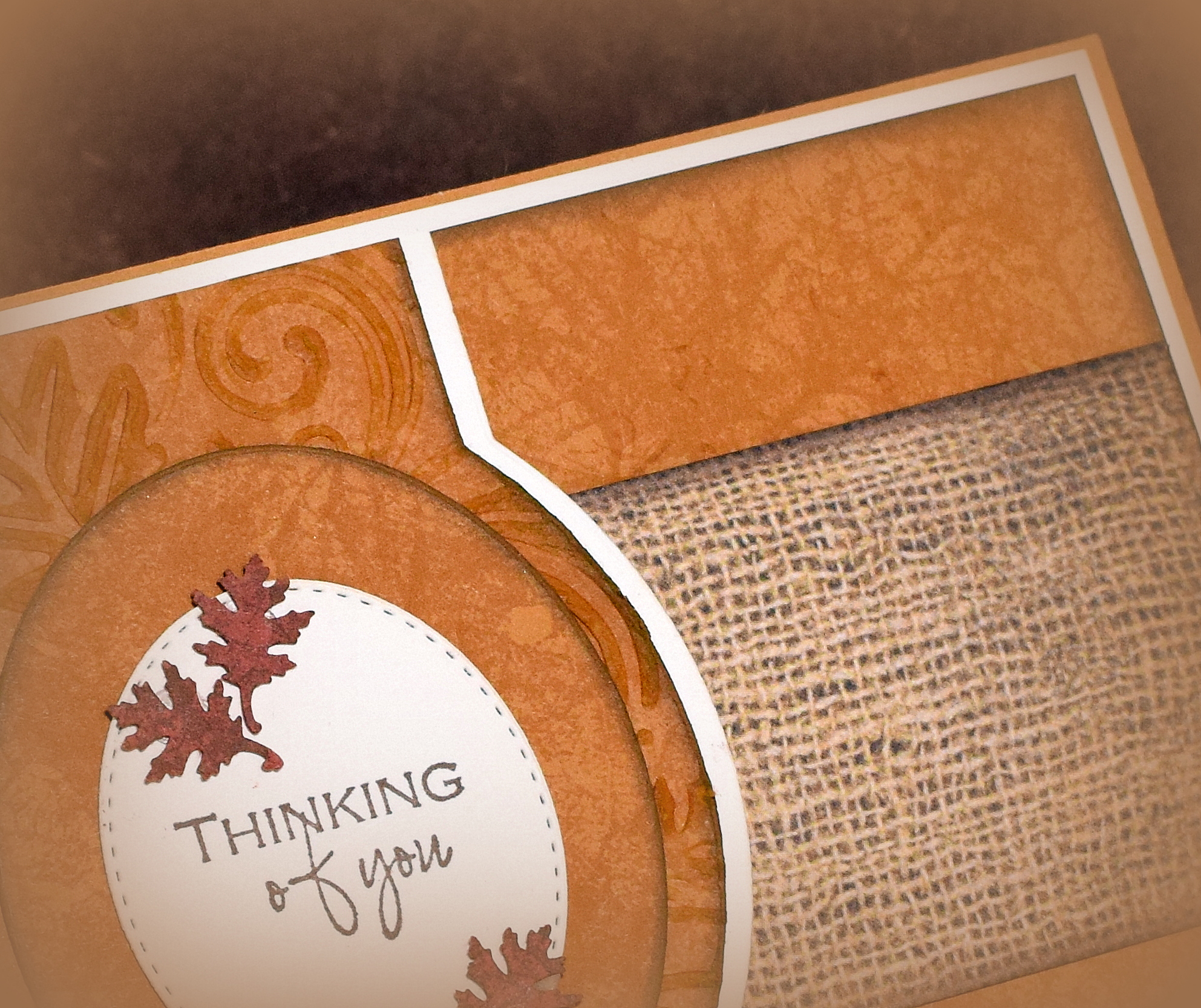 To create the paper for the little leaves around the greeting, I repeated the process above but with Gina K Faded Brick card stock and Charcoal brown ink. Once the panel was stamped, I used a small Recollections Oak Leaf Punch (5/8 inch) to cut out the leaves.