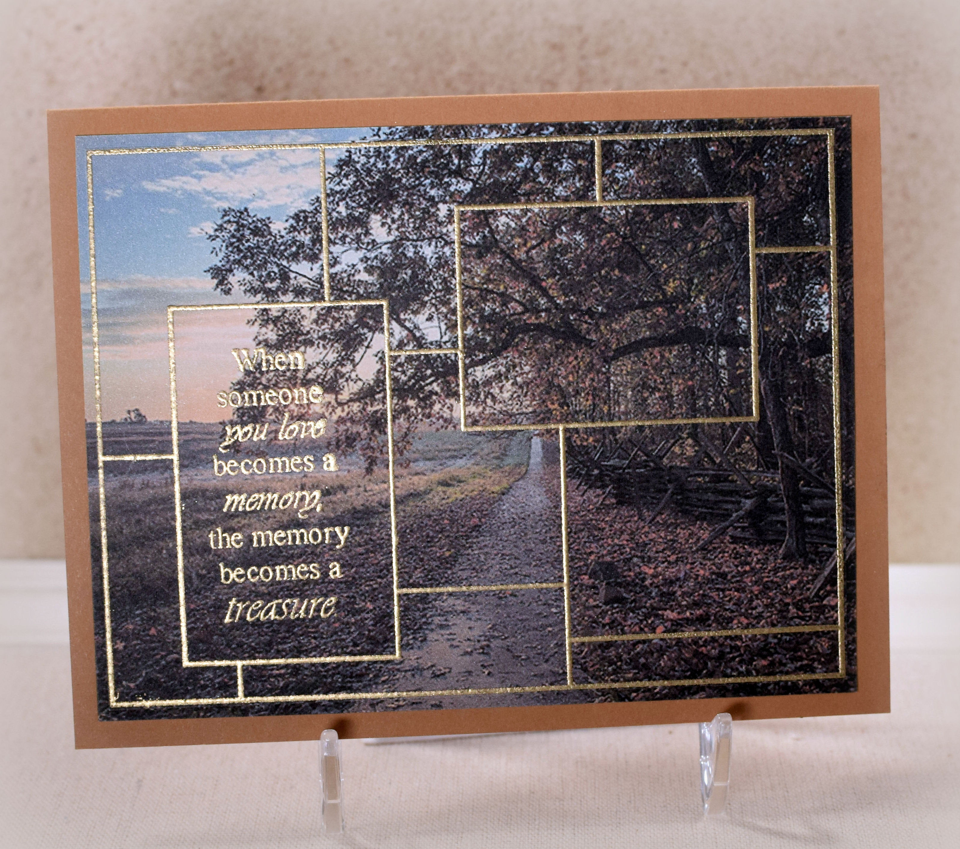 She and my uncle and cousin loved Gettysburg and went there often. I made this card for them with a photo (used with permission) of a Path near the Virginia Memorial in Gettysburg National Park (photo by Marc Andre). They recognized the scene immediately and said it was one of their favorite spots.