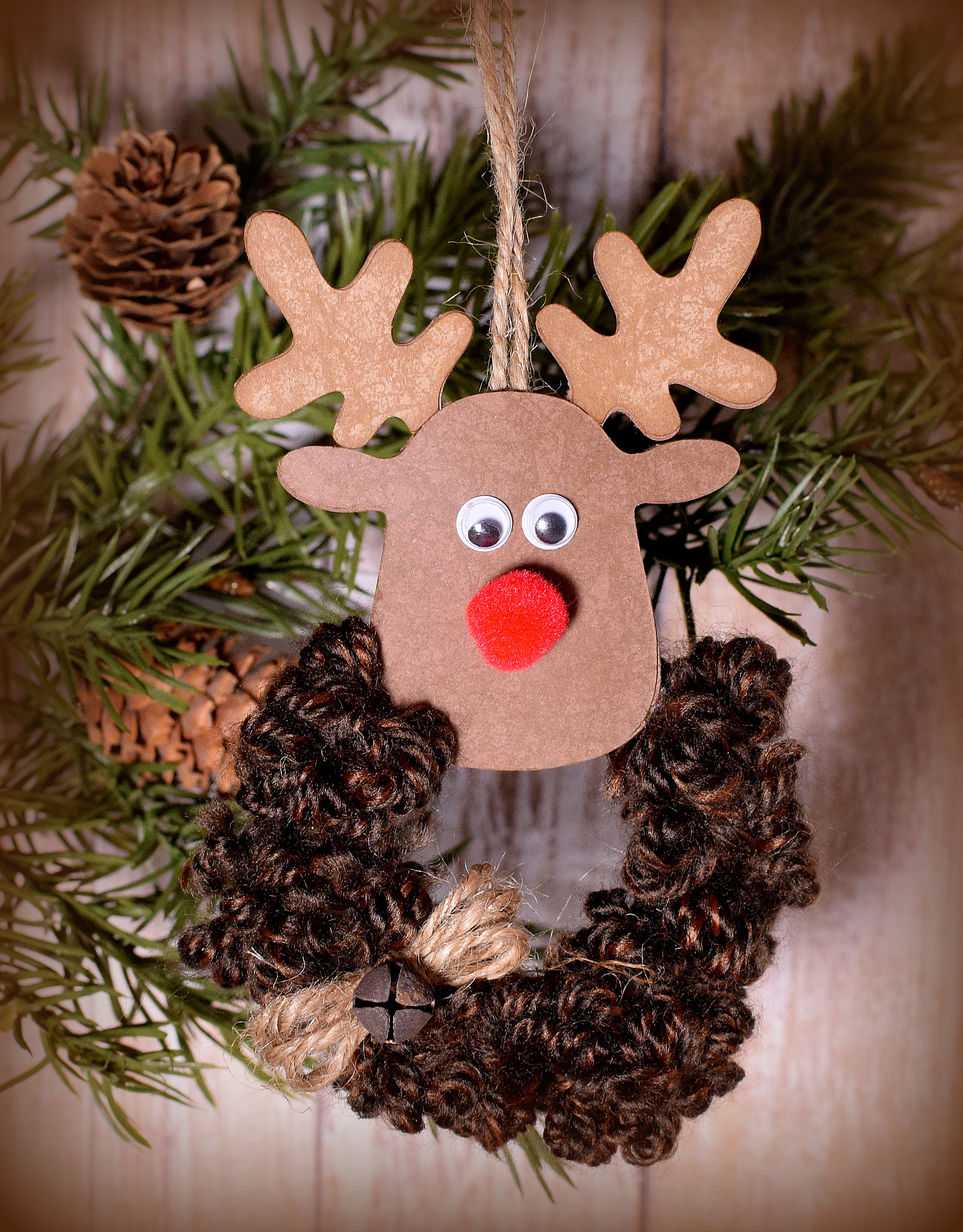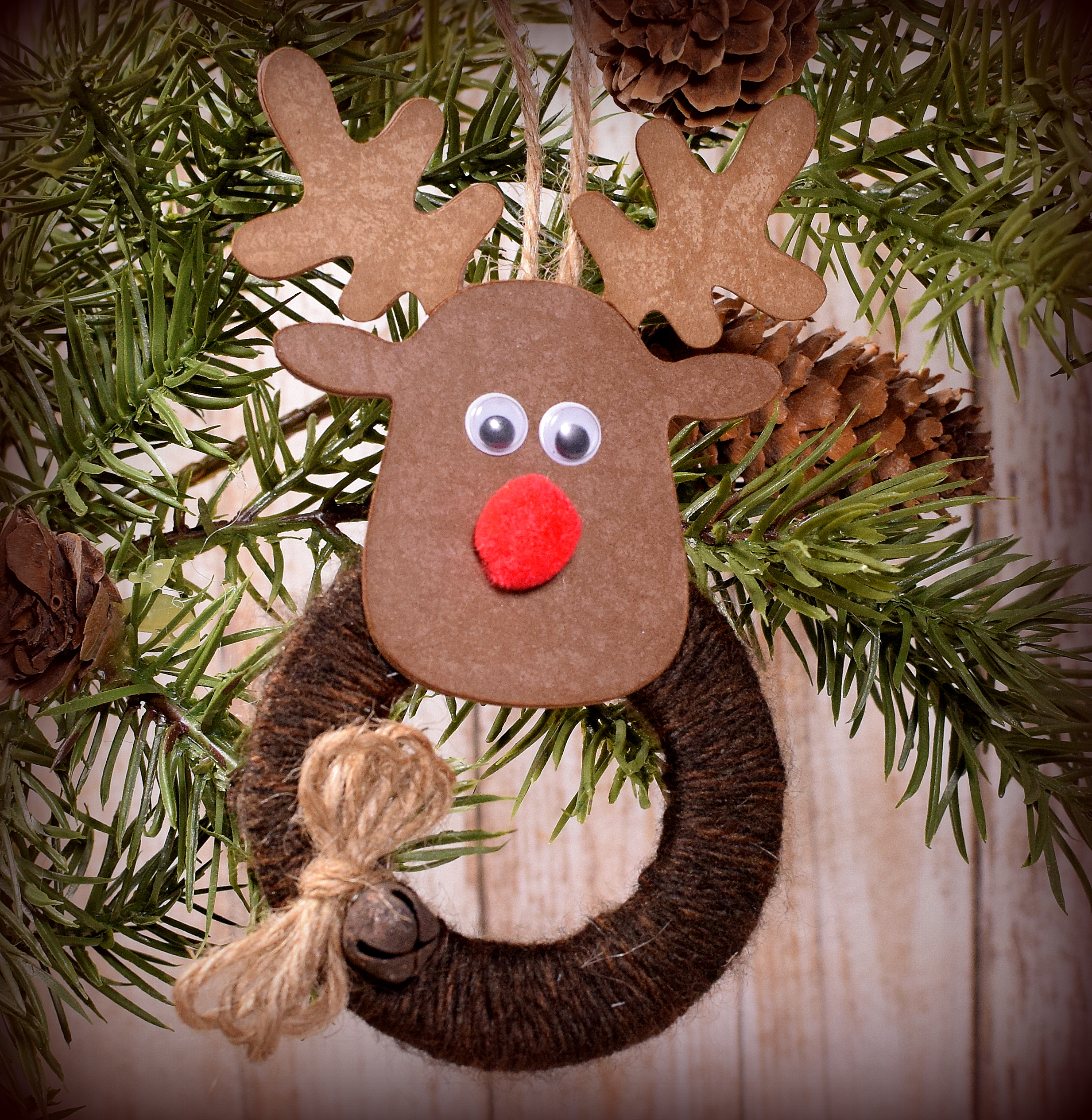 I thought it would be fun to create holiday ornaments that can be used as embellishments on cards. The recipient can choose to leave the ornament on the card or can remove it to hang on a tree if desired.  (The tricky part was to come up with a card design that worked both with and without the ornanent!)  I came up with a few different ornaments/card designs.  This first one has a yarn and die cut reindeer ornament.