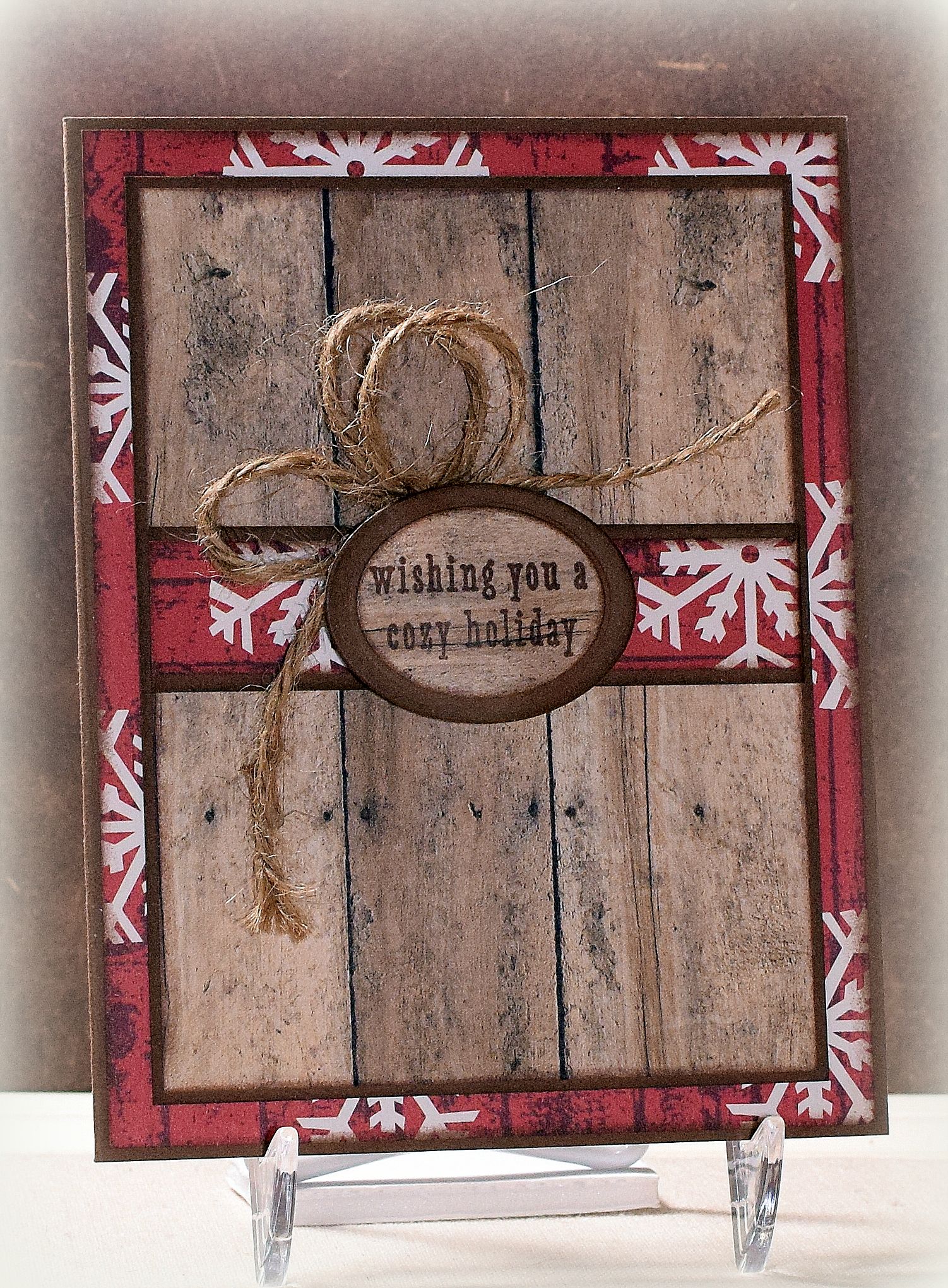 For the A2 card base, I used Recollections Brown heavy weight card stock from the “Coffee and Cream” pack .  The patterned paper was from the Recollections “Cozy Lodge” Christmas paper pack (retired?) and a piece of “Wooden Fence” (#154484) by The Paper Studio (Hobby Lobby).