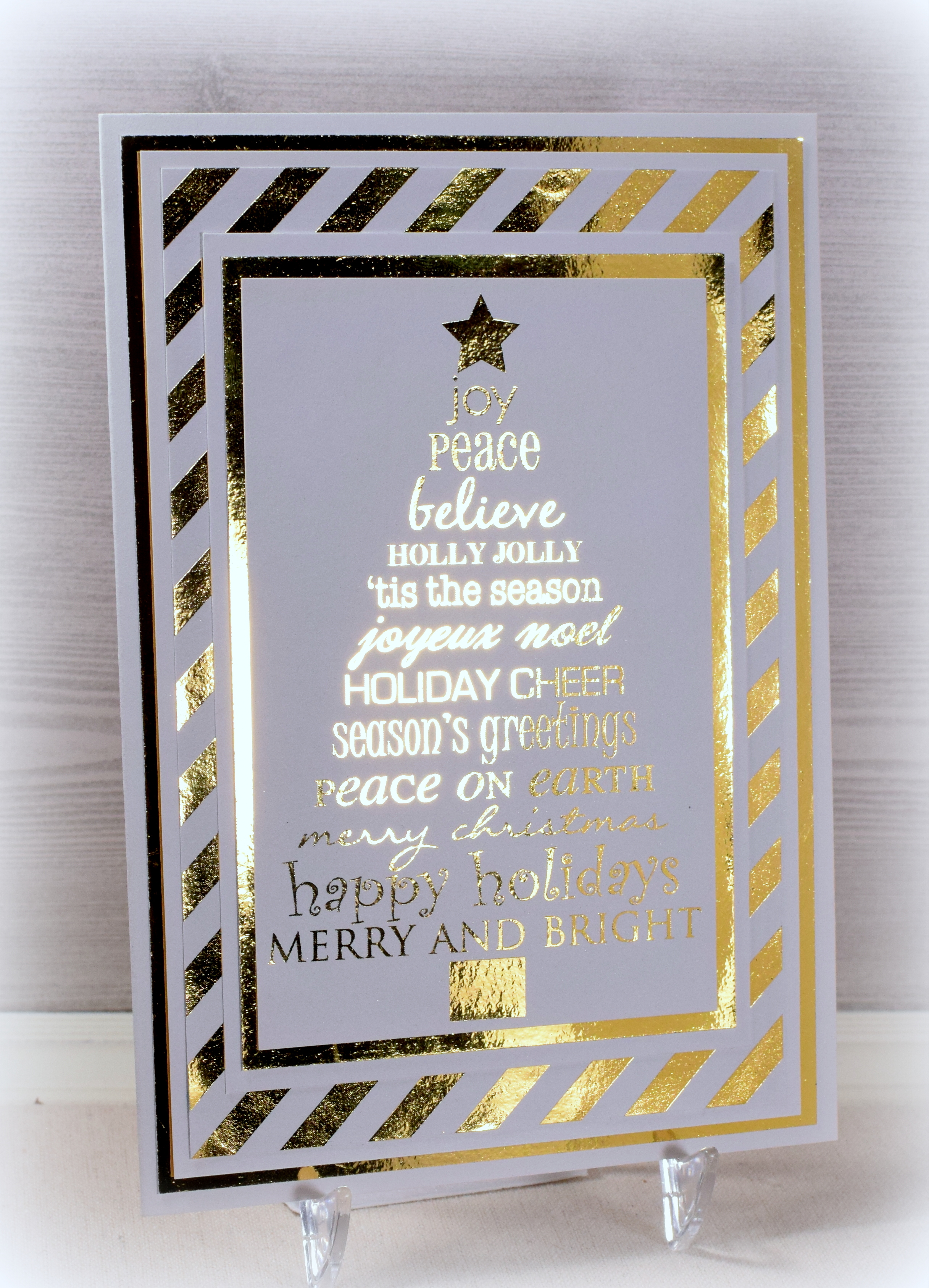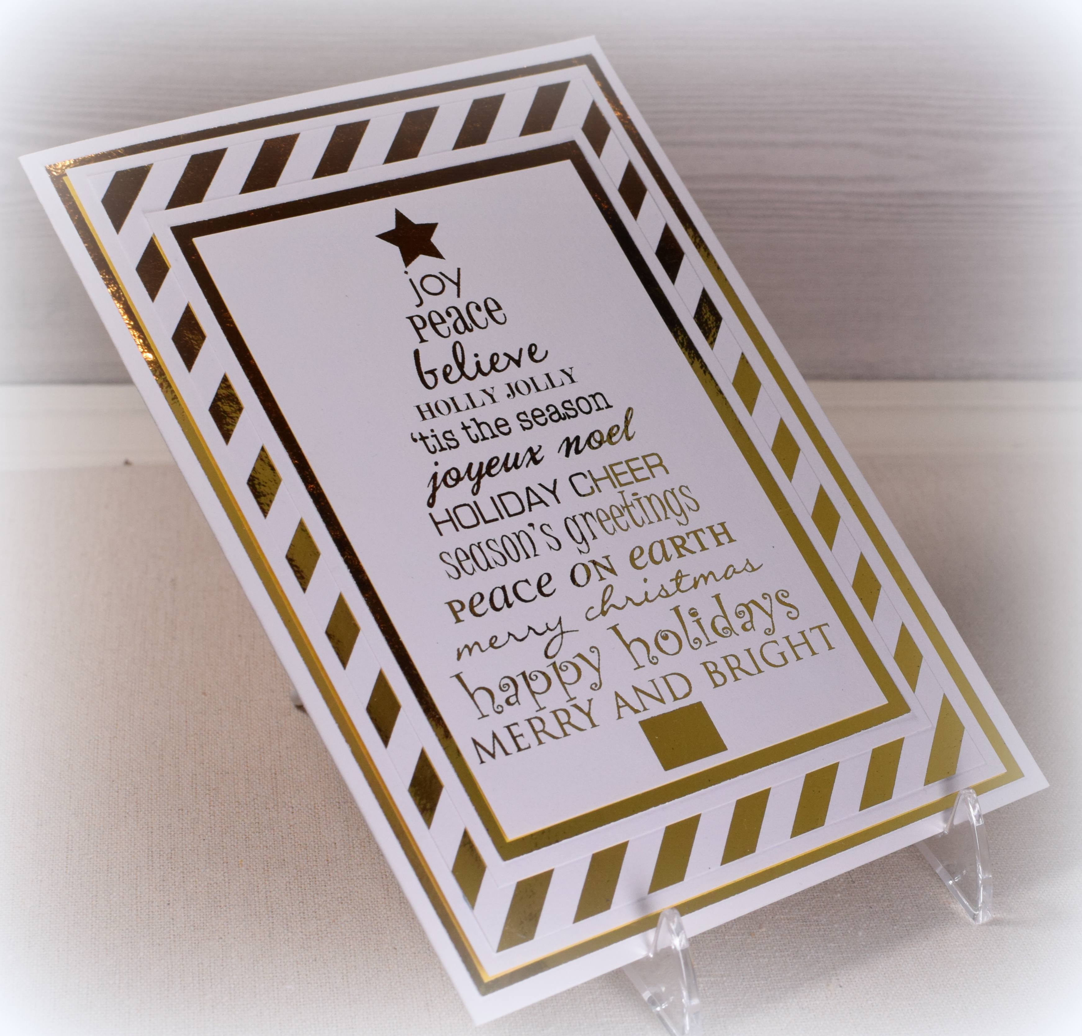 This 5×7 inch card features digital paper/images I purchased on Etsy which is a great place to find material suitable for foiling. Put black and white digital paper (with a key word like Christmas or stripes, etc.) in the search bar, and a bunch of choices pop up. The Christmas Tree Words Digital Clip Art is by The Digital Stash, and the striped background is from the Black and White Classics digital paper pack by Bridget Eubank Designs.