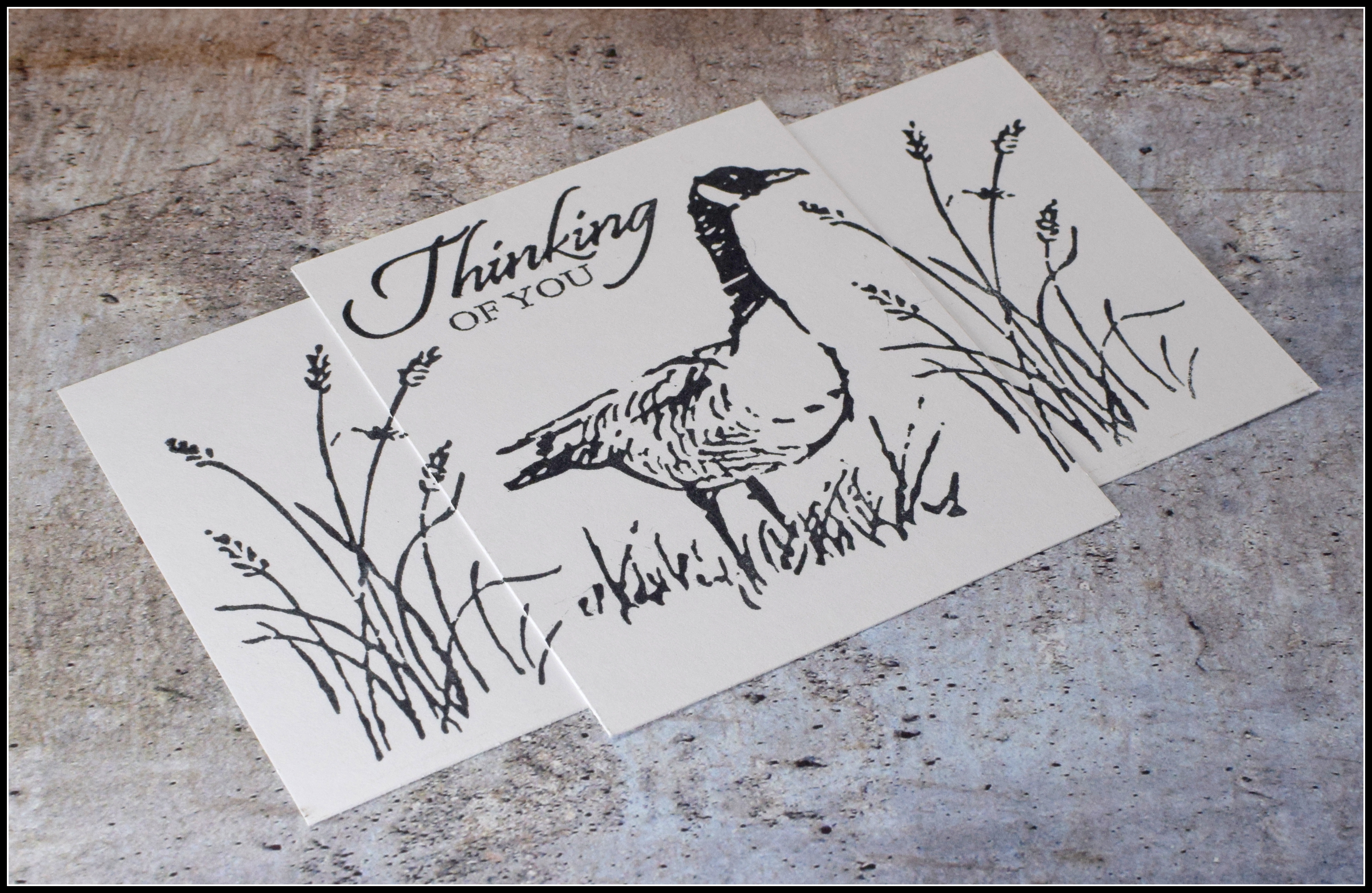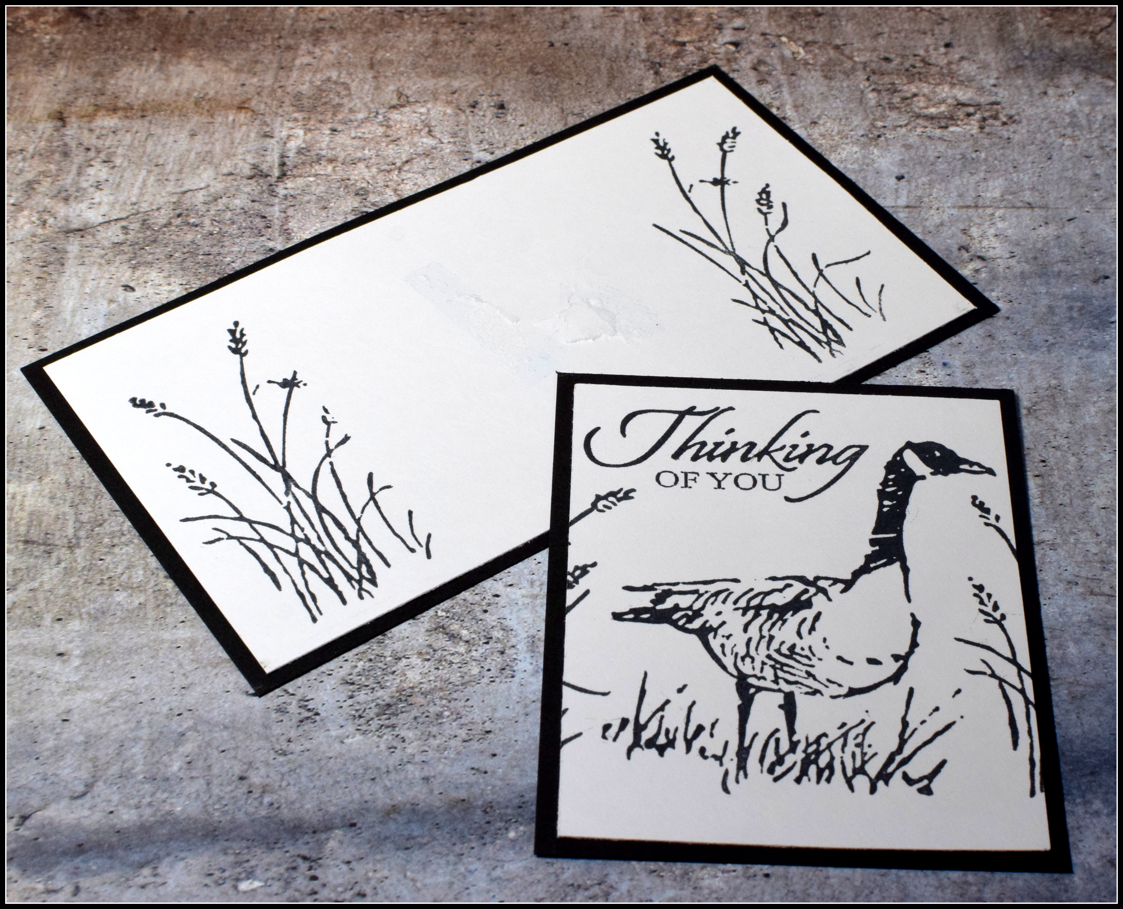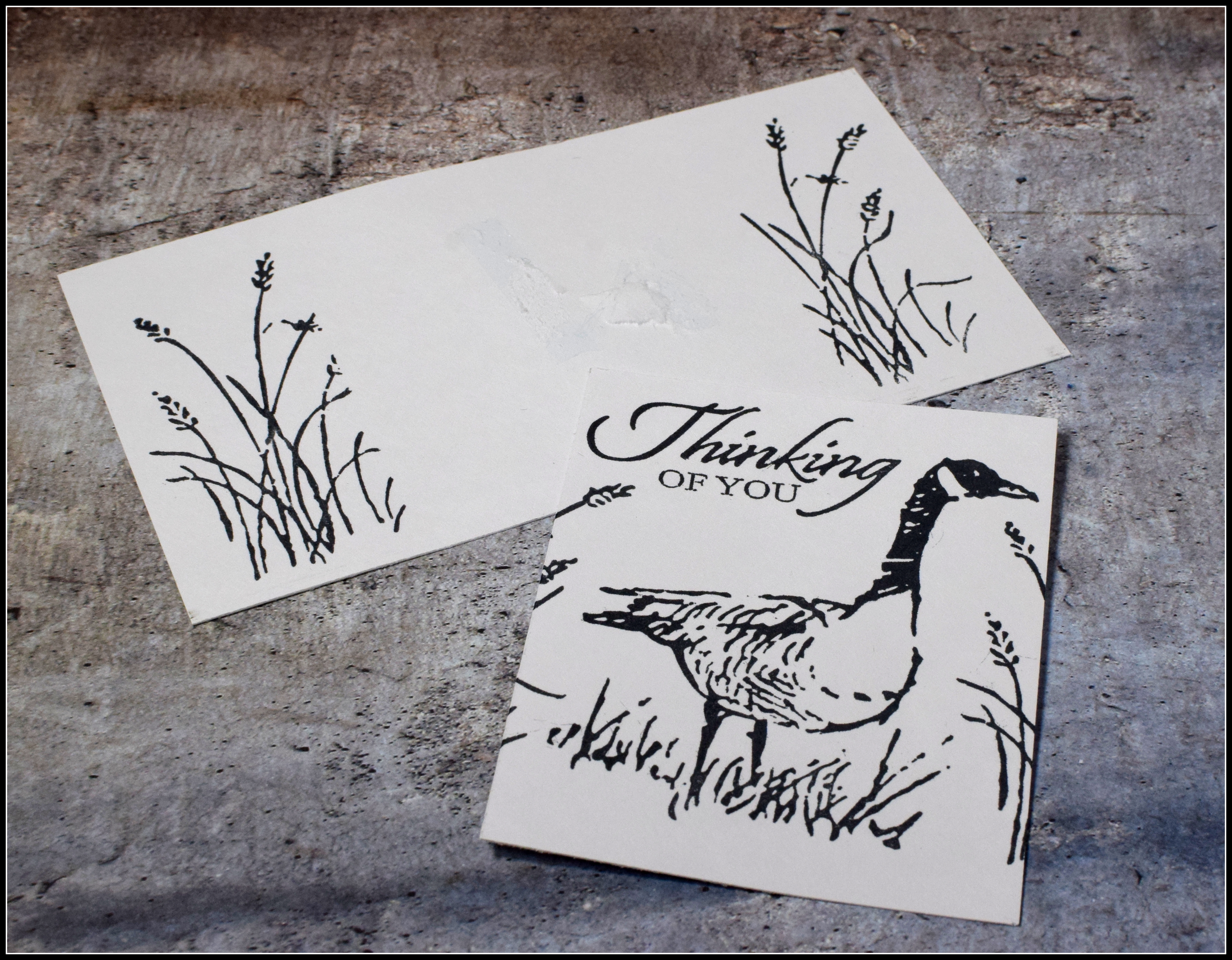 2. Layer and temporarily adhere the panels as desired. (Use removable adhesive behind the panels so it does not interfere with your stamping.) For the goose sample above, I used two white rectangles – one positioned horizontally and the other smaller one positioned vertically and centered on the first. (For the older sample, I used three white rectangles layered and centered from smallest to largest.) Do not add the mats at this point; you are just layering the panels on which you will be stamping.