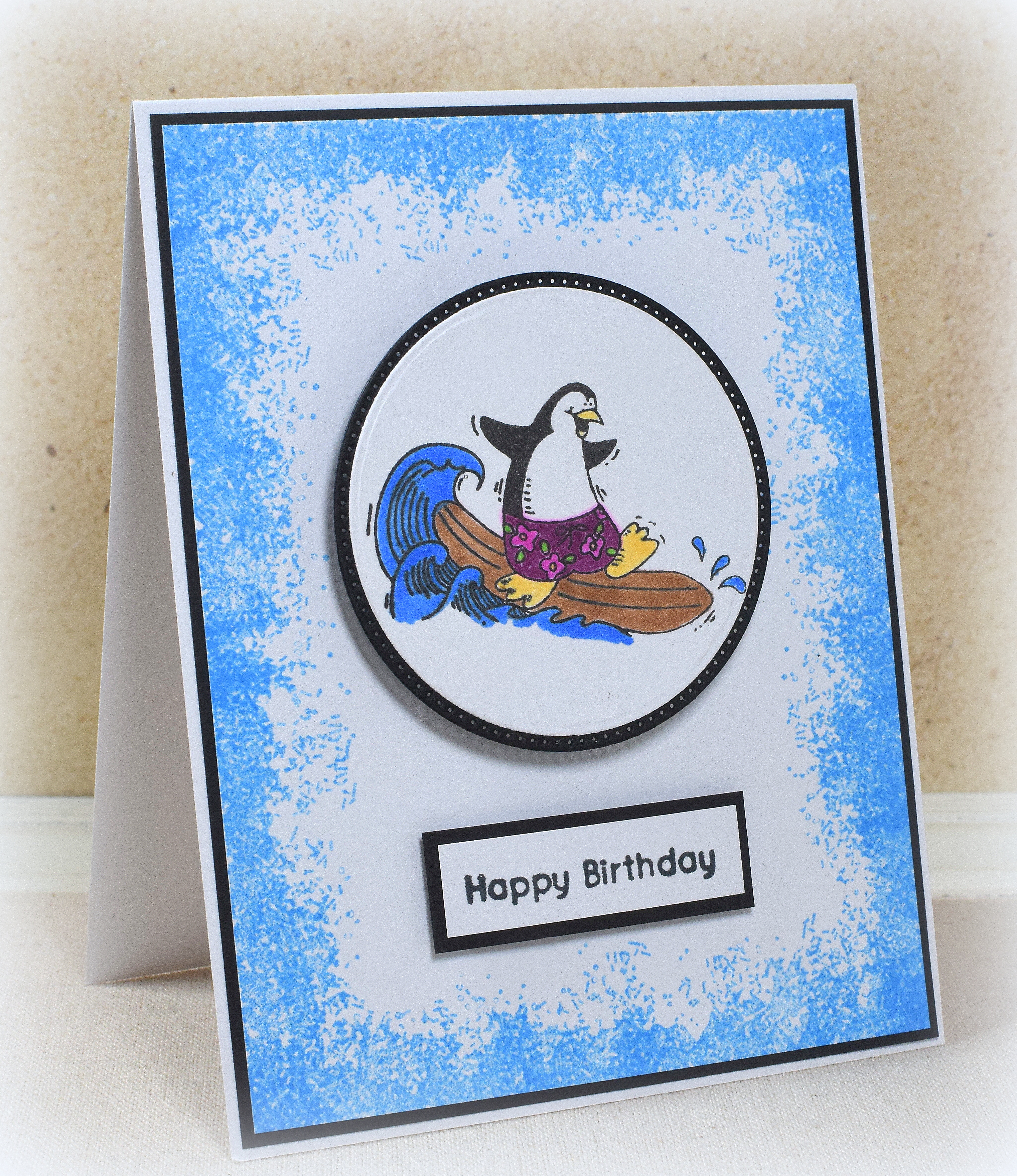 he background border was created with a stamp from the “Timeless Textures” set from Stampin’ Up and was repeatedly stamped with Tim Holtz Salty Ocean distress ink. The penguin image is from the “Penguin Paradise” stamp set (retired?) also from Stampin’ Up. I colored him in using Bic Alcohol Markers.