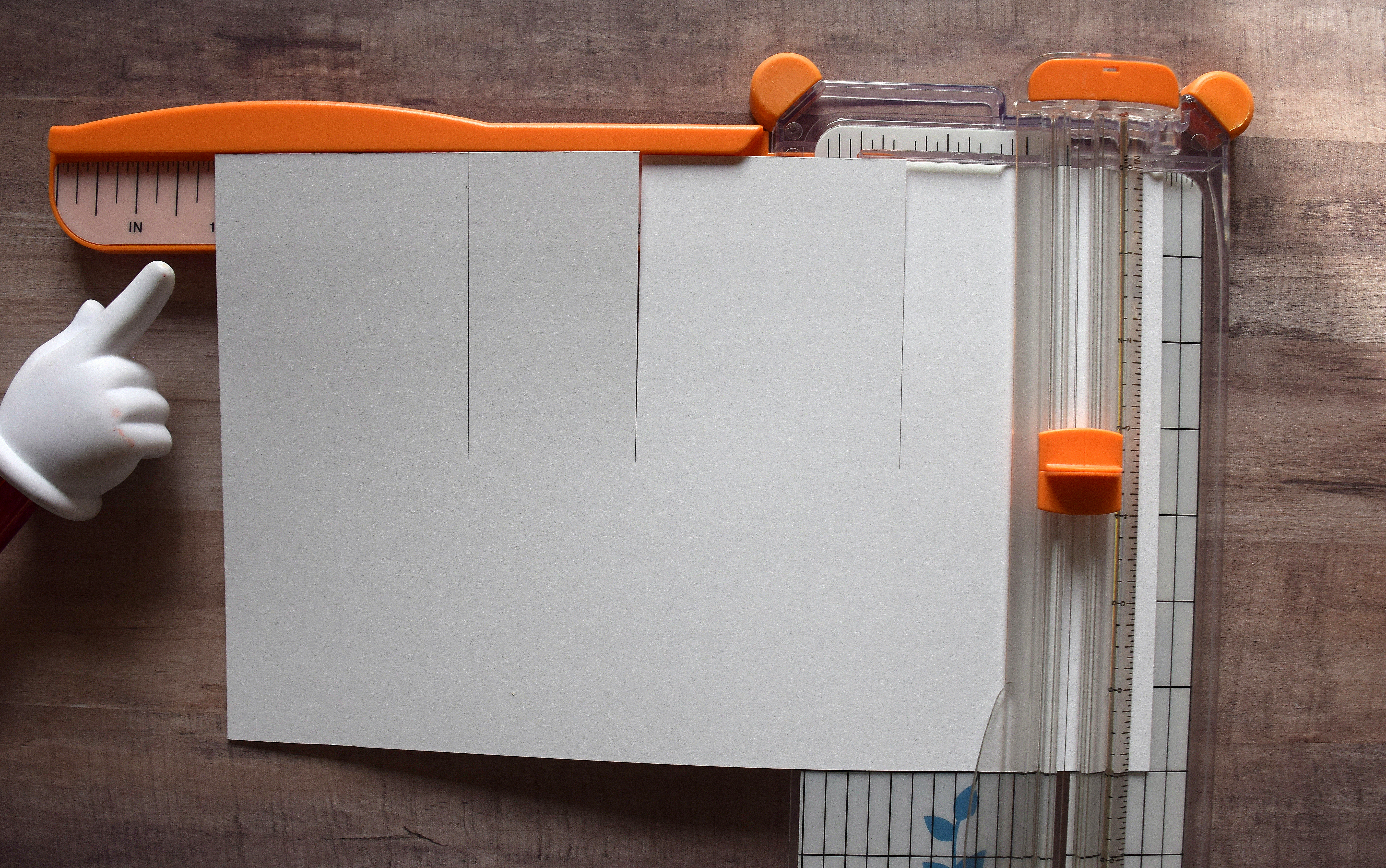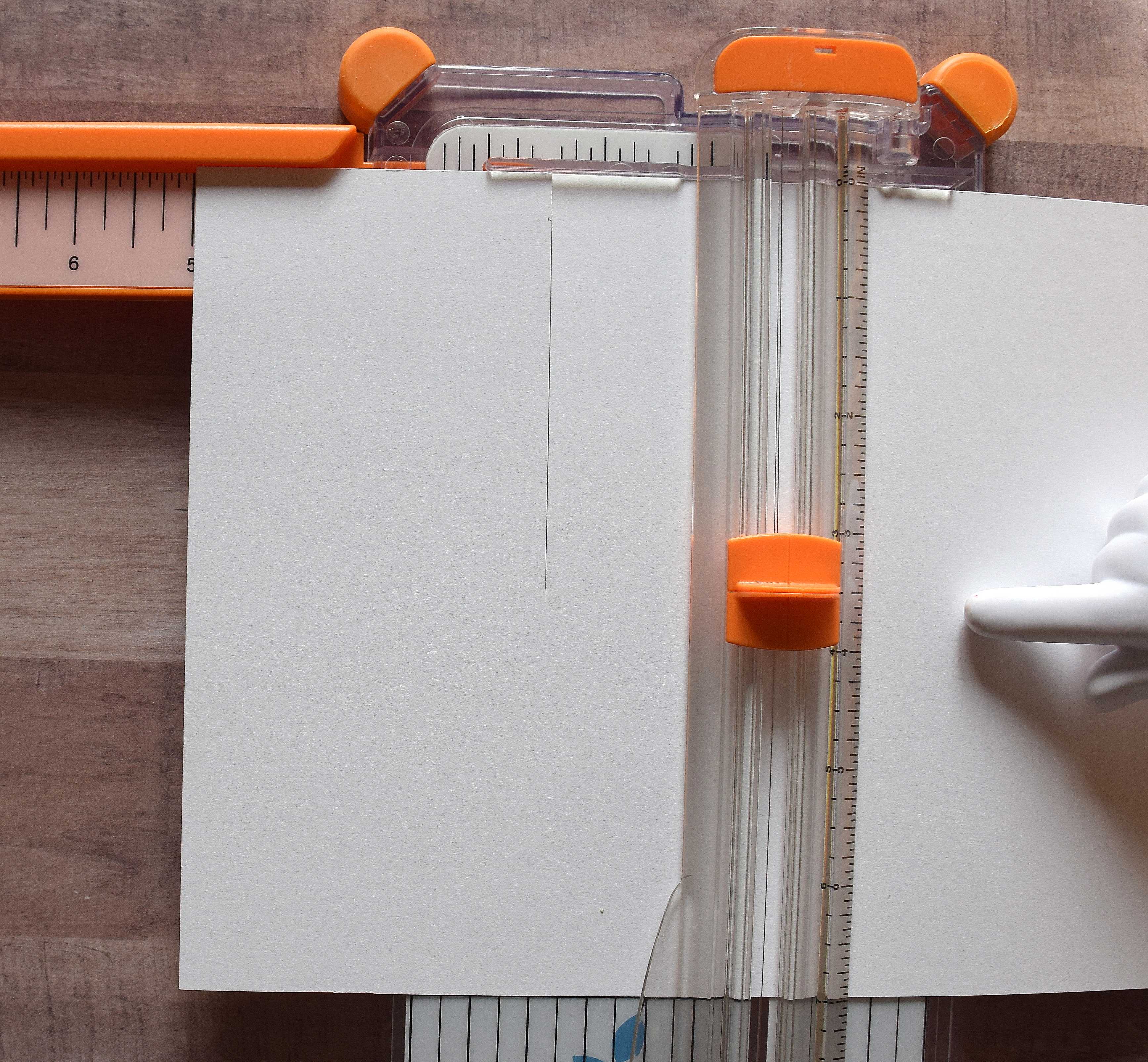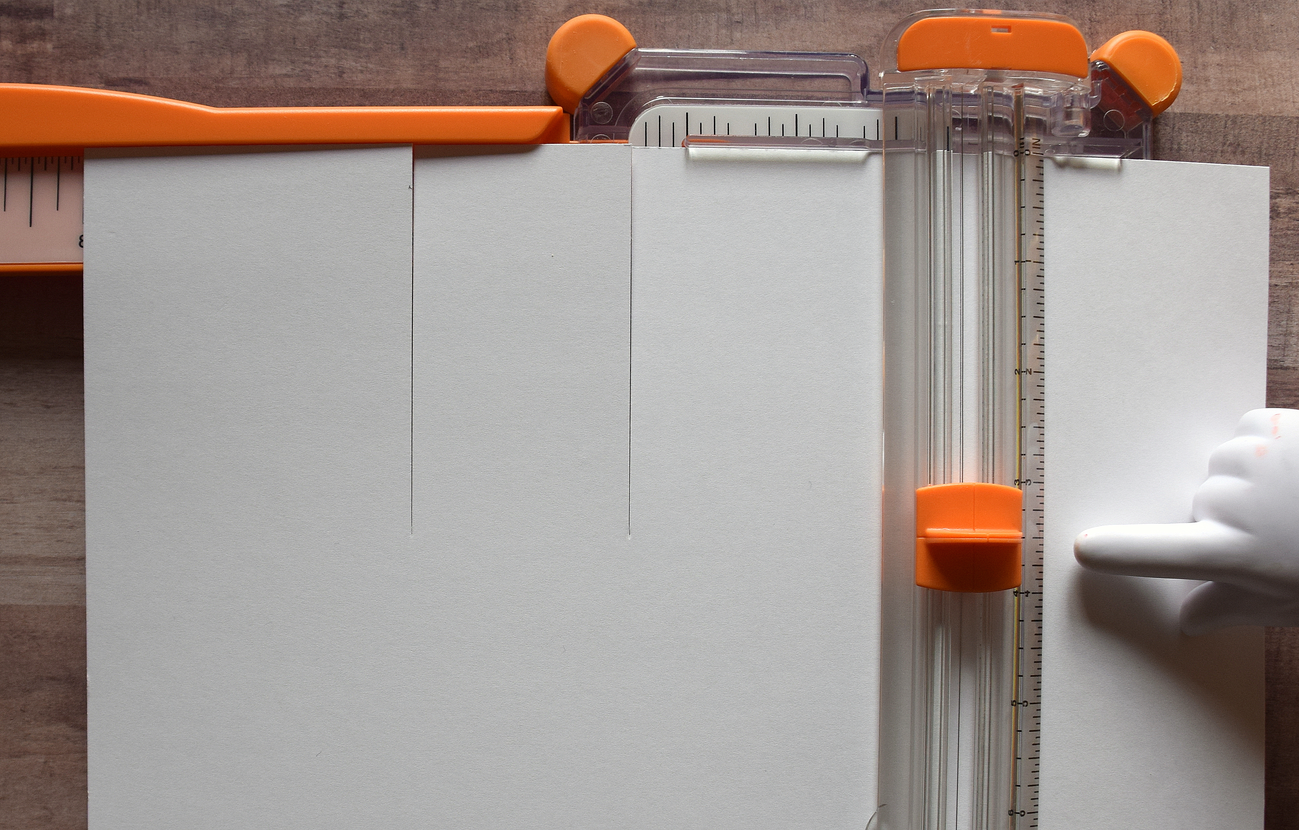 3. Lift “blade guide” ruler (making sure paper does not move). Run bone folder down cutting channel on trimmer (from cut to end of paper).
