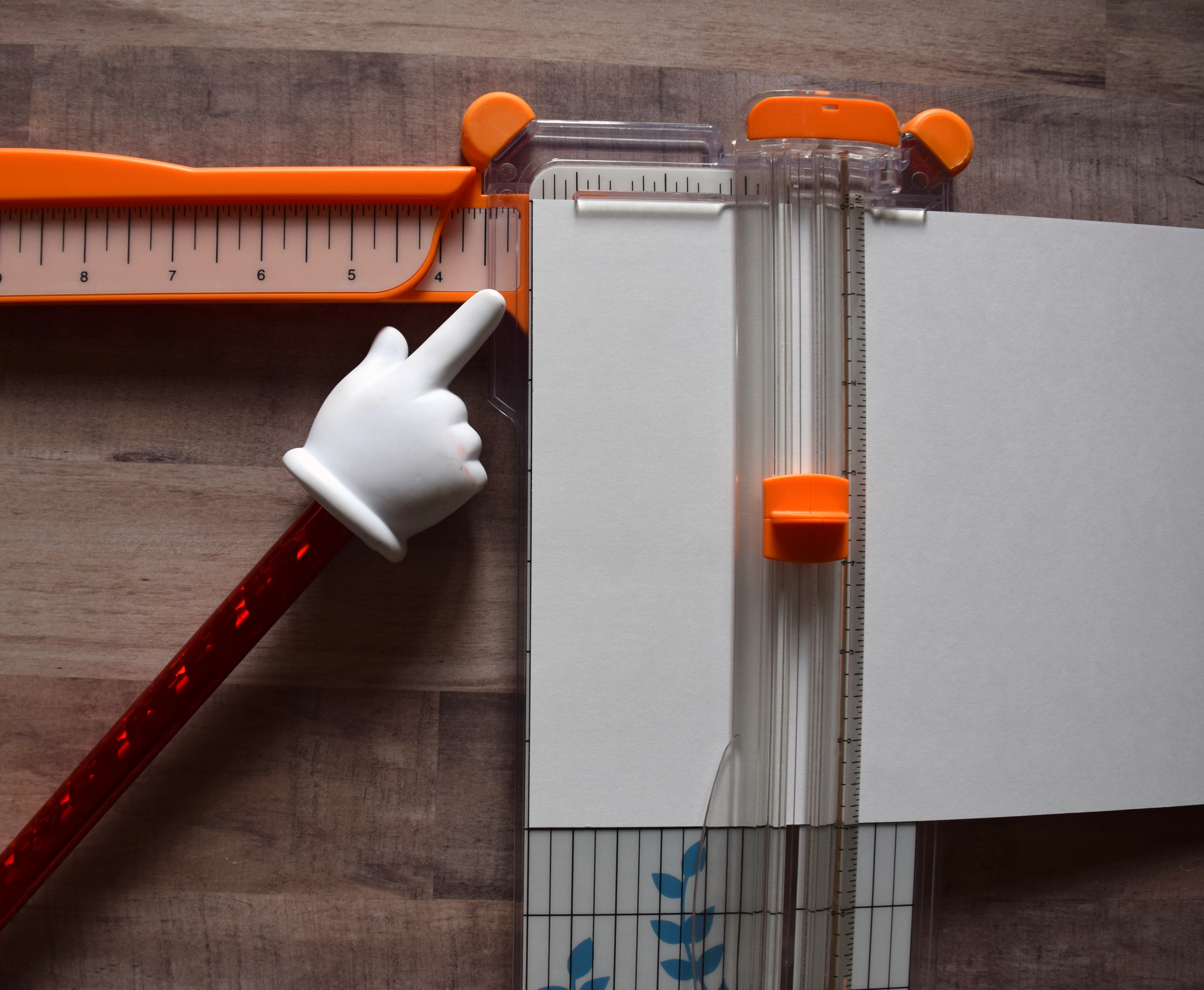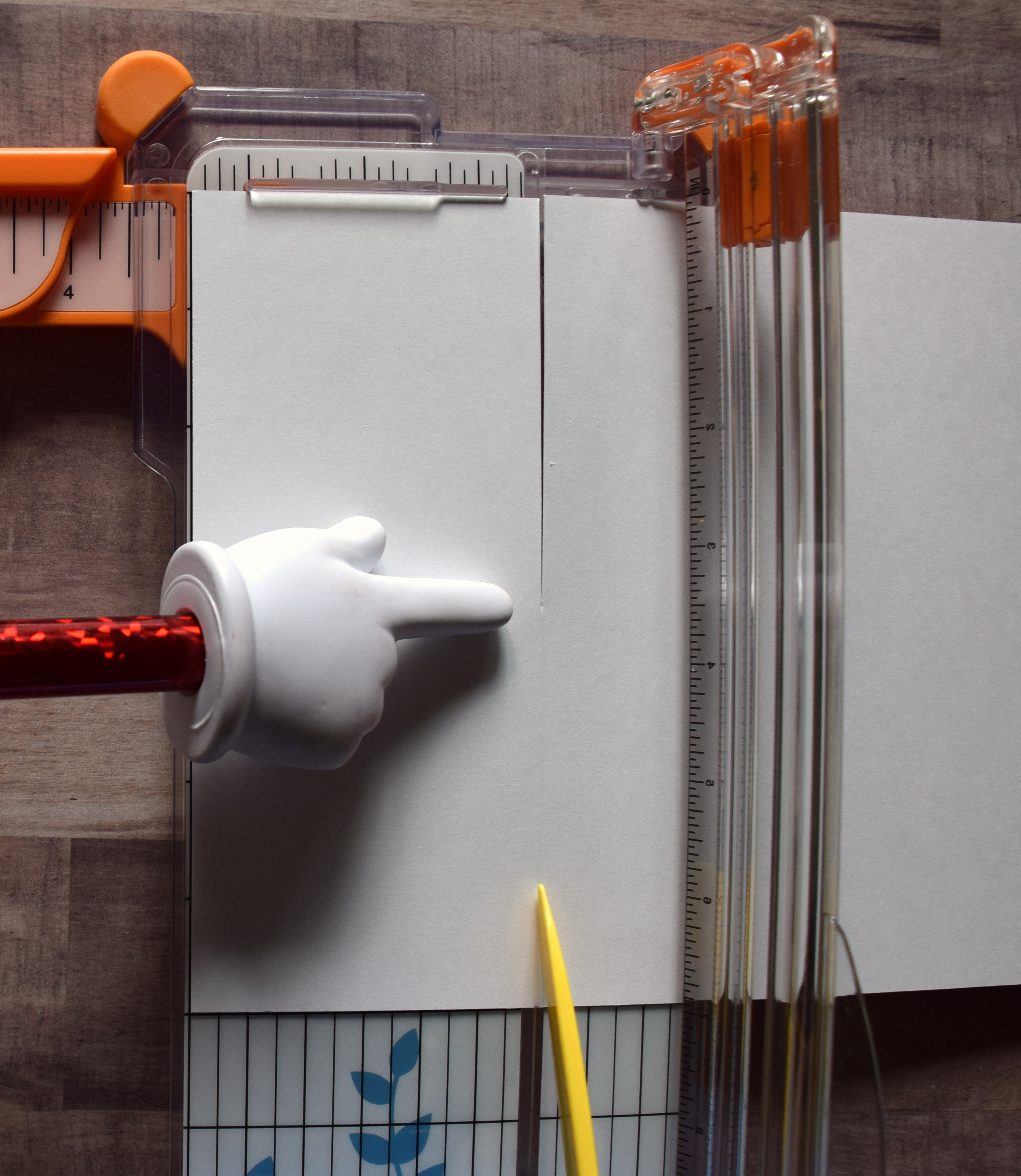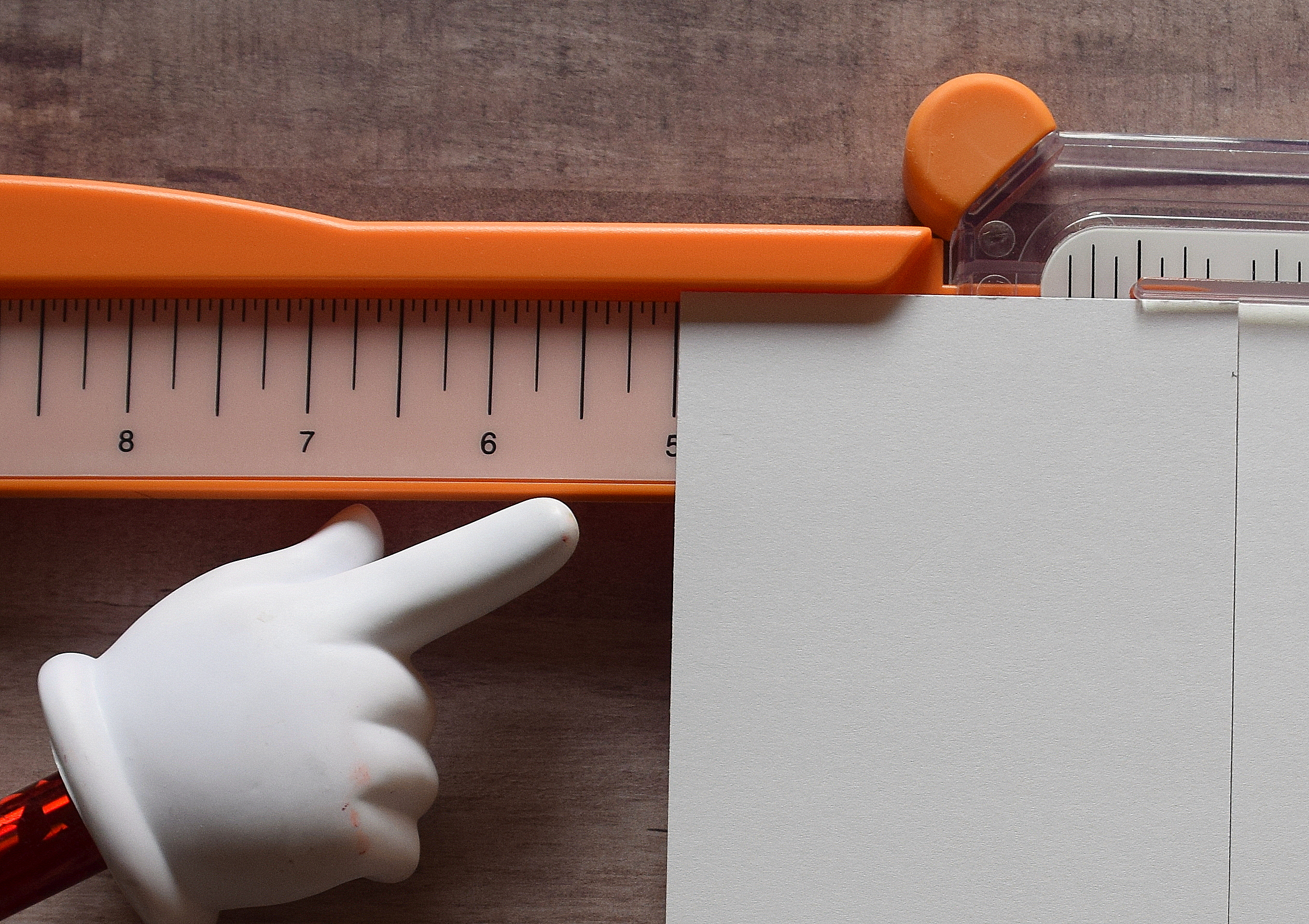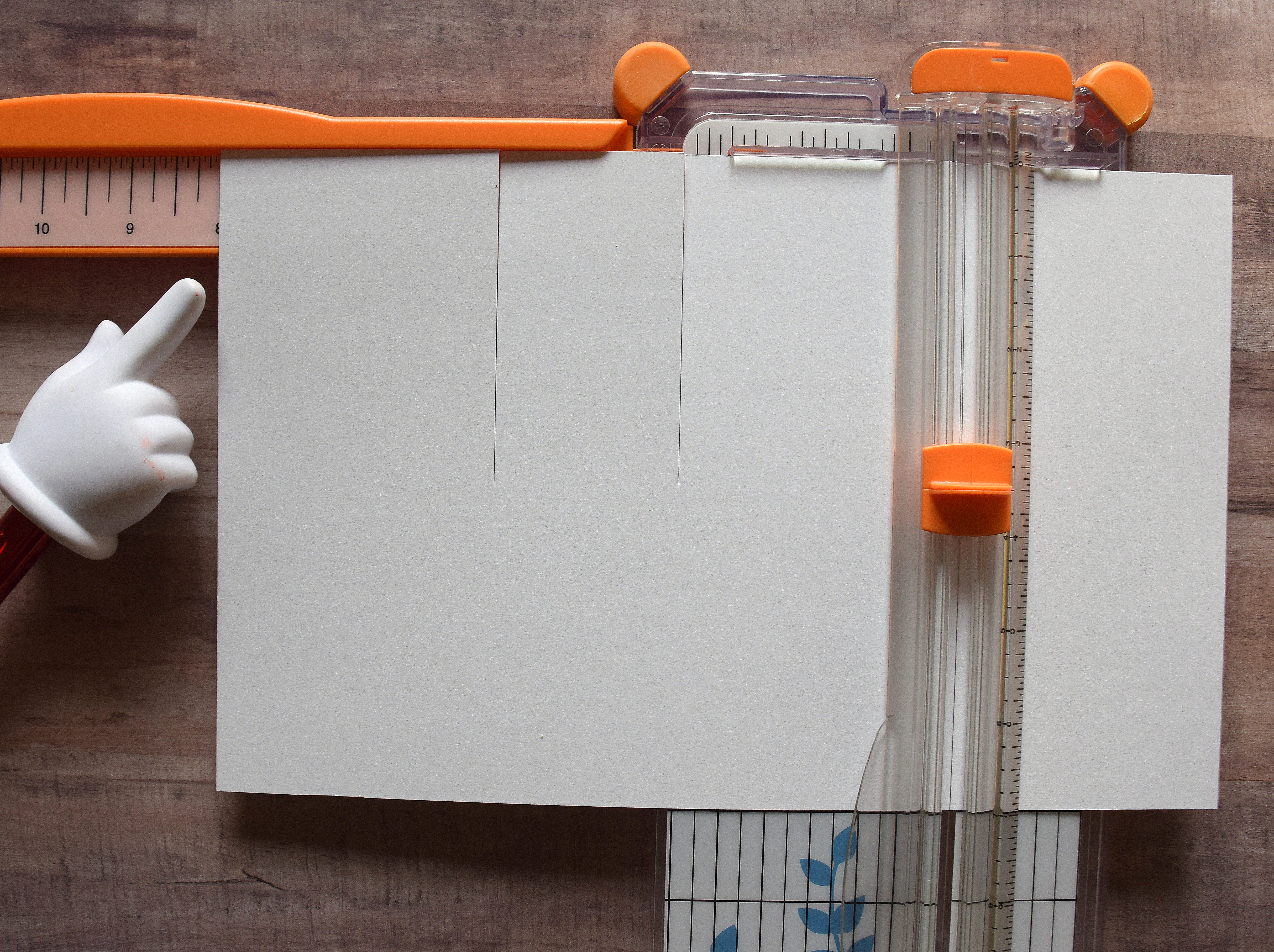 3. Lift “blade guide” ruler (making sure paper does not move). Run bone folder down cutting channel on trimmer (from cut to end of paper).