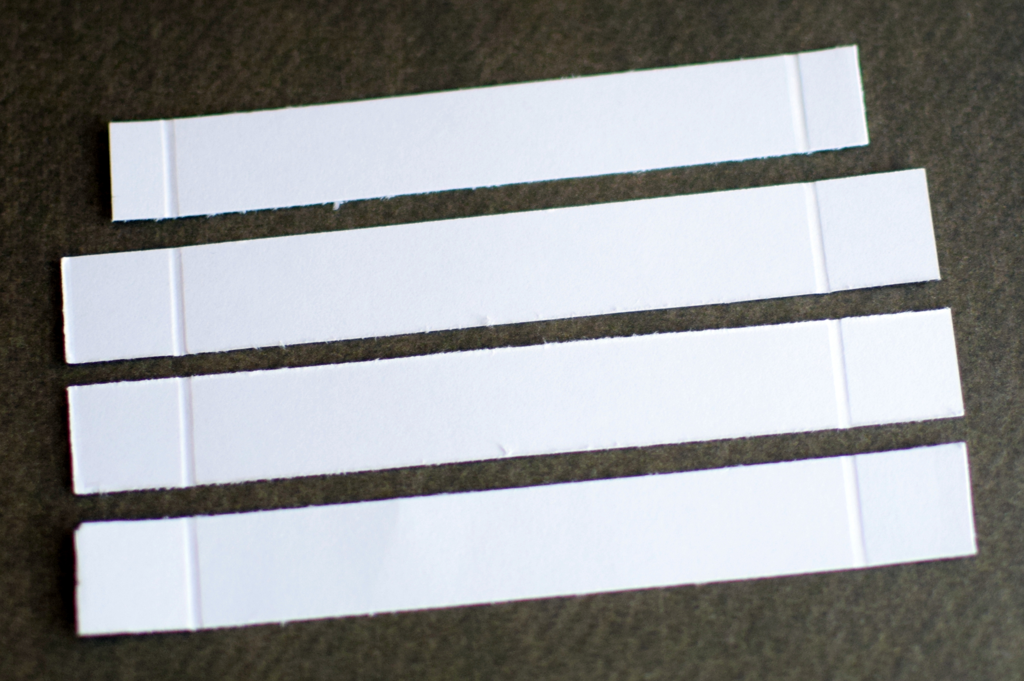 - Score each of the longer strips at 1/2 inch and 3 1/2 inches. (In other words, make a 1/2 inch score line on each end.) Then, score the shorter strip at 1/4 inch and 3 1/4 inch. (In other words, make a 1/4 inch score line on each end.) THIS SHORTER ONE WILL BE THE FRONT BAR.