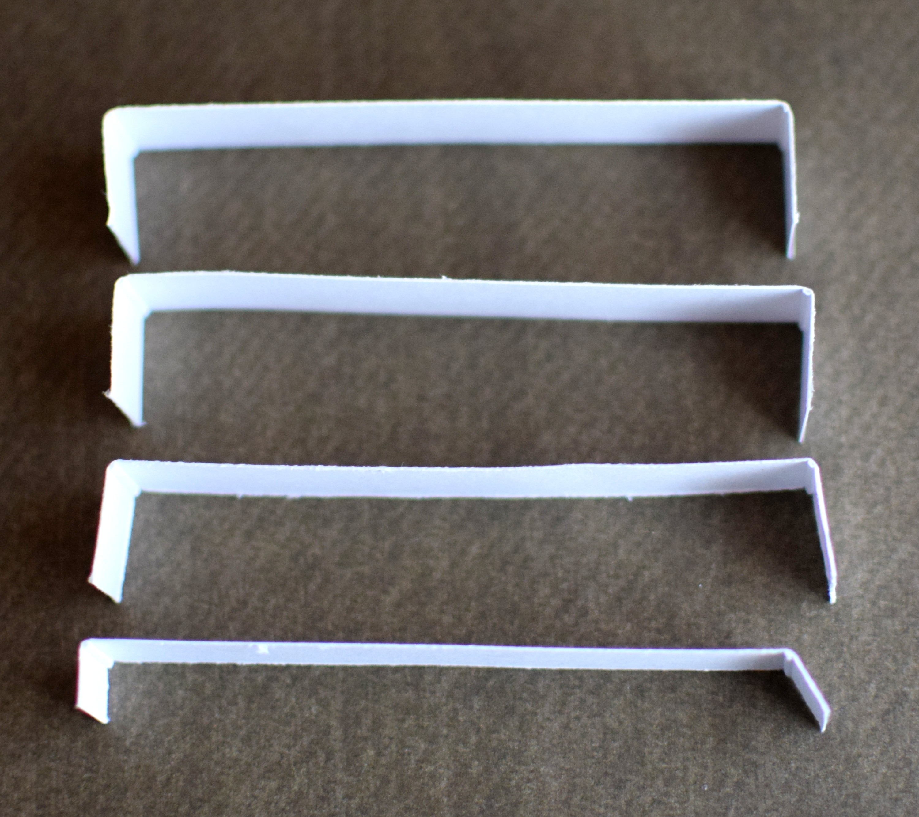 - Cut three 4 inch x 1/2 inch strips, and cut one 3 1/2 inch x 1/2 inch strip.