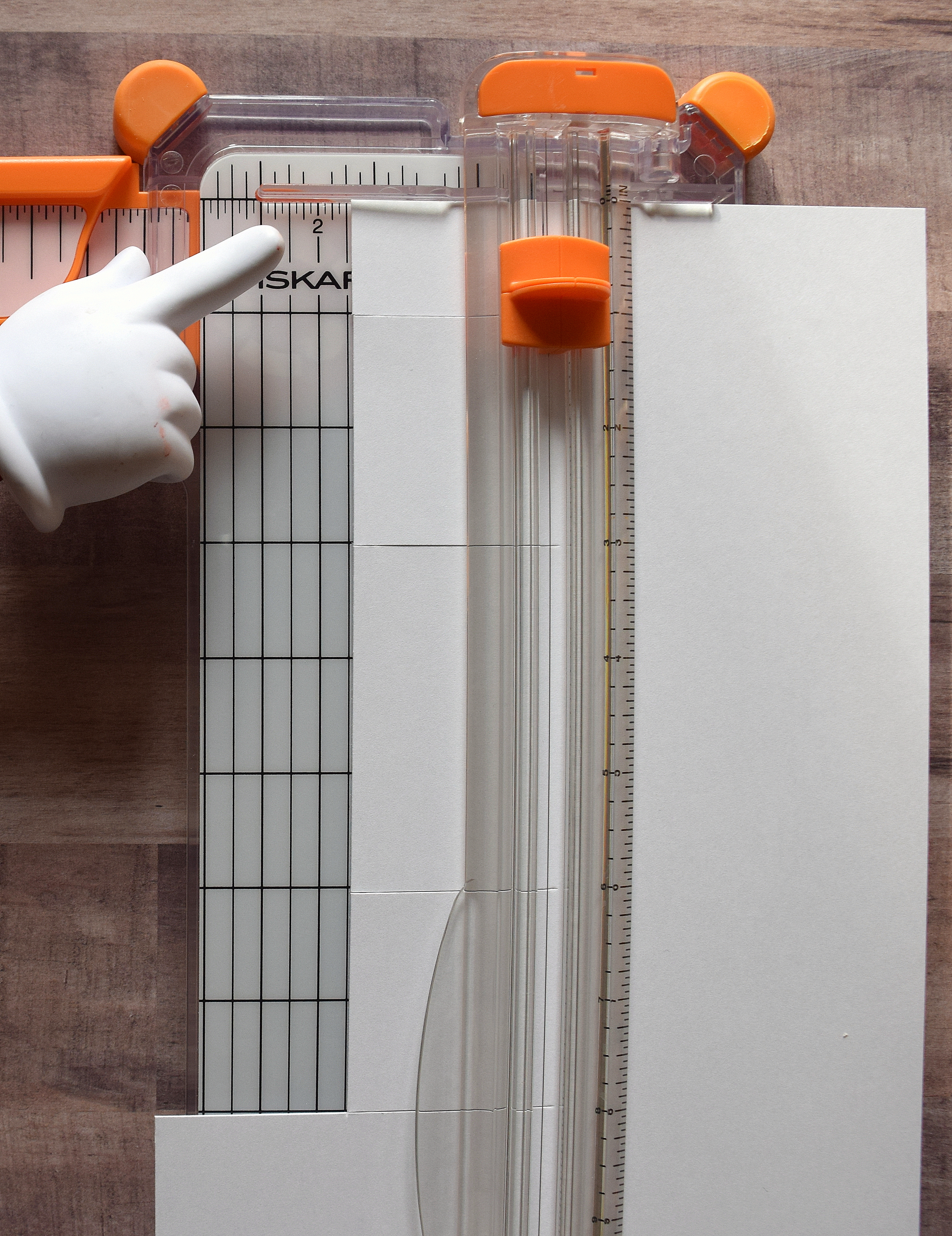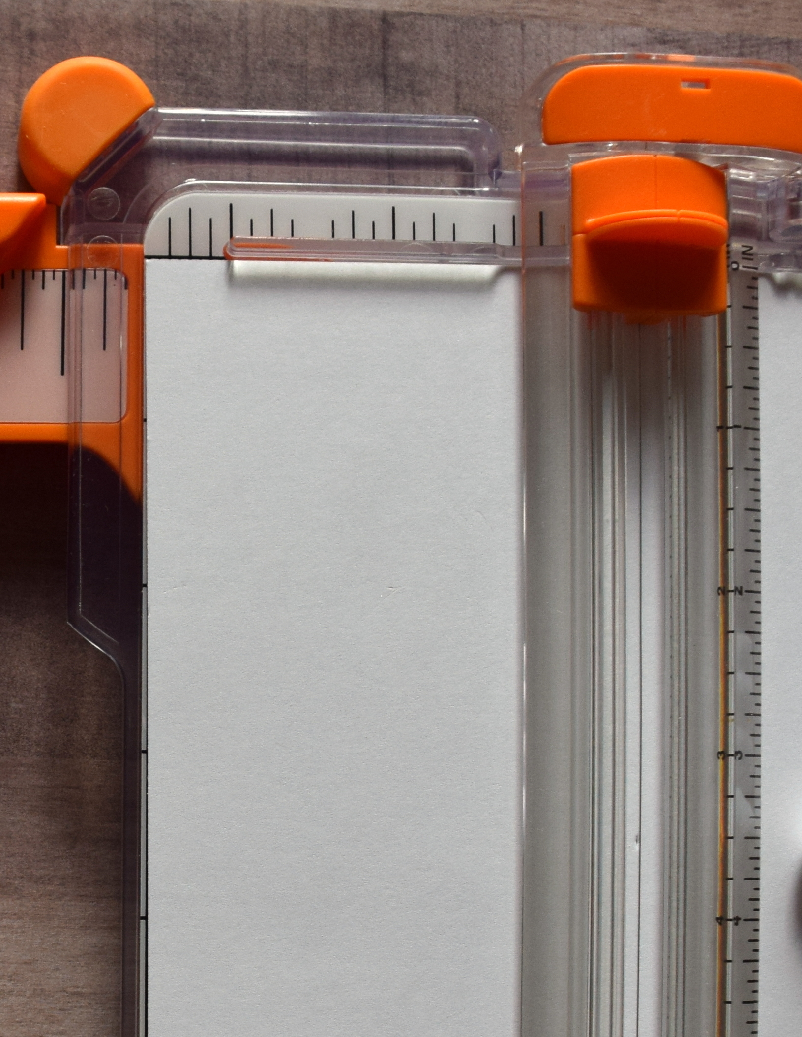 1. Place card stock in trimmer (horizontally/landscape orientation) making sure the top edge of the paper is pushed up against the top edge of the trimmer. Place left corner/edge of paper at 3 inches on top trimmer ruler. (Don’t worry about where the blade is yet.)