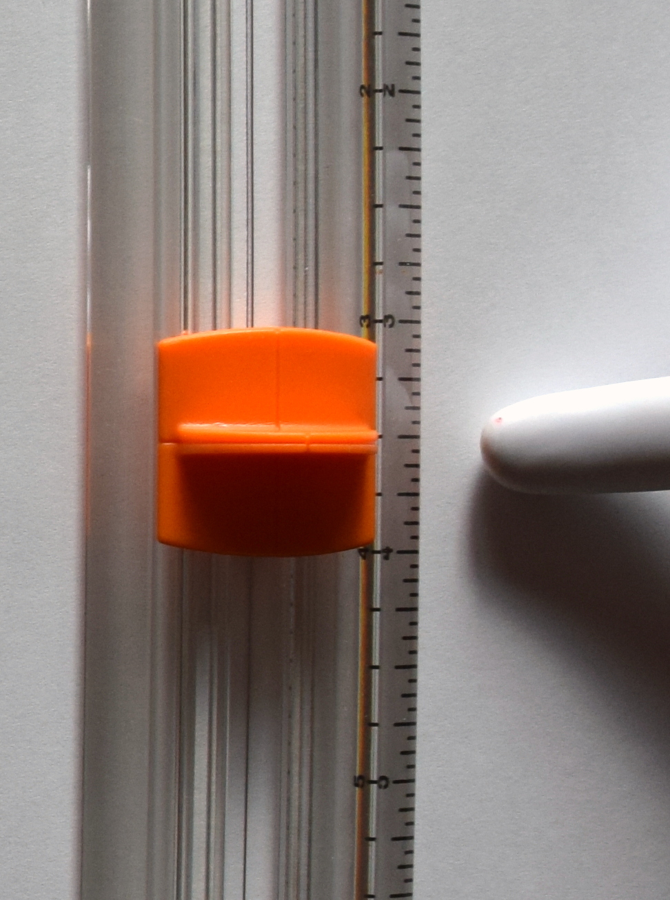 2. Drag blade from top down to the 3 1/2 inch mark on “blade guide” ruler. Use the horizontal lines on the orange blade holder and ruler on the guide to see when to stop.