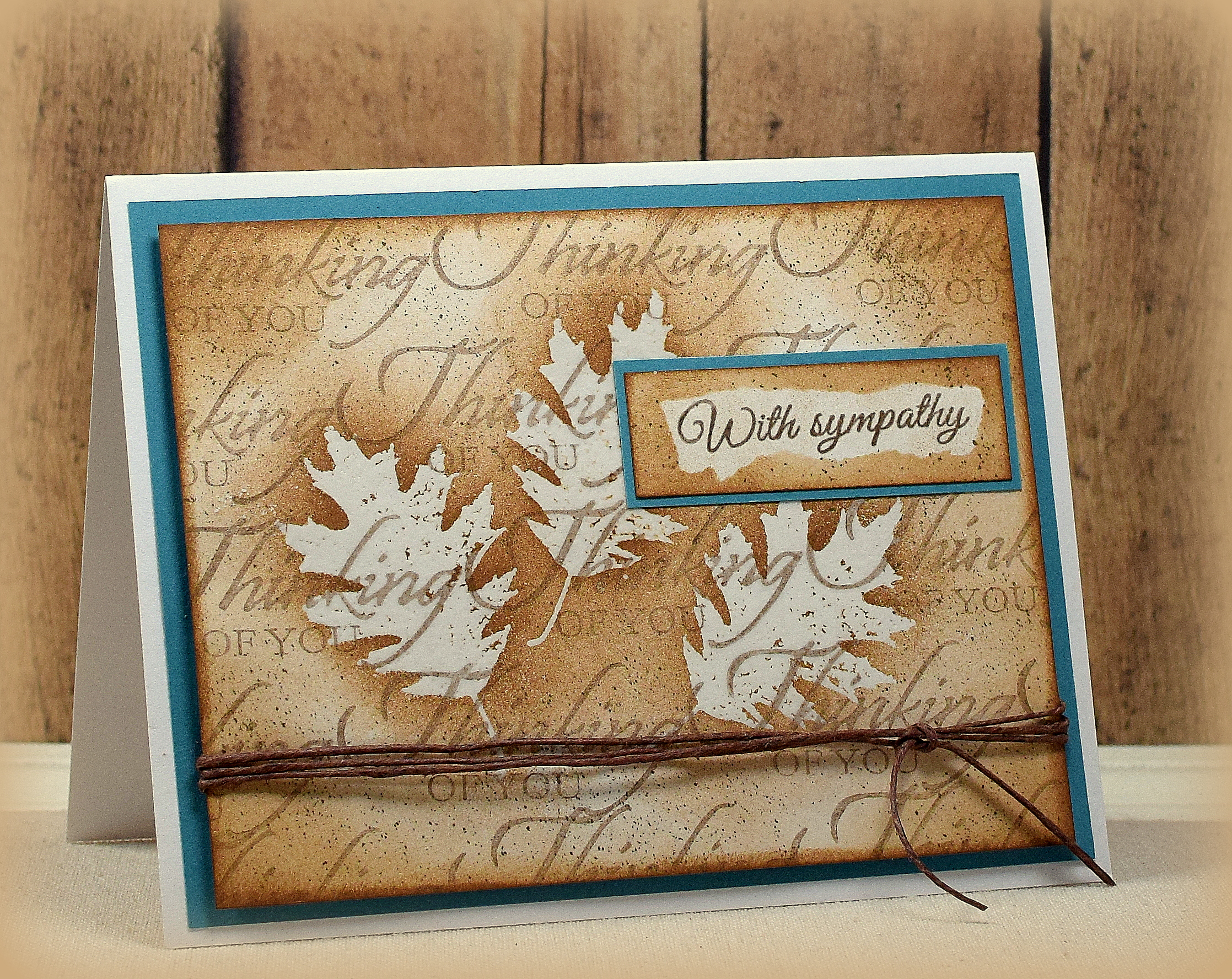 To achieve this look, I started by repeatedly stamping a greeting on the white background panel with Memento Rich Cocoa ink. Then, I stamped the leaves with versamark ink, added clear embossing powder, and heat set them. Once cooled, I sponged Tim Holtz Vintage Photo distress ink (with varying pressure) over the embossed leaf images and around the edges of the panel. The embossed areas resisted the ink allowing the stamped background words to show through. Sponging over these leaves also caused the area around the leaves to be highlighted.