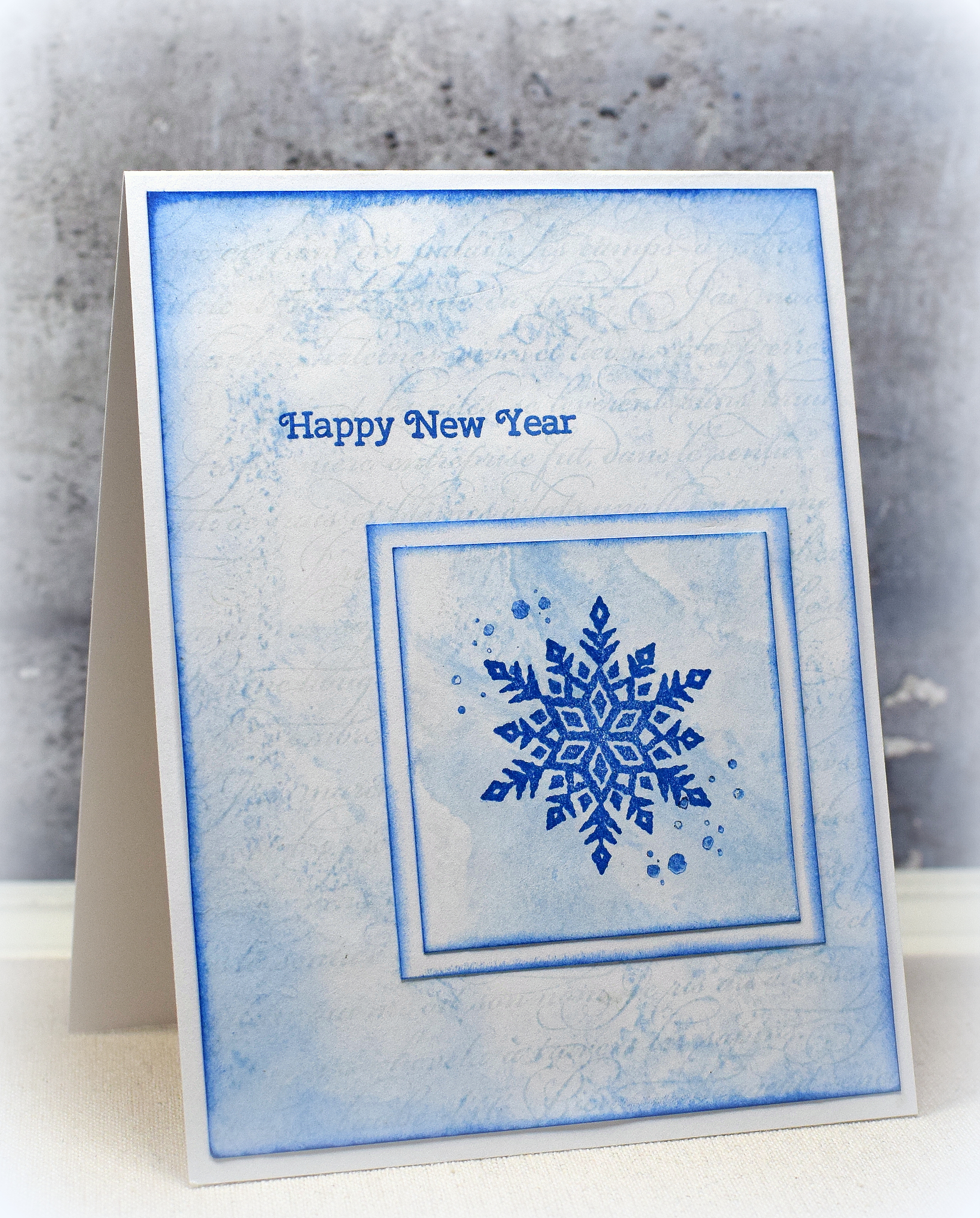 “French Script” from Stampin’ Up (retired) was used behind the “smooshed” background. The splatters are from the SU “Timeless Textures” set. I used Memento Rich Cocoa and Desert Sand or Summer Sky and Blue Danube for these samples.