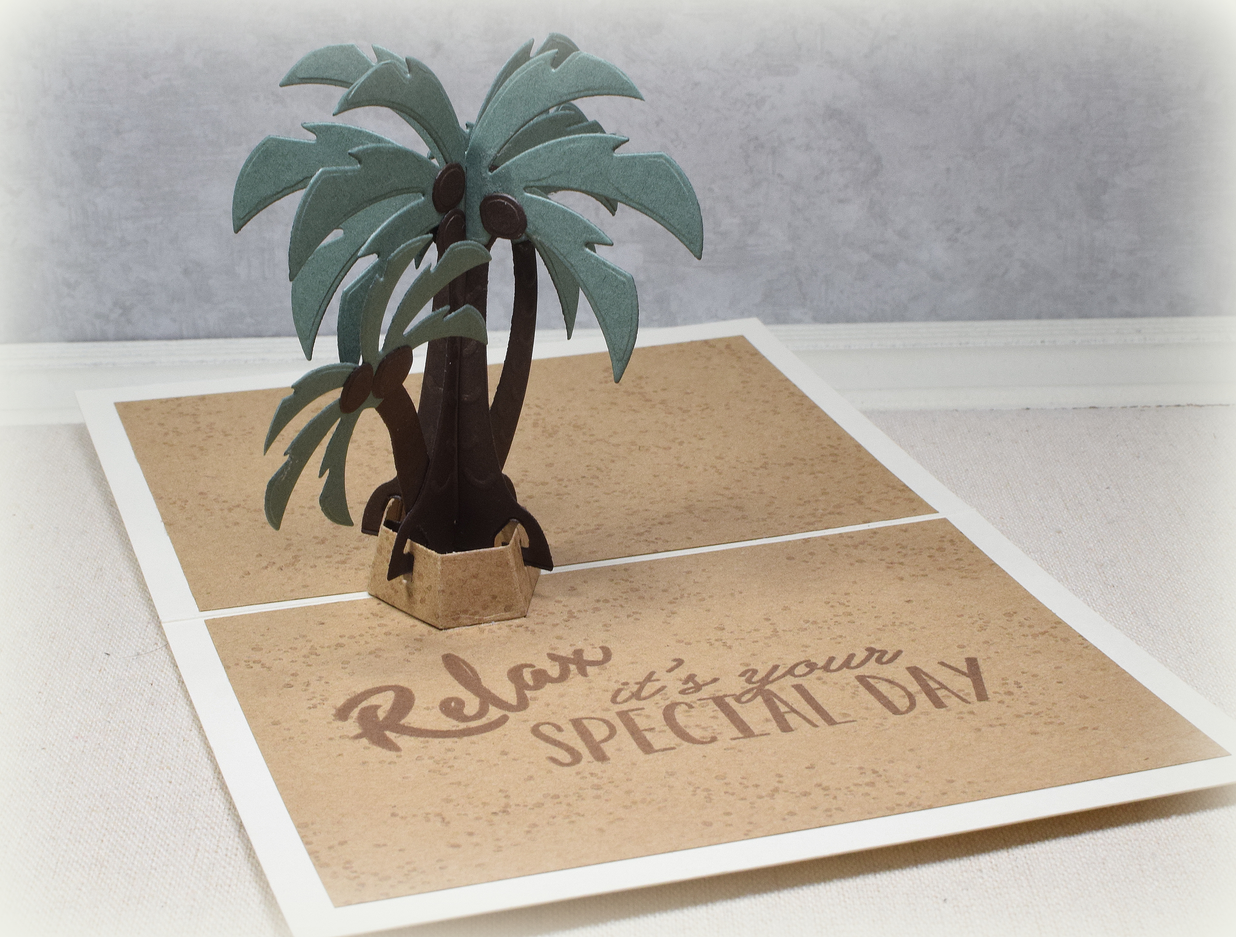In addition to the dies for the palm tree that pops up, there are dies to create a slightly smaller (flat) palm tree which could be glued to the pop-up tree to create a cluster (I added two to my pop-up tree) and could also be used alone to decorate the card front or any other flat card panel.