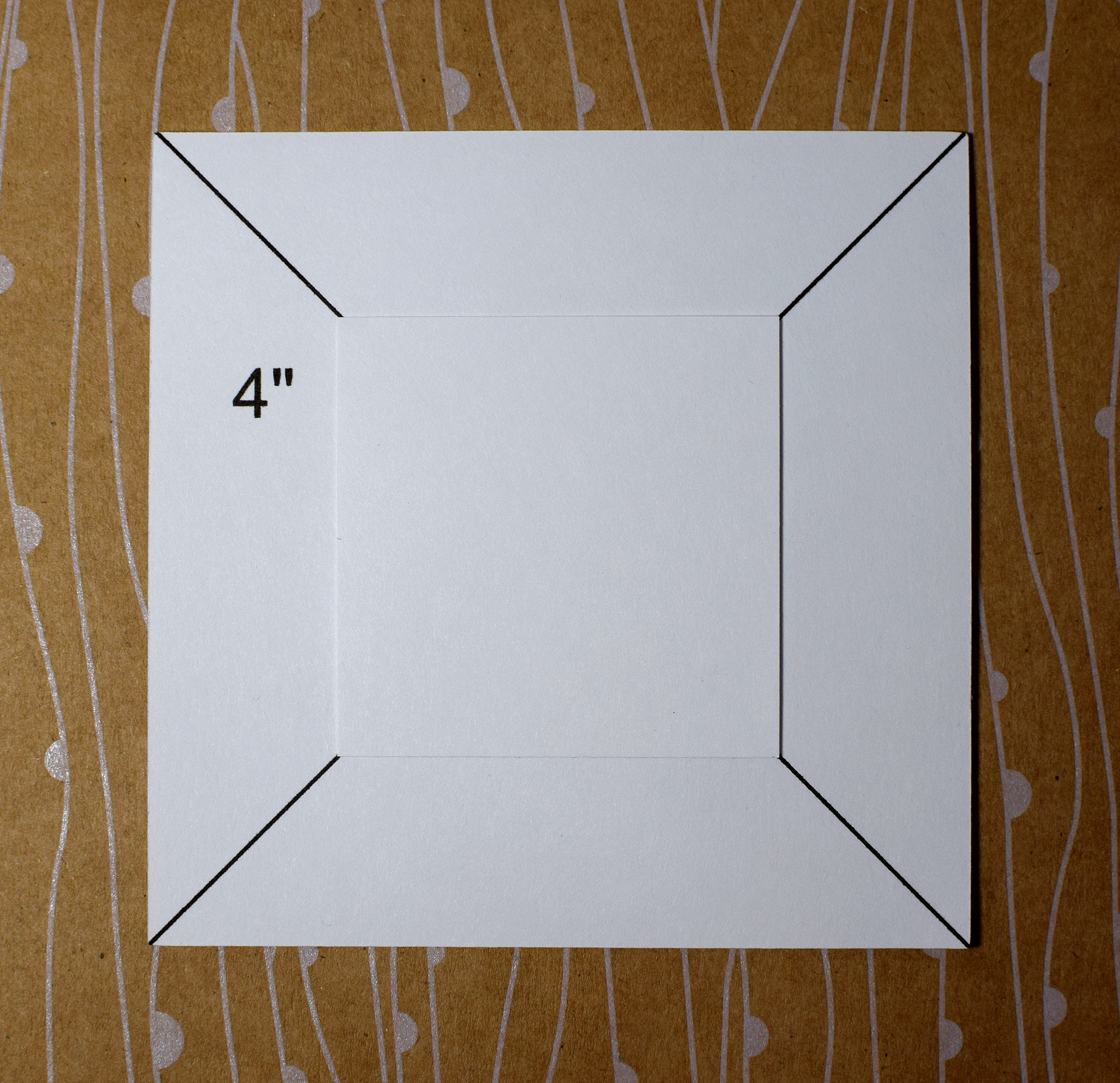 Take the 2 1/8 inch square you need for your project. Center it on the “adapter” scrap. Use the diagonal lines to help you position it; when all 4 corners of your panel touch the diagonal lines, it is centered.