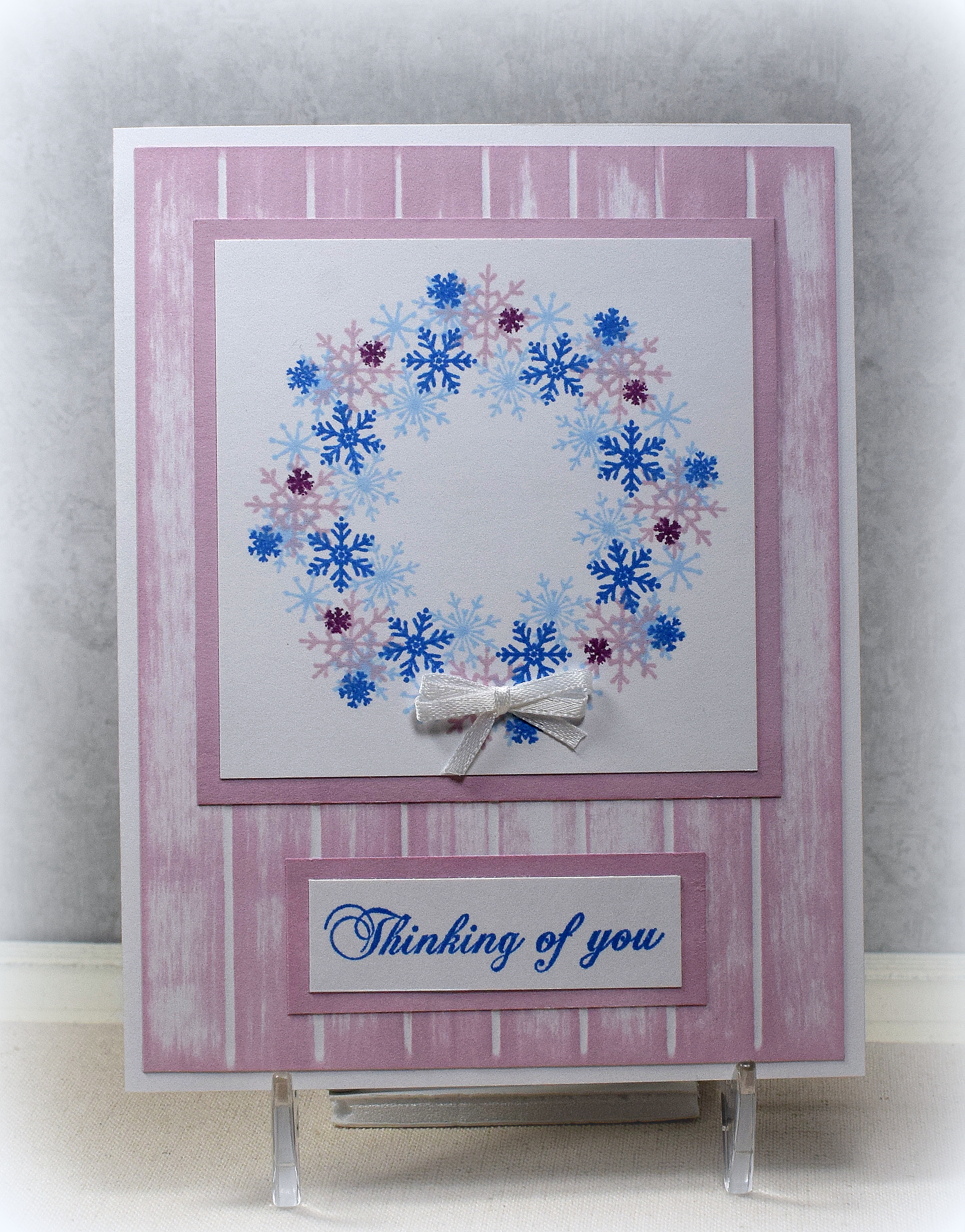 I have several small snowflake stamps and thought it would be fun to create a winter wreath card with them. I don’t usually use pink, but I decided to try something a little different for me, and I like it more than I thought I would! The Gina K Designs wreath builder template helps you create a perfectly positioned and evenly spaced circular pattern with your stamps. A tutorial on how to use this tool can be found HERE (beginning at the 6:40 mark). While it is easier if you use a stamp positioner (like a MISTI), I show you HERE how to use the template without one.