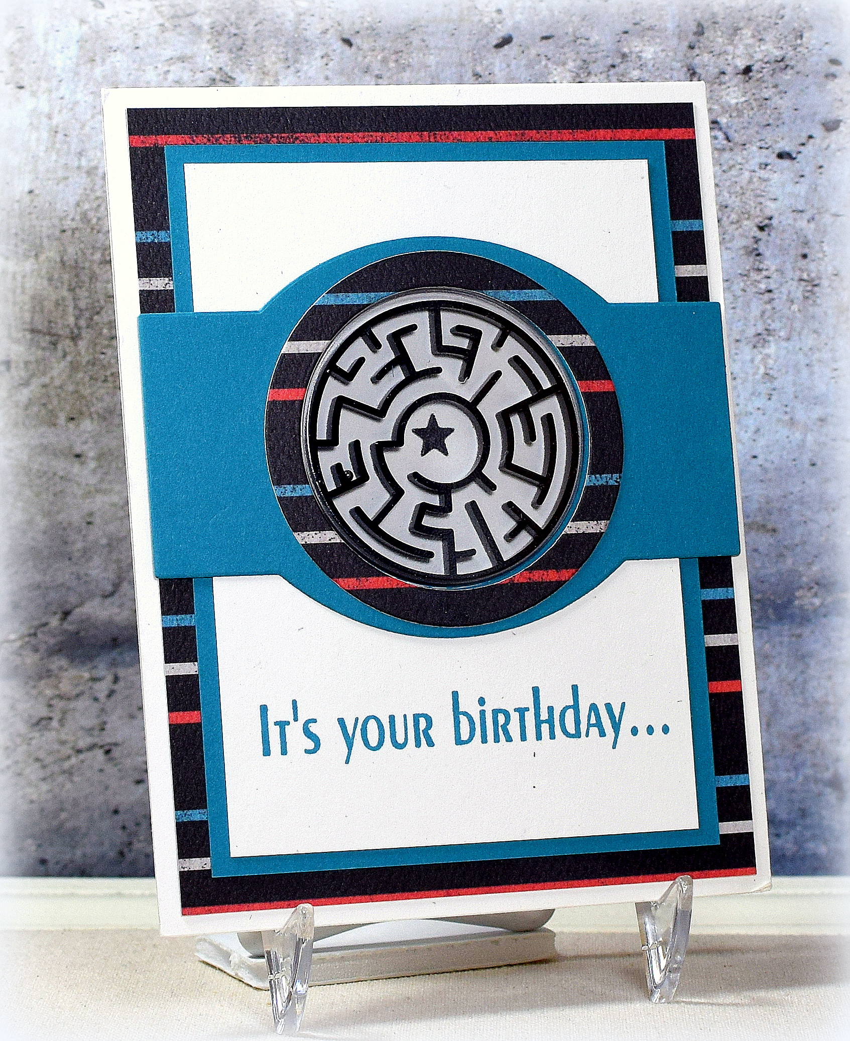 This interactive card is a variation of a shaker card – instead of the usual sequins, confetti, or other small items that are fun to shake, this window pouch contains a plastic maze that is fun to tilt and turn to get the ball to the finish.