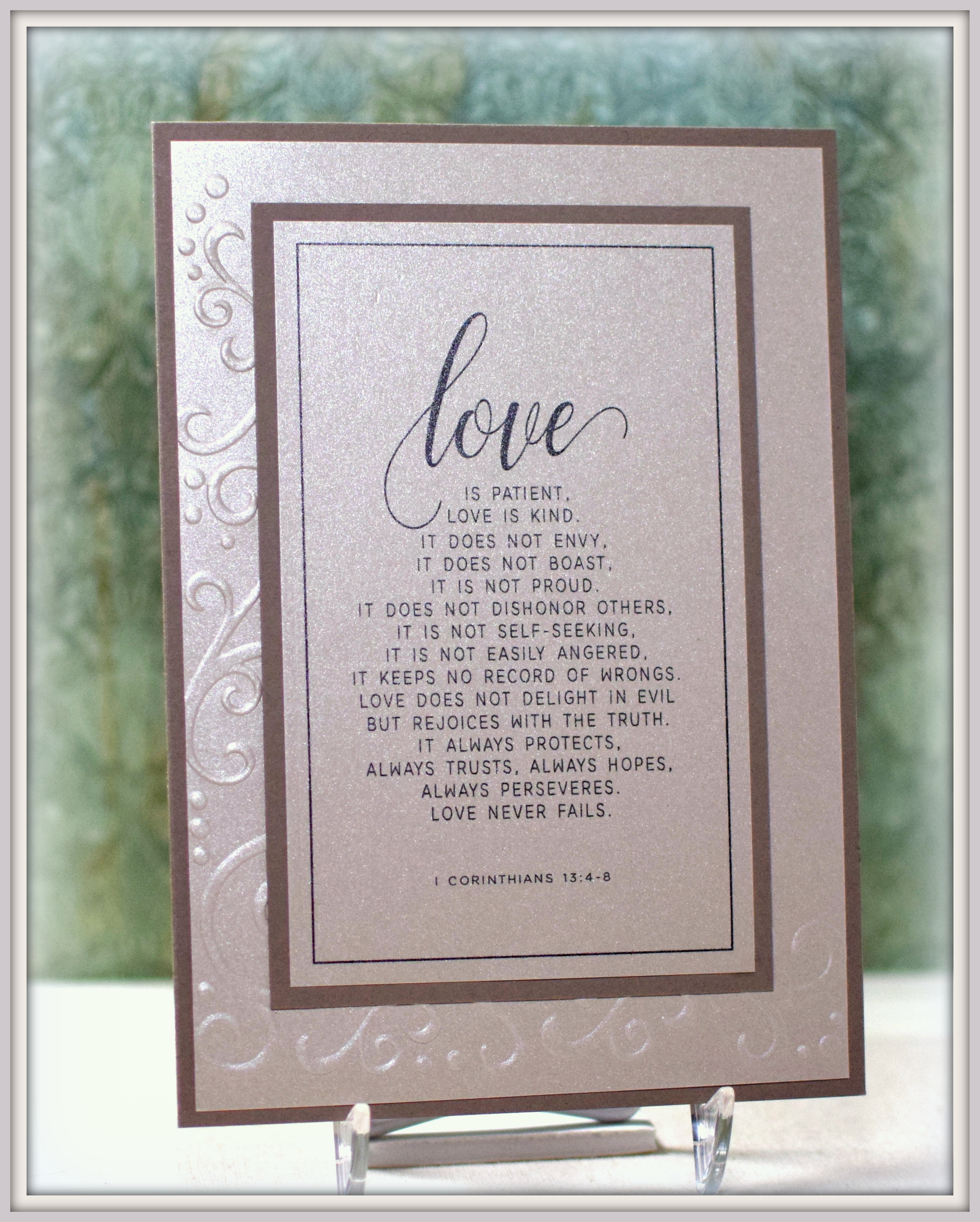 What an elegant card. I love the pearly finish on the card stock. It really makes an impact. That verse is always so perfect for wedding cards.