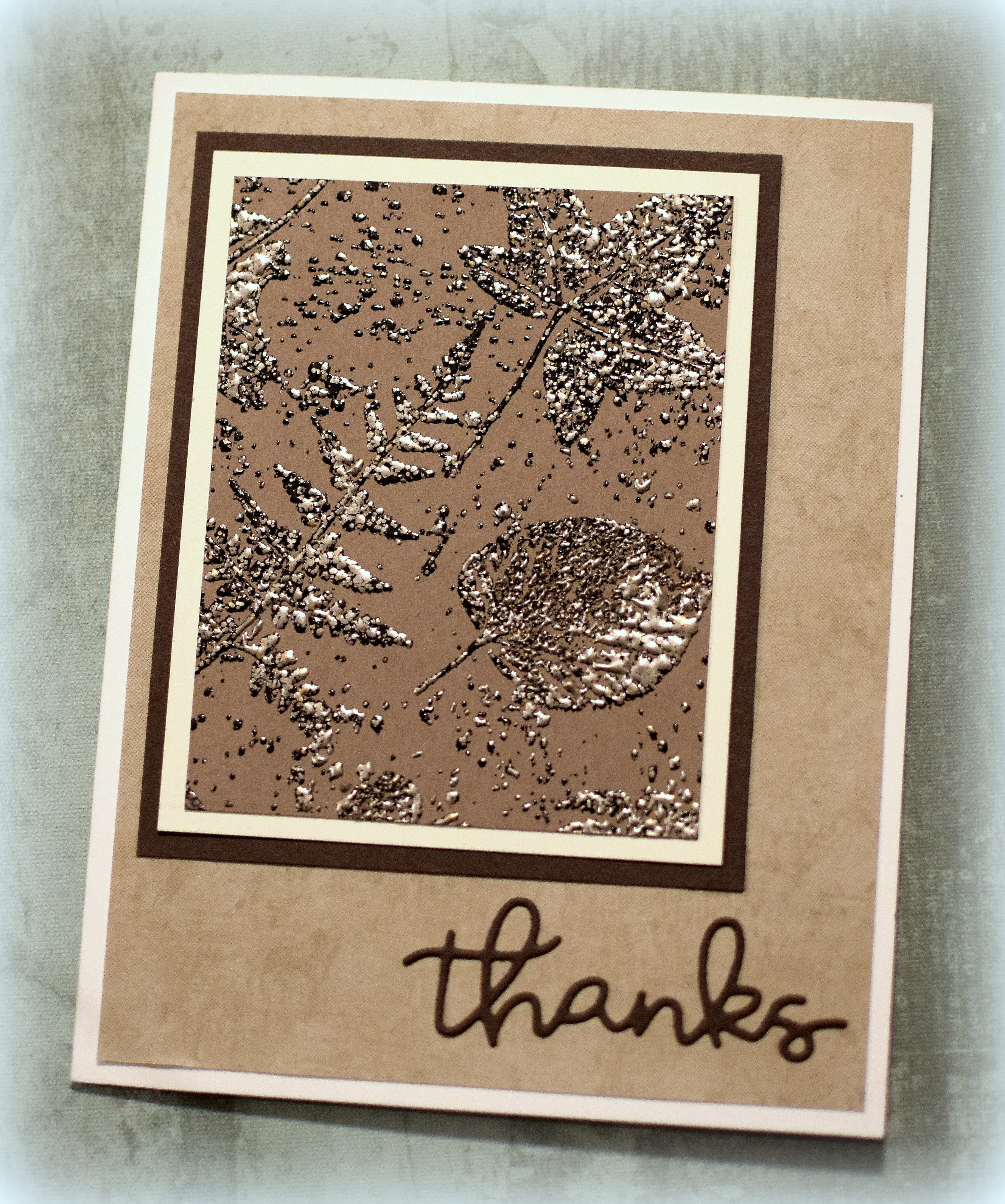 Here’s one more card I made with the “Aged Silver Embossing Enamel” and the “Decor Cling Leaves Rubber Stamp – DCR101” – both by Stampendous. (Almost looks copper at this angle!)