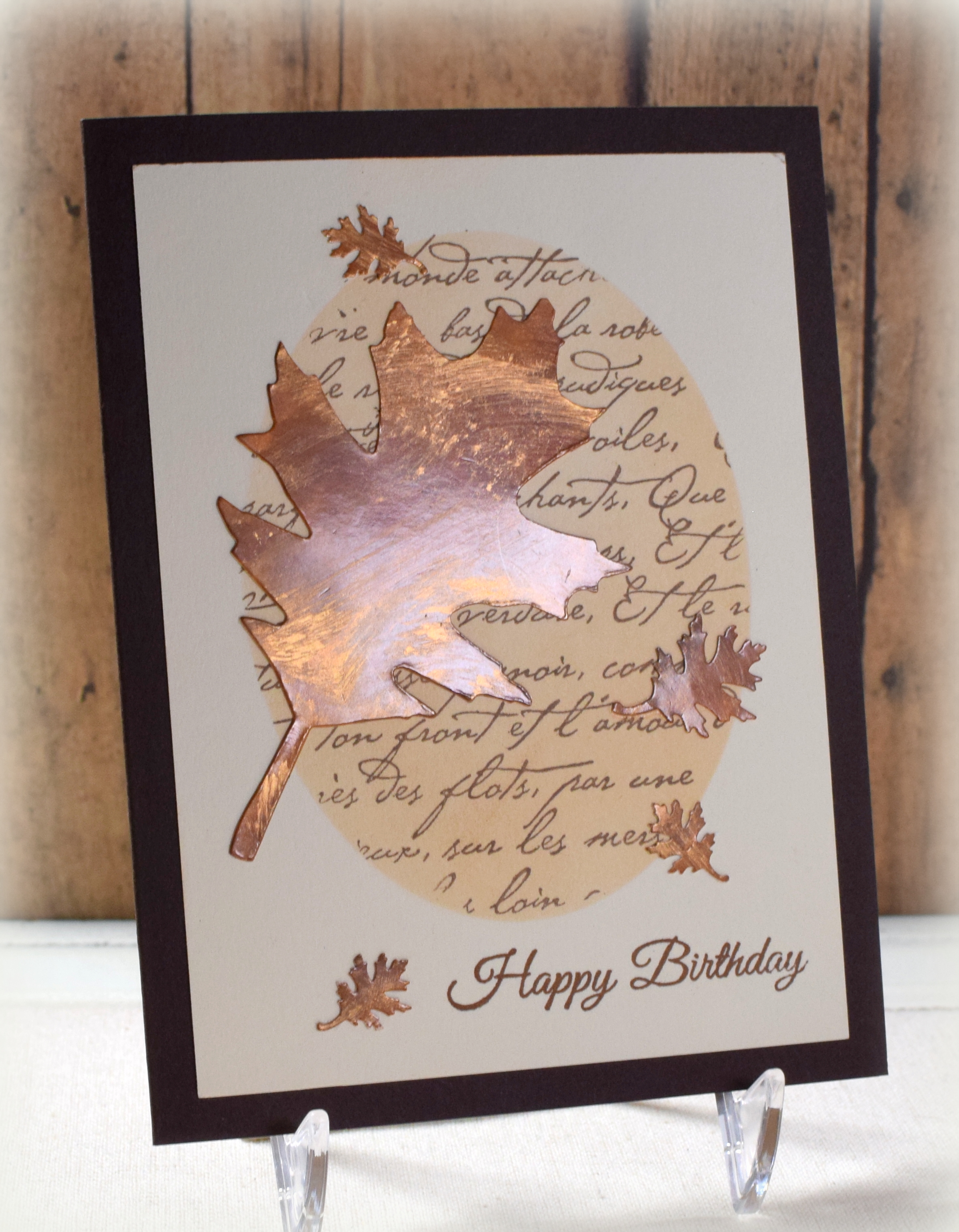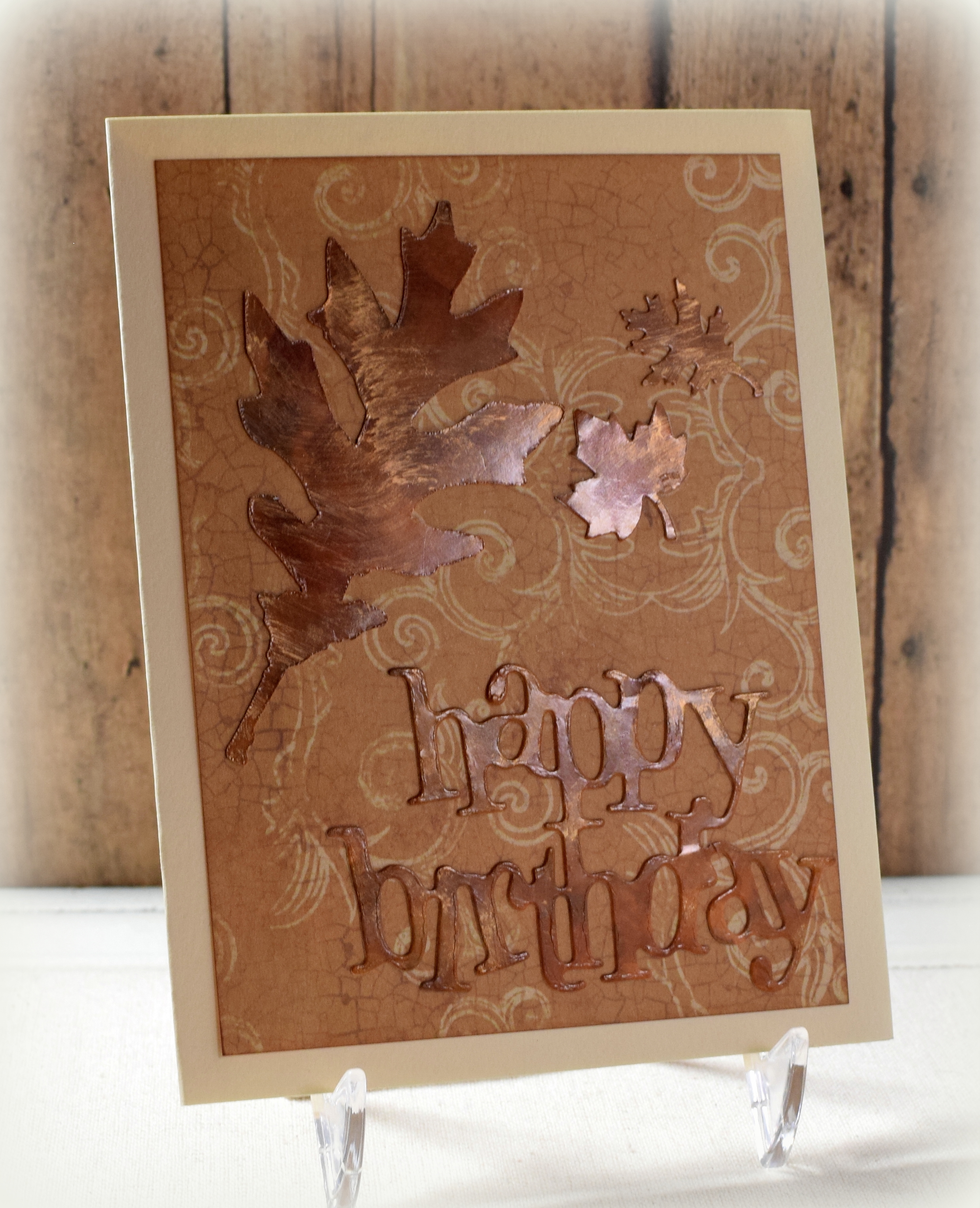 The large leaves were cut with the Tim Holtz Bigz Tattered Leaves die from Sizzix. The smaller dies were made with Recollection punches. Leaf Vignette Squares are by Frantic Stampers . Your Day from Penny Black is a “fun” birthday greeting die, and the Making Happy Happen Collection – Happy Phrases by Sizzix has a variety of greetings and shapes. The stitched frame was unbranded. Card stock used was Recollections Cream and Kraft and Gina K Dark Chocolate and Tranquil Teal. The patterned paper was “Tim Coffey Fall Gold Leaf Scroll” by K&Company, and the burlap was “DCWV Burlap Paper – burlap covered cardstock sheets”