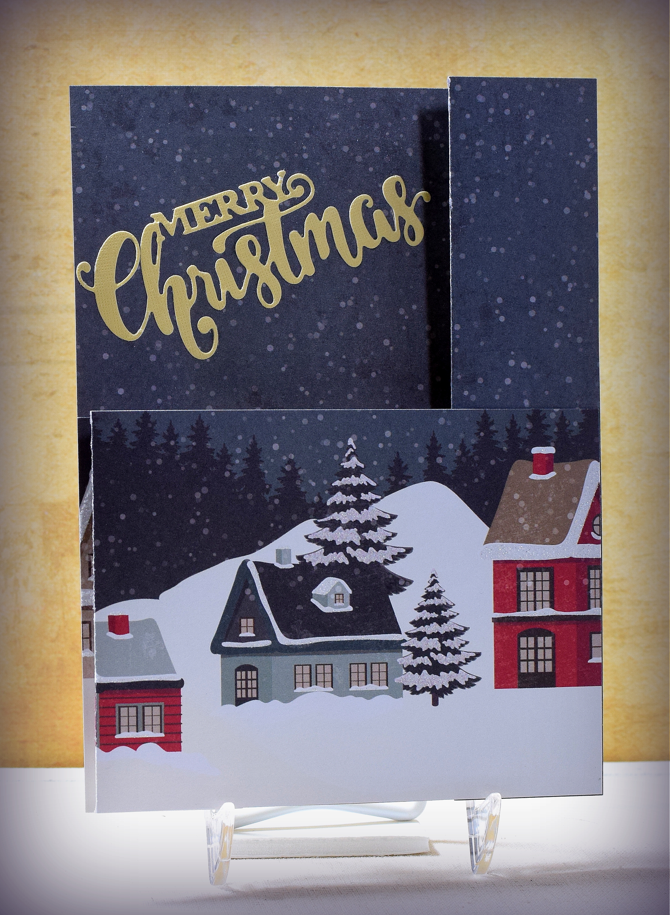 I saw this sheet of patterned paper of a snowy night scene, and I immediately thought it needed Santa flying over head!  I added the moon with Santa in his sleigh to the pop-up mechanism tucked inside the 5″ x 7″ double z-fold card base to create a wiper card.  When the card is “opened” Santa appears with the moon.