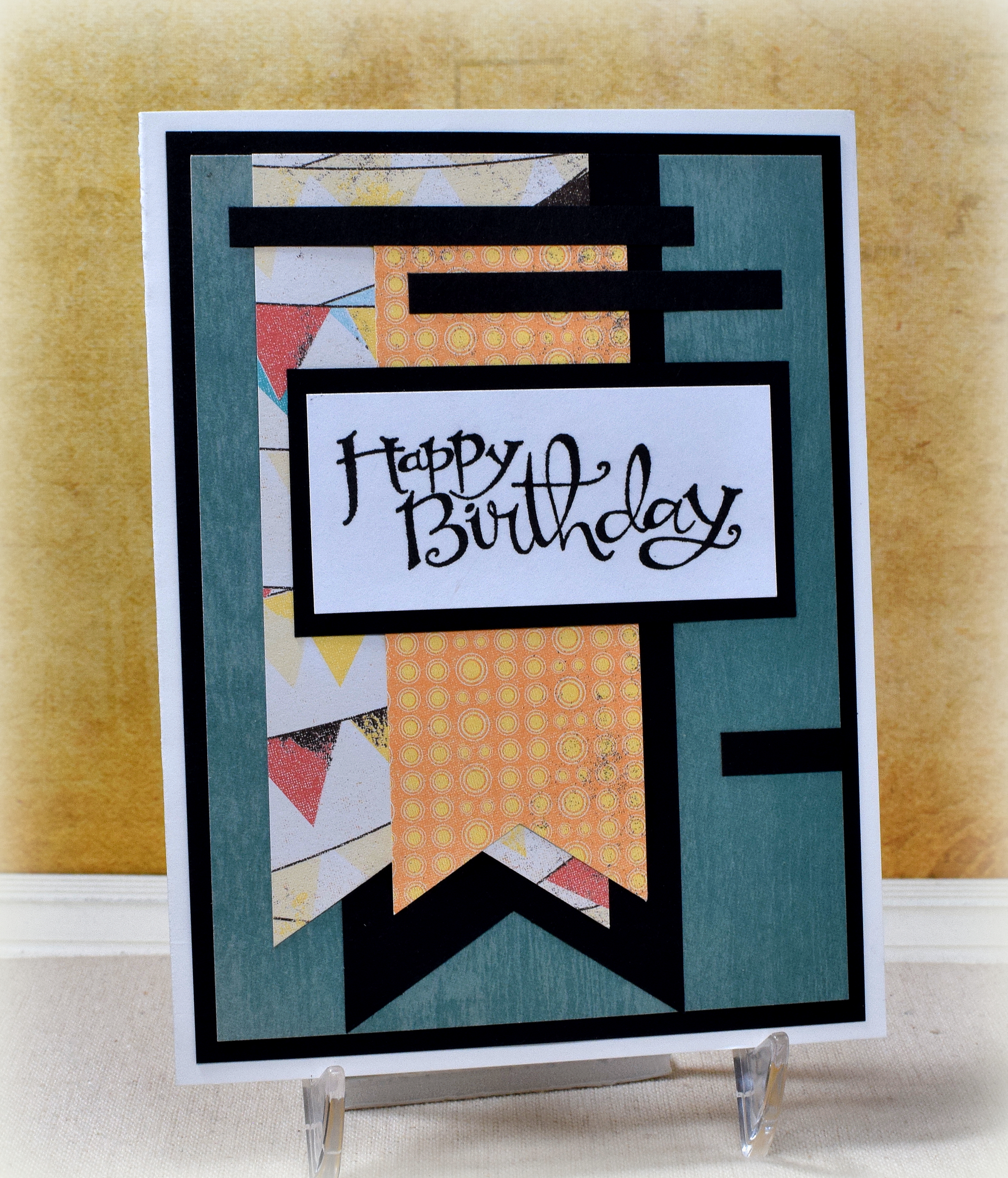 Great sentiment font – I’m like you I enjoy different font styles. Love the graphic design here. All the different papers and the layout make for a pleasing masculine style (to me) card.