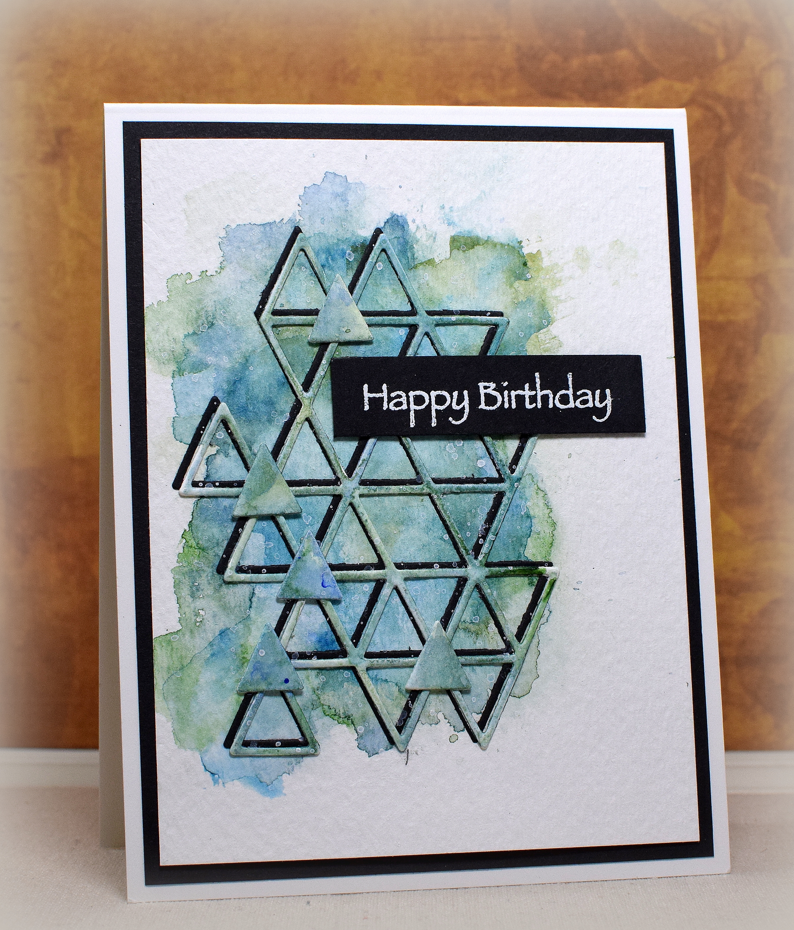 I loved the card samples Debbie Hughes created in the “Watercolor Masking” class from the Online Card Class – Spring Card Camp 2020 course which included the “Triangle Elements” die from Simon Says Stamp. She used the die cut as a mask while water coloring her background panel and then added the painted mask to a second card.