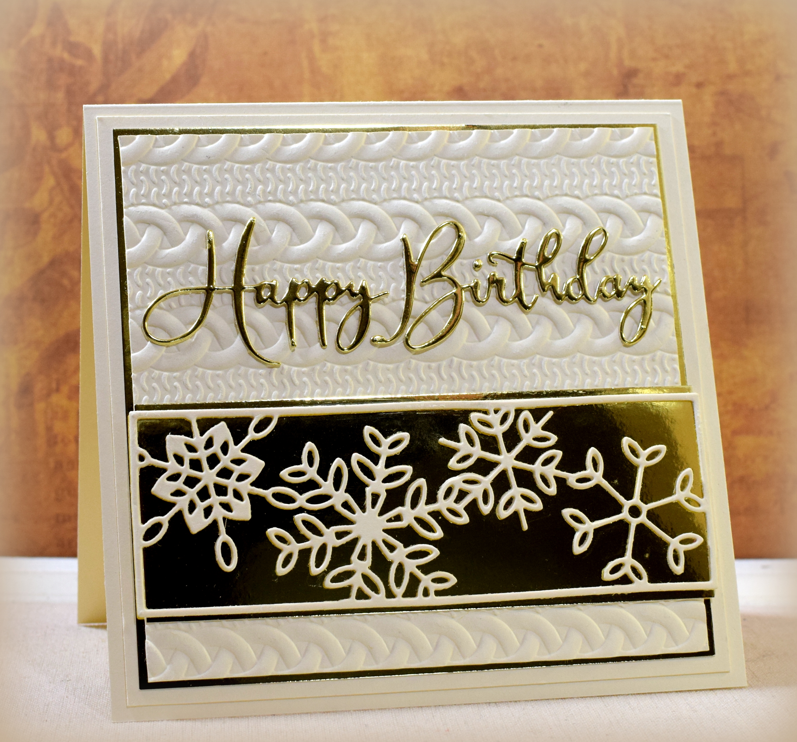 The “Dancing Snowflake Tile” die is from Poppy Stamps, and the “Happy Birthday Friendship Script” die is from Memory Box. These were cut twice and layered to make the die cuts thicker. I used Metallic Gold card stock from Gift Boutique and heavy weight cream card stock by Recollections.