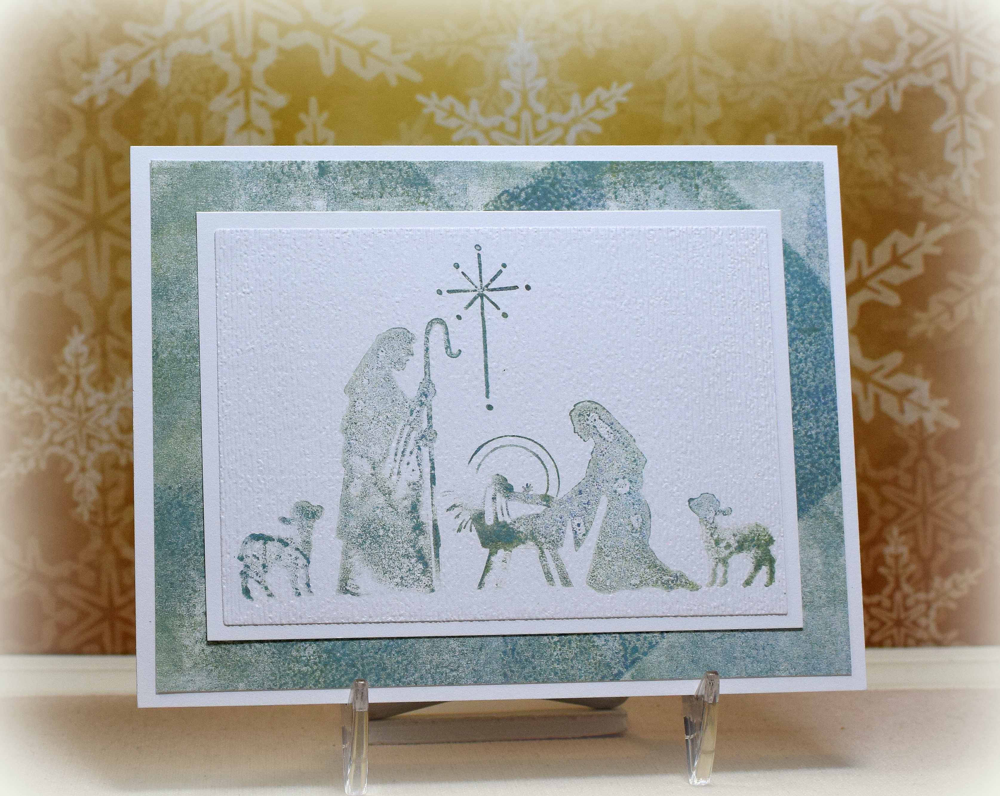 I reinked and blended the gel plate and cleaned my brayer off onto another piece of card stock that I used for the background (mat) on this nativity card design. I then inked the stamp from the gel plate and stamped the image onto the card stock.