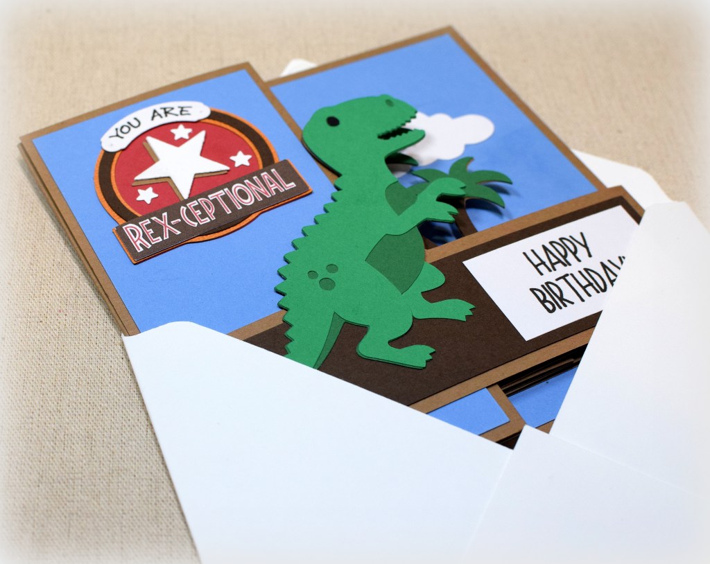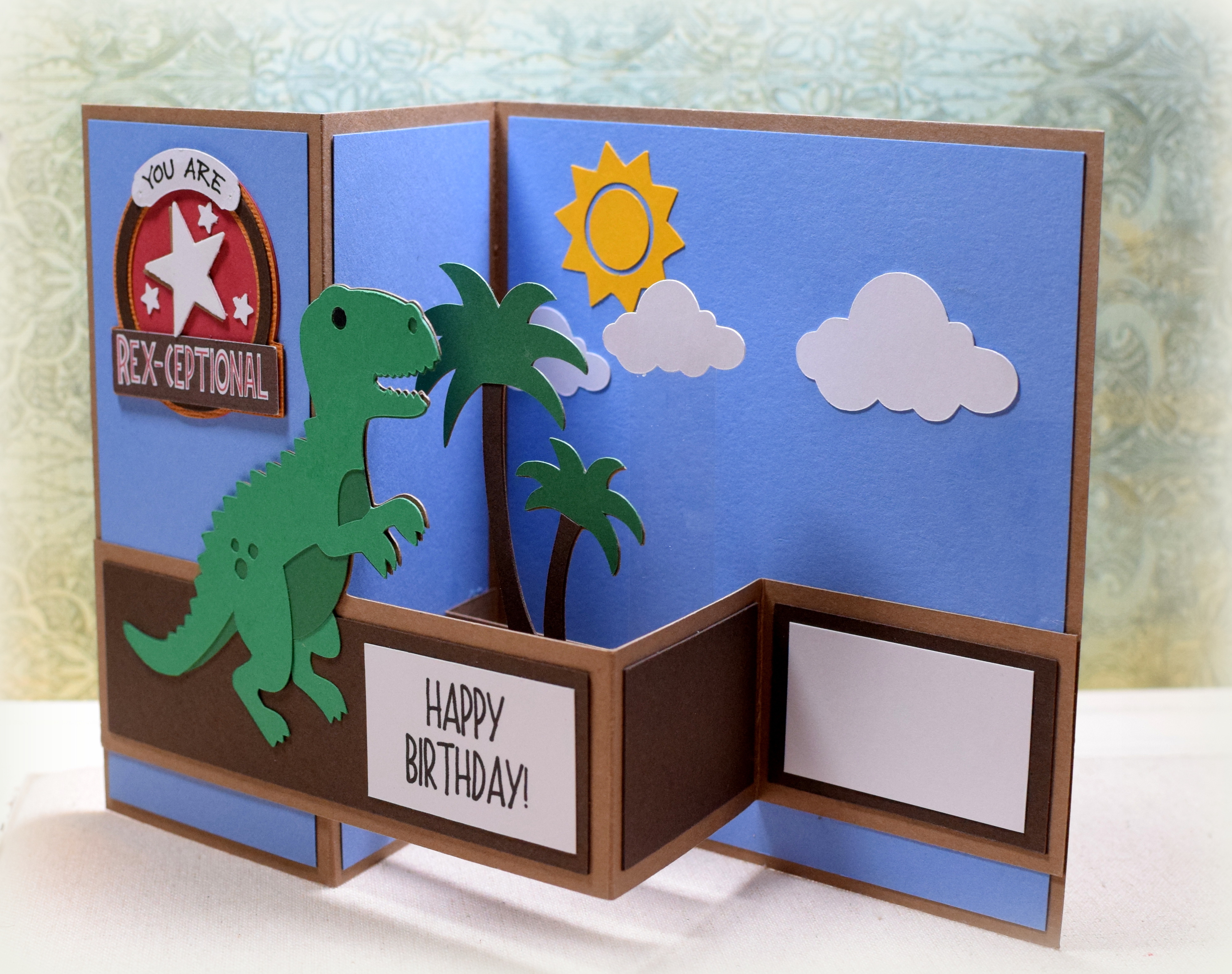 This double z-fold card was made with elements from 3 different Silhouette files and a lot of tweaking to get it the way I wanted it. The general card design started with Lori Whitlock’s “Pop Up Box Card – Dinosaur” (design ID 143162). Her card had a brontosaurus and a different dino pun. I came across “You Are Rex-ceptional” and liked that sentiment better, but it didn’t go with the brontosaurus. So I used the t-rex from Studio Ilustrado’s “T-Rex Dinosaur Card” (design ID 135707) instead.