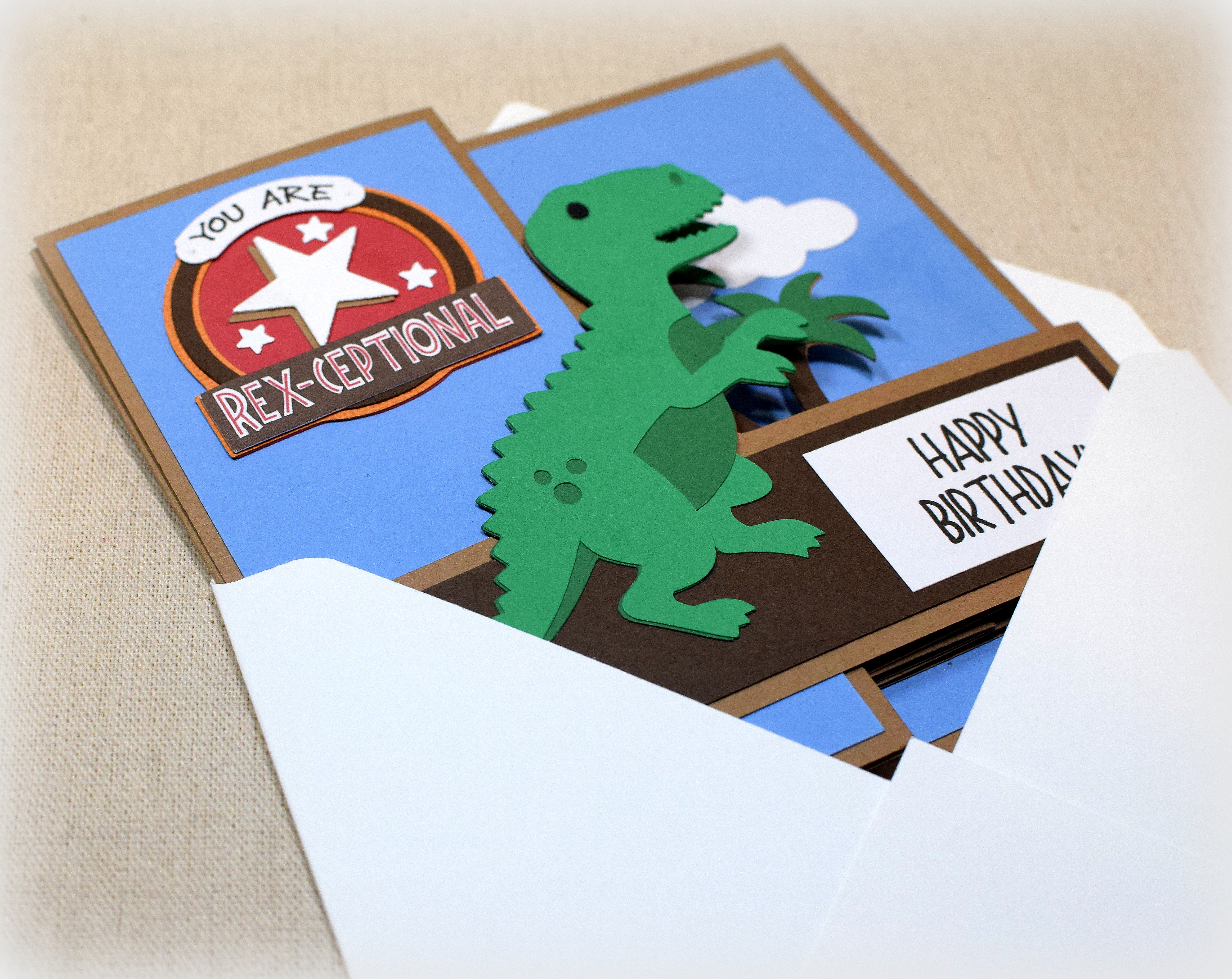 The Rex-Ceptional emblem was actually designed as a whole card front called “Card Dino T Rex Ceptional 6×6” (design ID 445052) by Heartsewn. After I shrunk down all the pieces to fit on my card, the letters were too small to cut individually so I created a print and cut file for that strip instead. (I also substituted the t-rex skull that was included in their design with stars.)