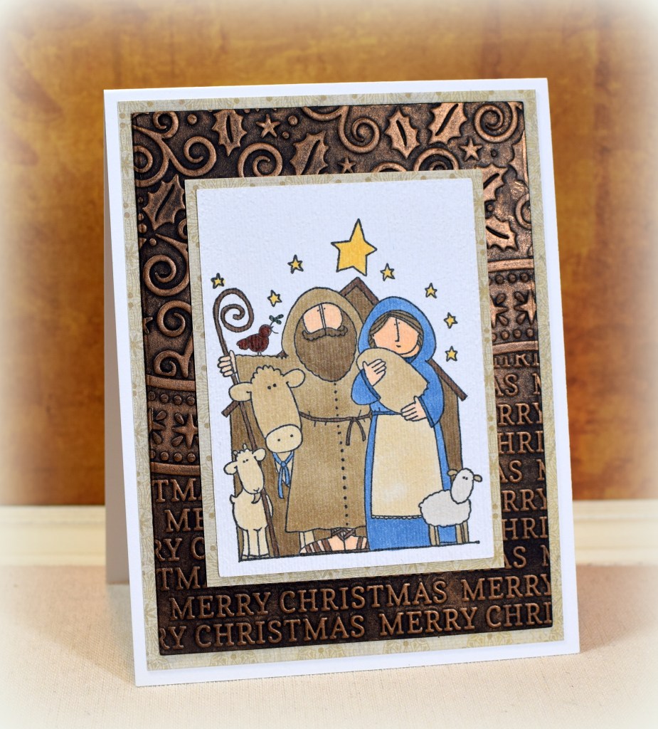The focal stamp is called “Country Nativity” by Uptown Rubber Stamps (no longer available?). The image was stamped with Memento Tuxedo Black ink, was colored with Copic markers (E00, E18, E40, E41, E42, E43, E44, E47, G29, Y23, B95, and B97), and was then embossed with the “Subtle” embossing folder from Stampin’ Up (retired). The inside stamp is called “Holiday wish to bring cheer greeting” by DRS Designs.